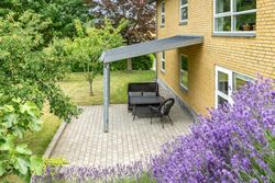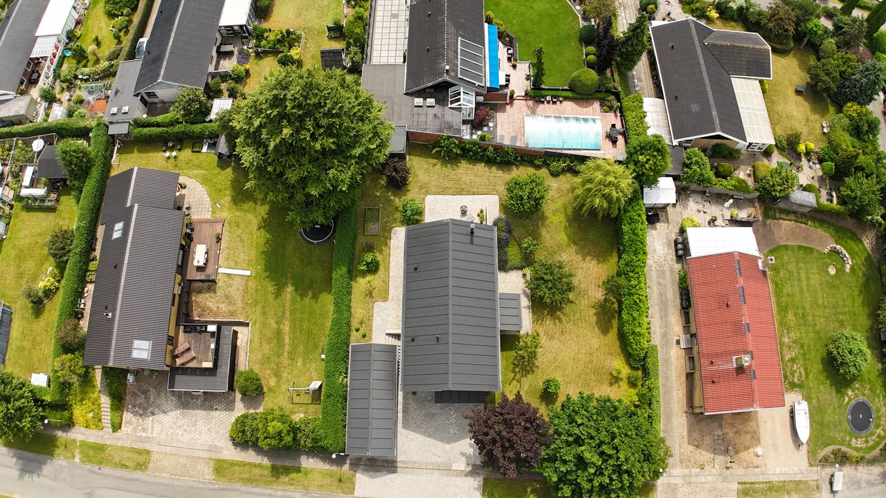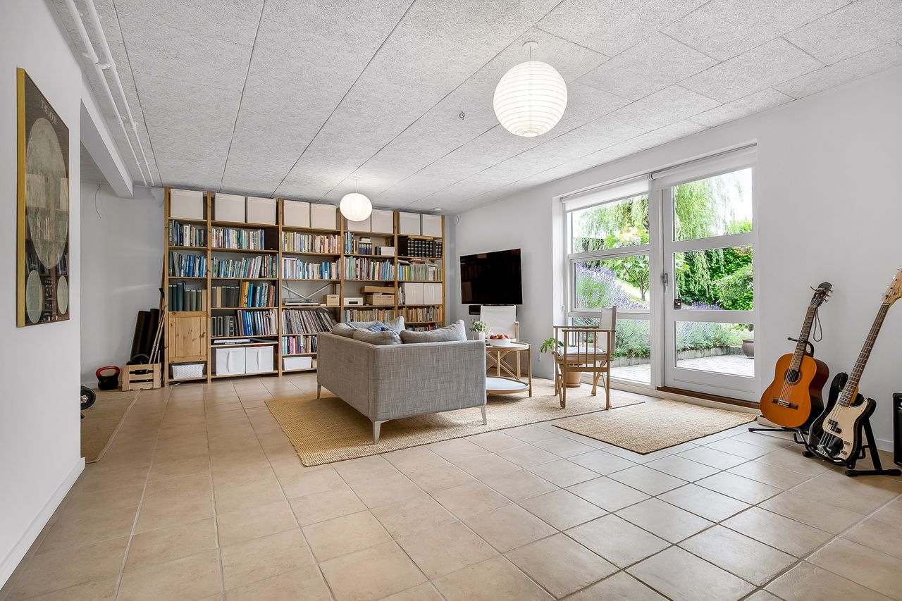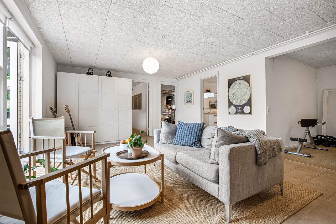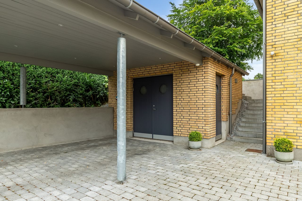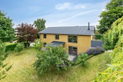 Da husets fodaftryk alene udgør 117m2, vil du opleve at grundens samlede areal på 953m2 virkelig kommer til sin ret. Her er flotte træer og bede og så skaber niveau forskydningerne en helt særlig stemning.