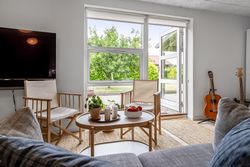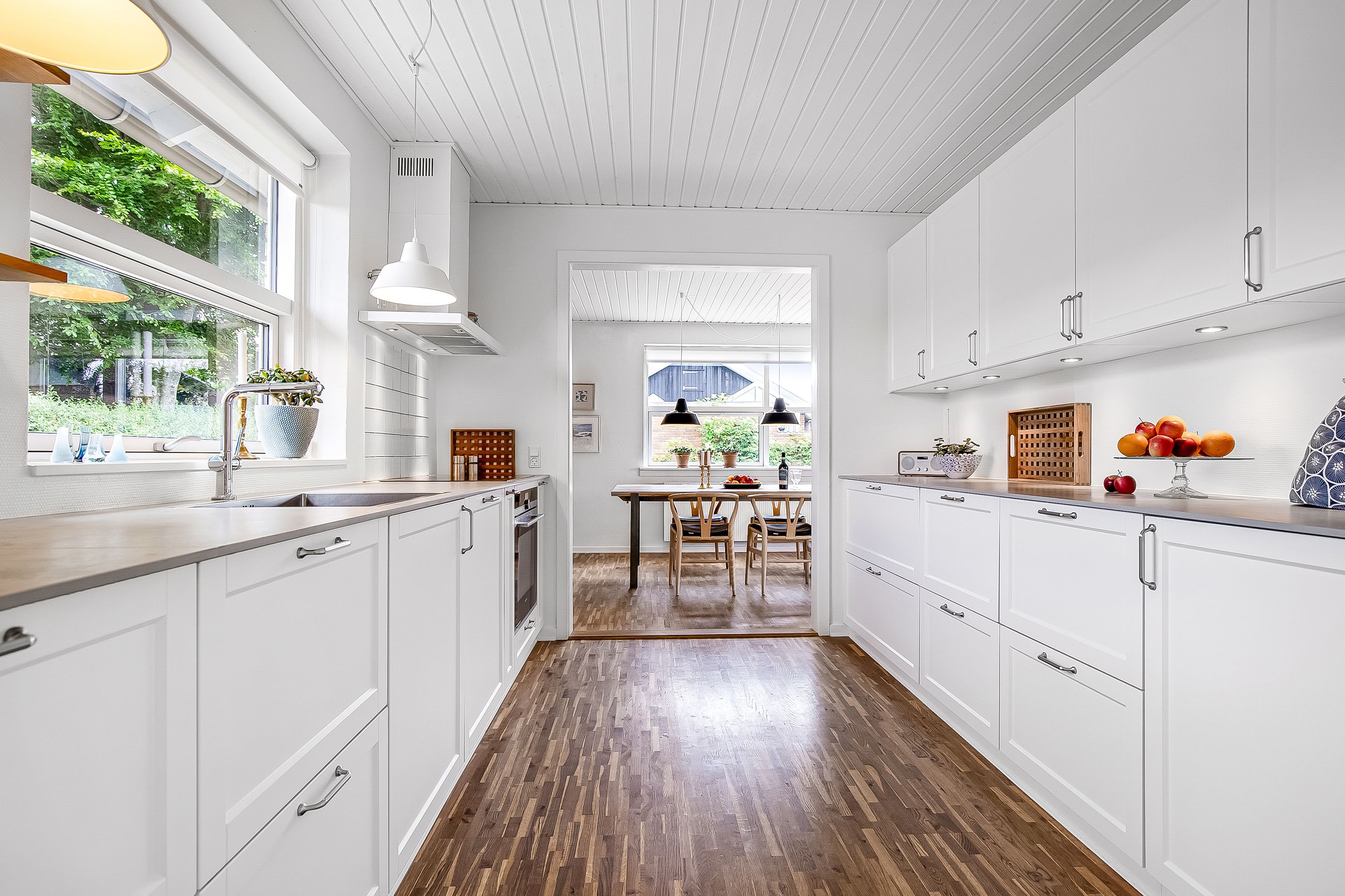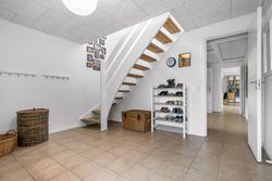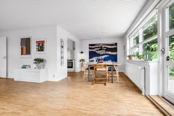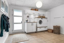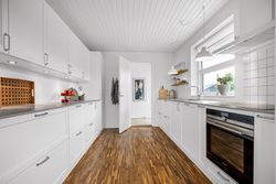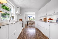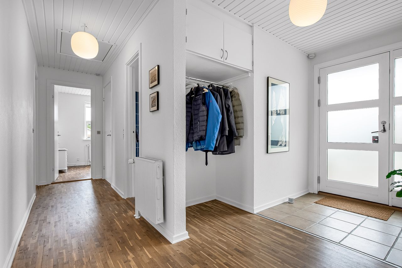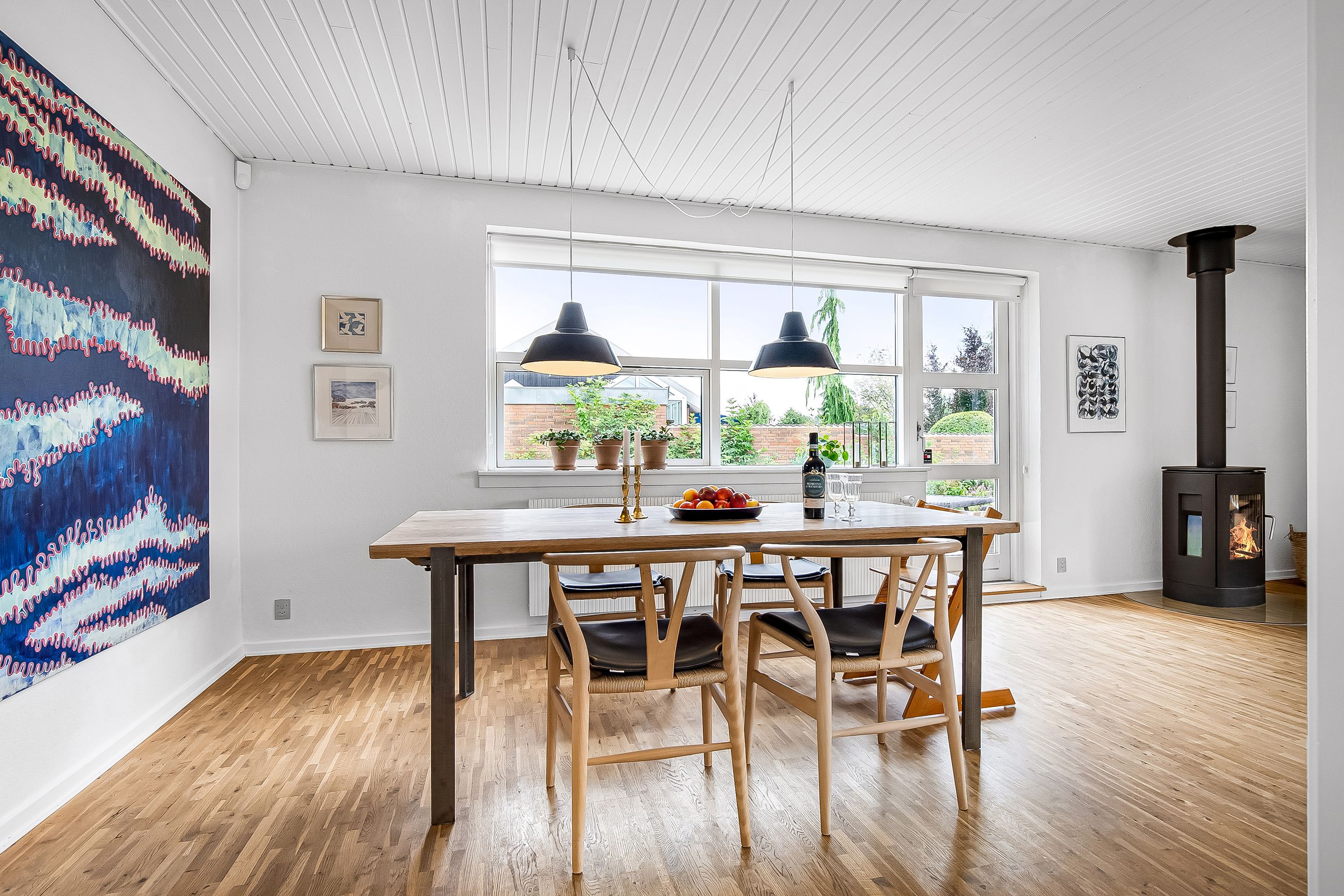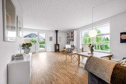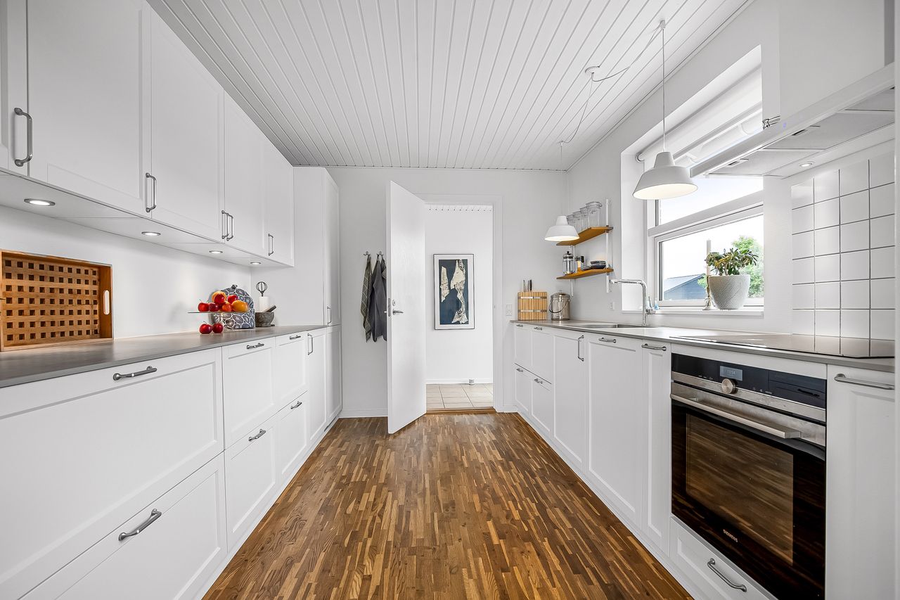 Lys og rummelig entre med garderobe. Lækkert køkken fra 2019 i åben forbindelse med den store vinkelstue, som byder på brændeovn og flot udsigt over området. Fra stuen er der udgang til sydvendt terrasse.