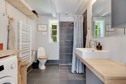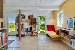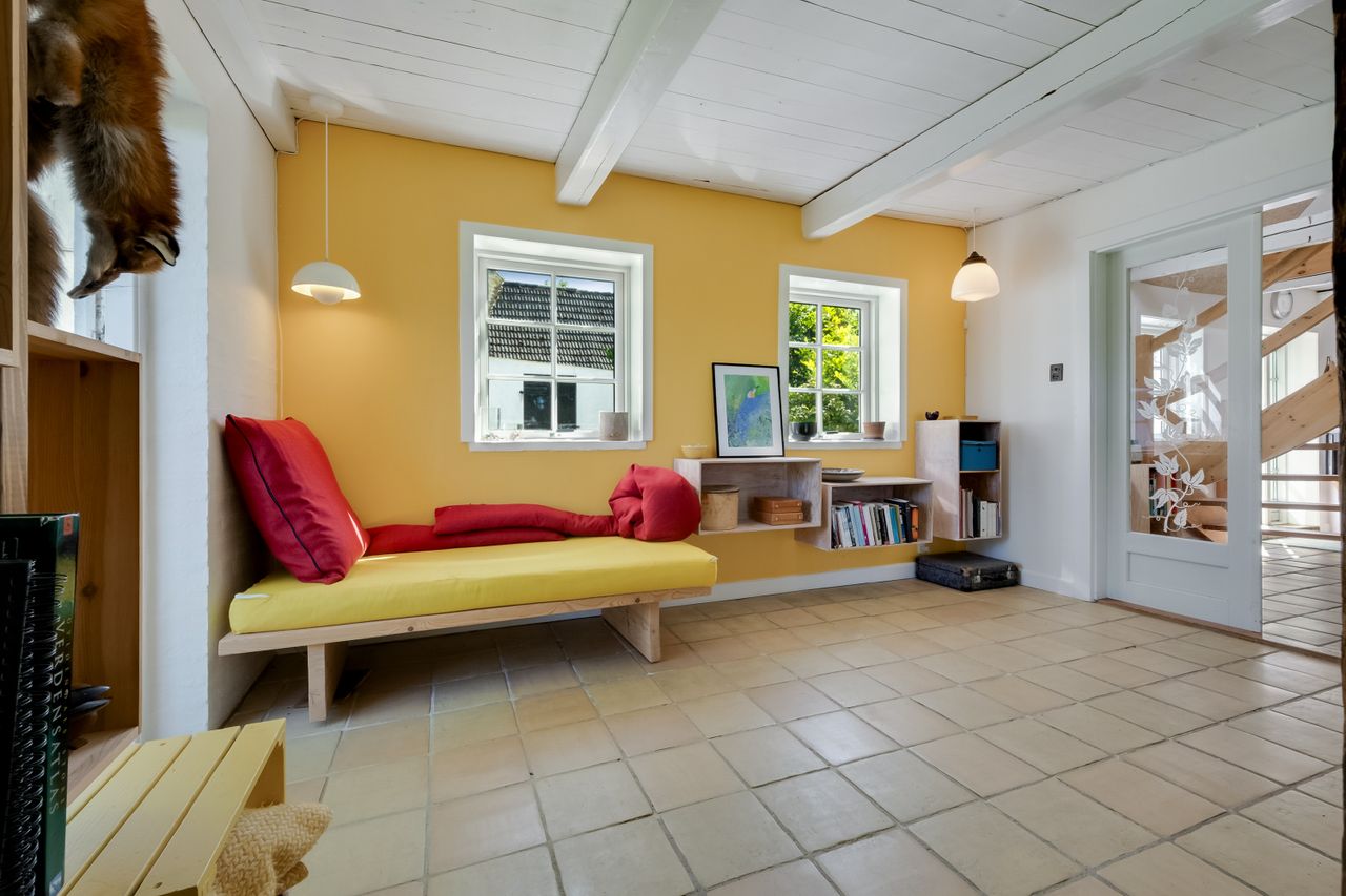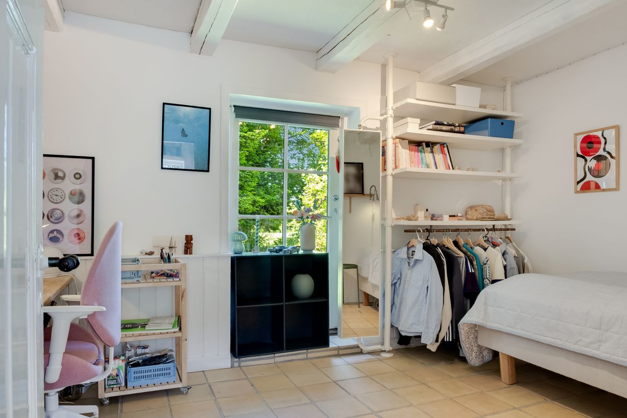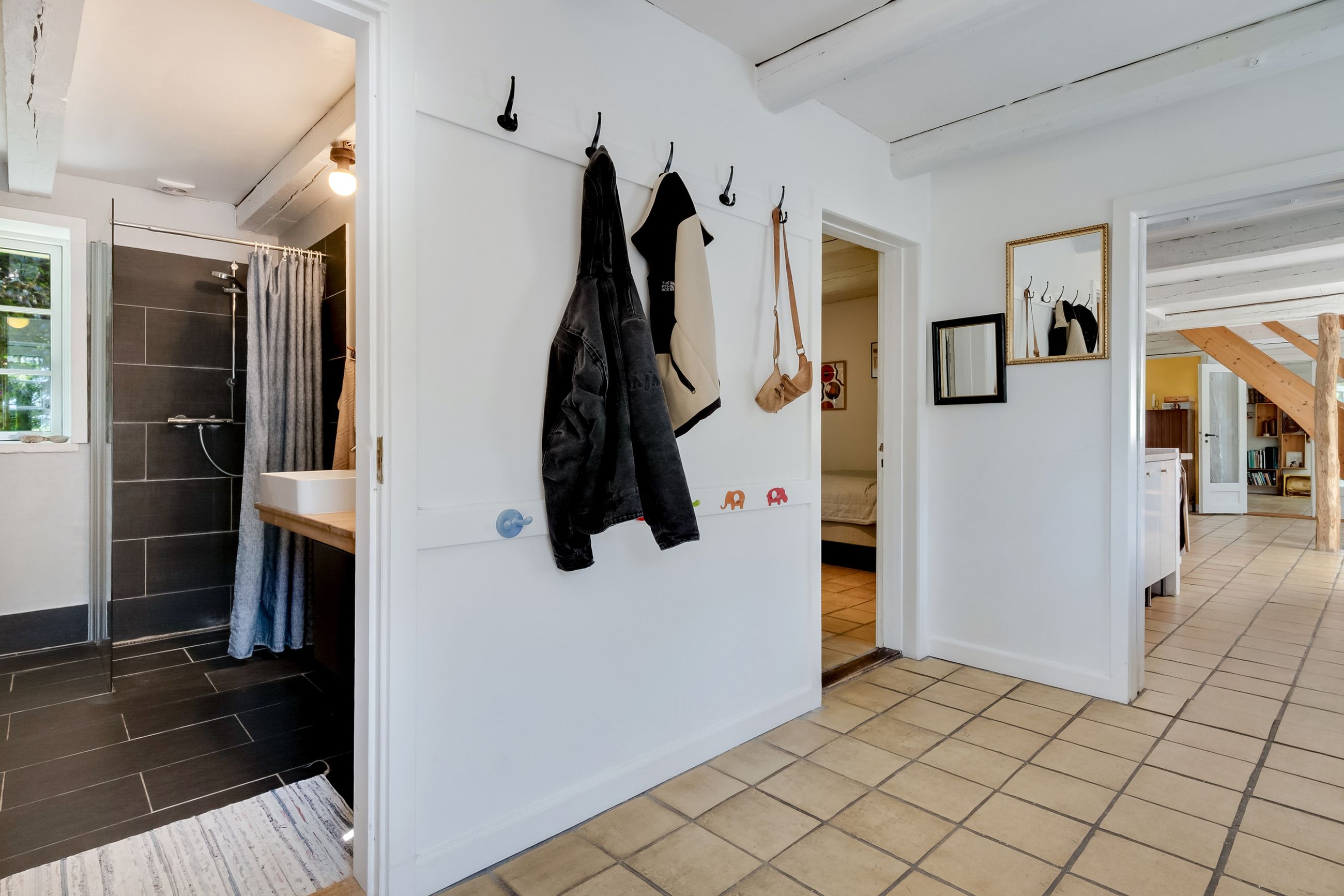 Du træder ind i husets entré og bliver mødt af et fint kig gennem hele boligen. Huset emmer af sjæl, historie og charme, men er moderniseret med respekt for det oprindelige. Det første rum, du møder, er det stilrene badeværelse med grå klinker og bruseniche med glasafskærmning. Ved siden af ligger et værelse med egen udgang til haven.