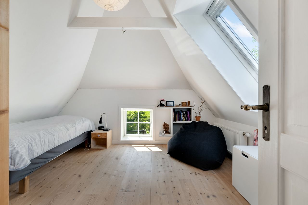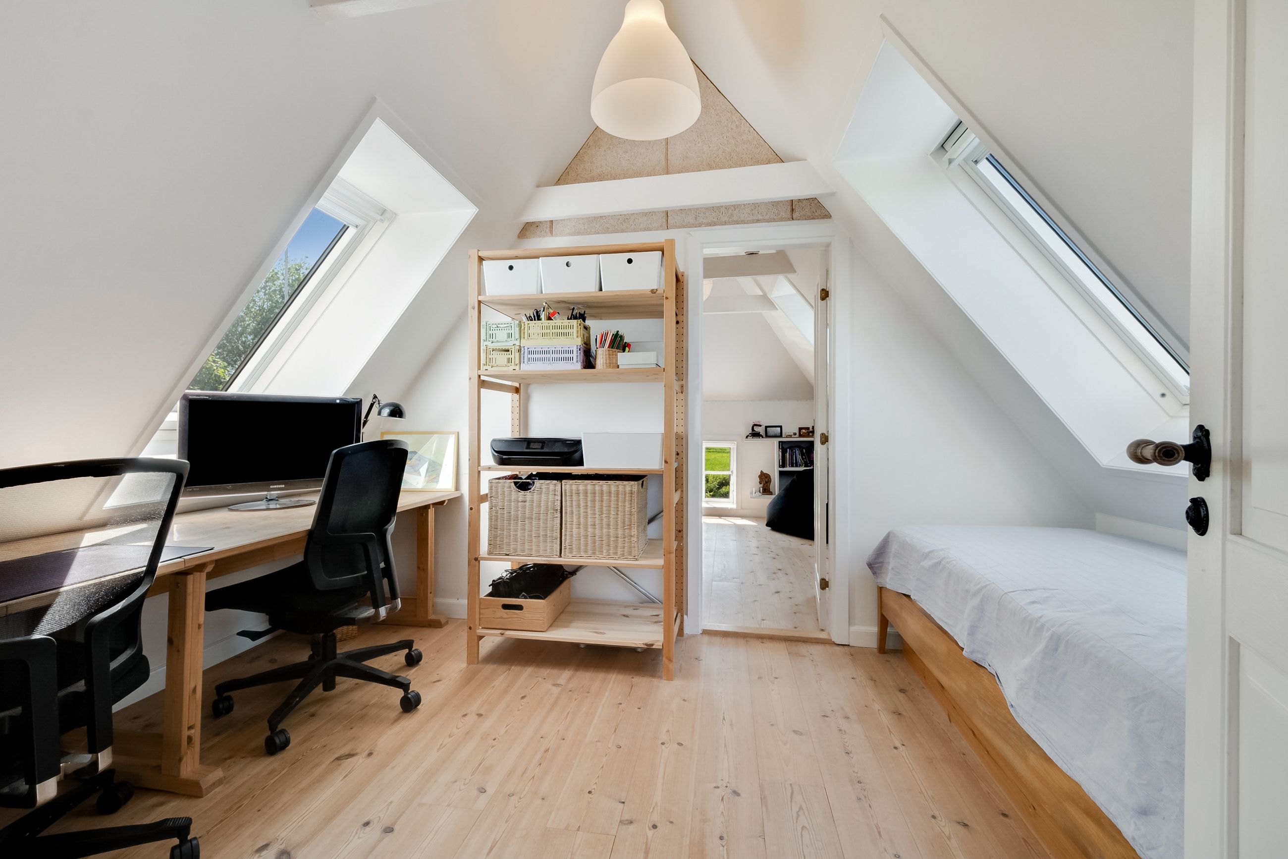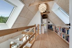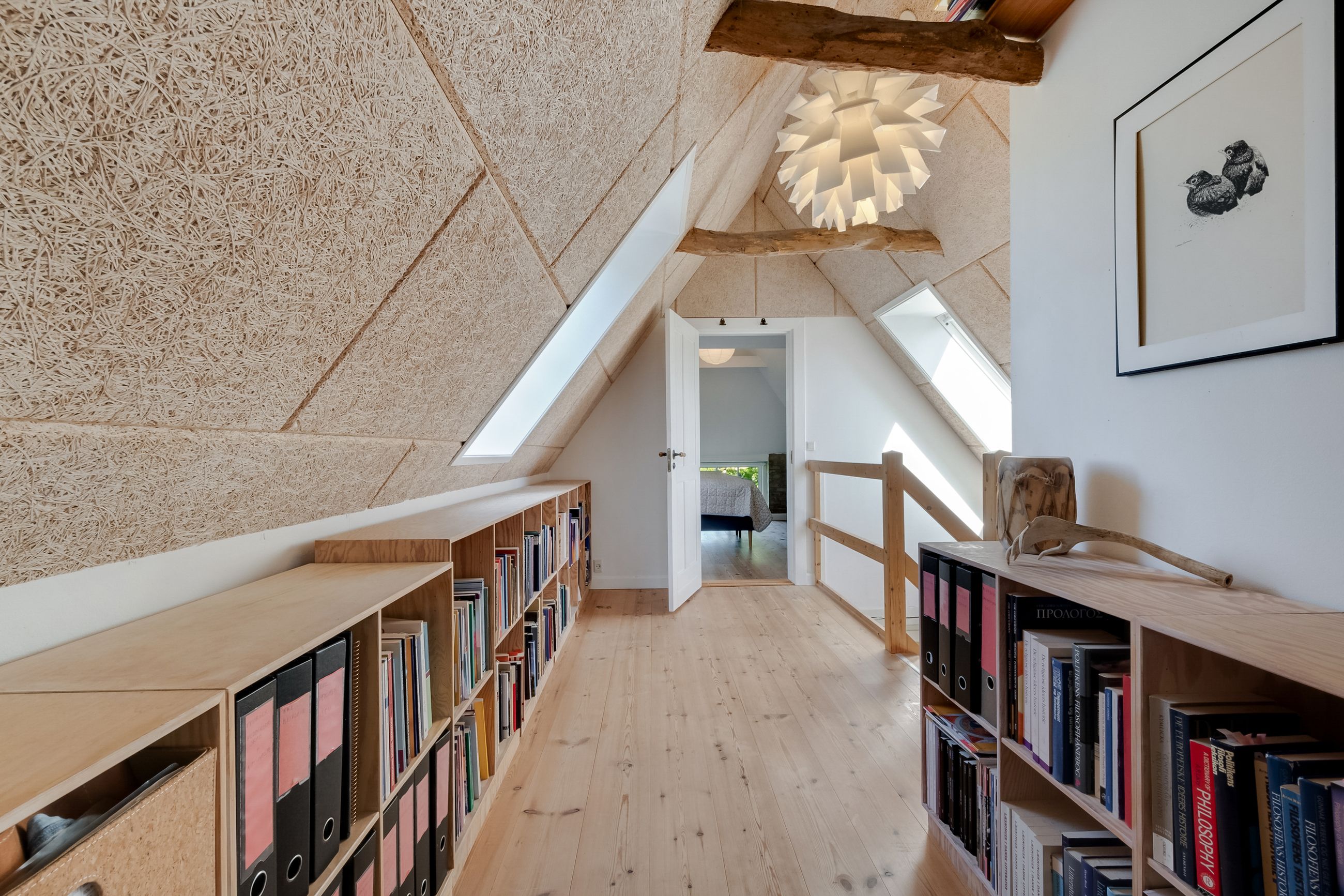 Trappen i alrummet fører op til førstesal, hvor loftet er ført til kip, og fritlagte bjælker sætter stemningen. Her finder du et rummeligt repos, et mindre kvistværelse og tre værelser – to store og et mindre gennemgangsværelse, oplagt som kontor eller legerum. Hele etagen er bygget med gibsvægge, så planløsningen nemt kan tilpasses.