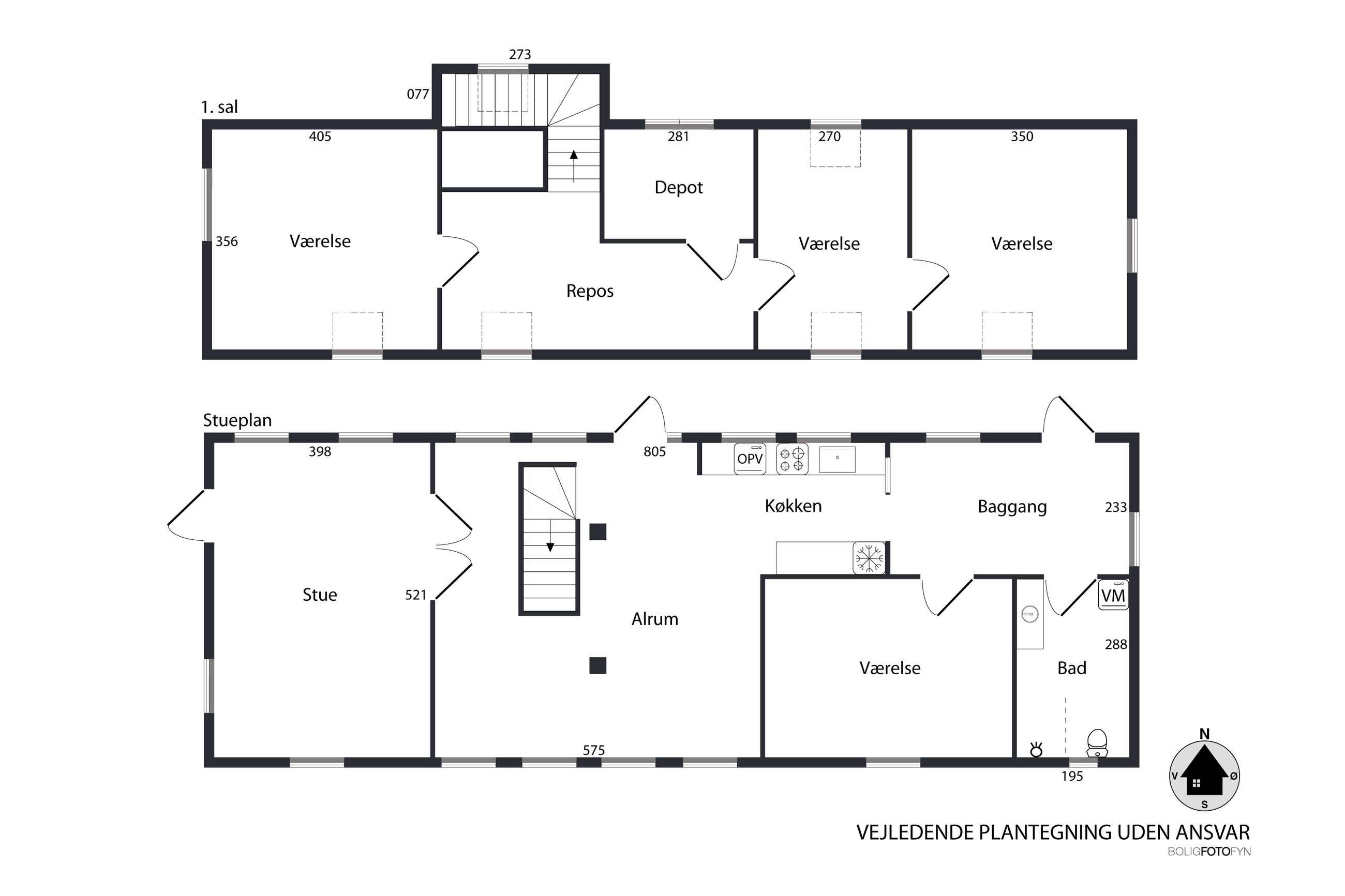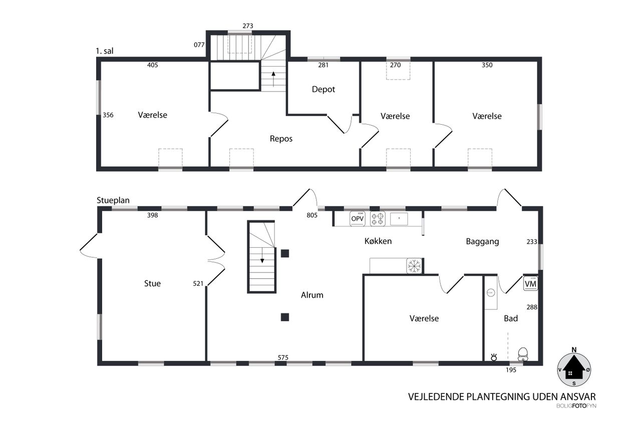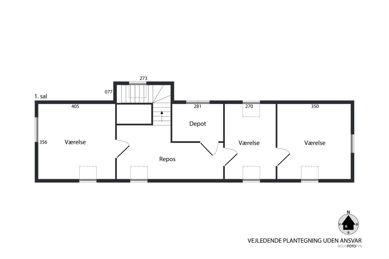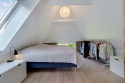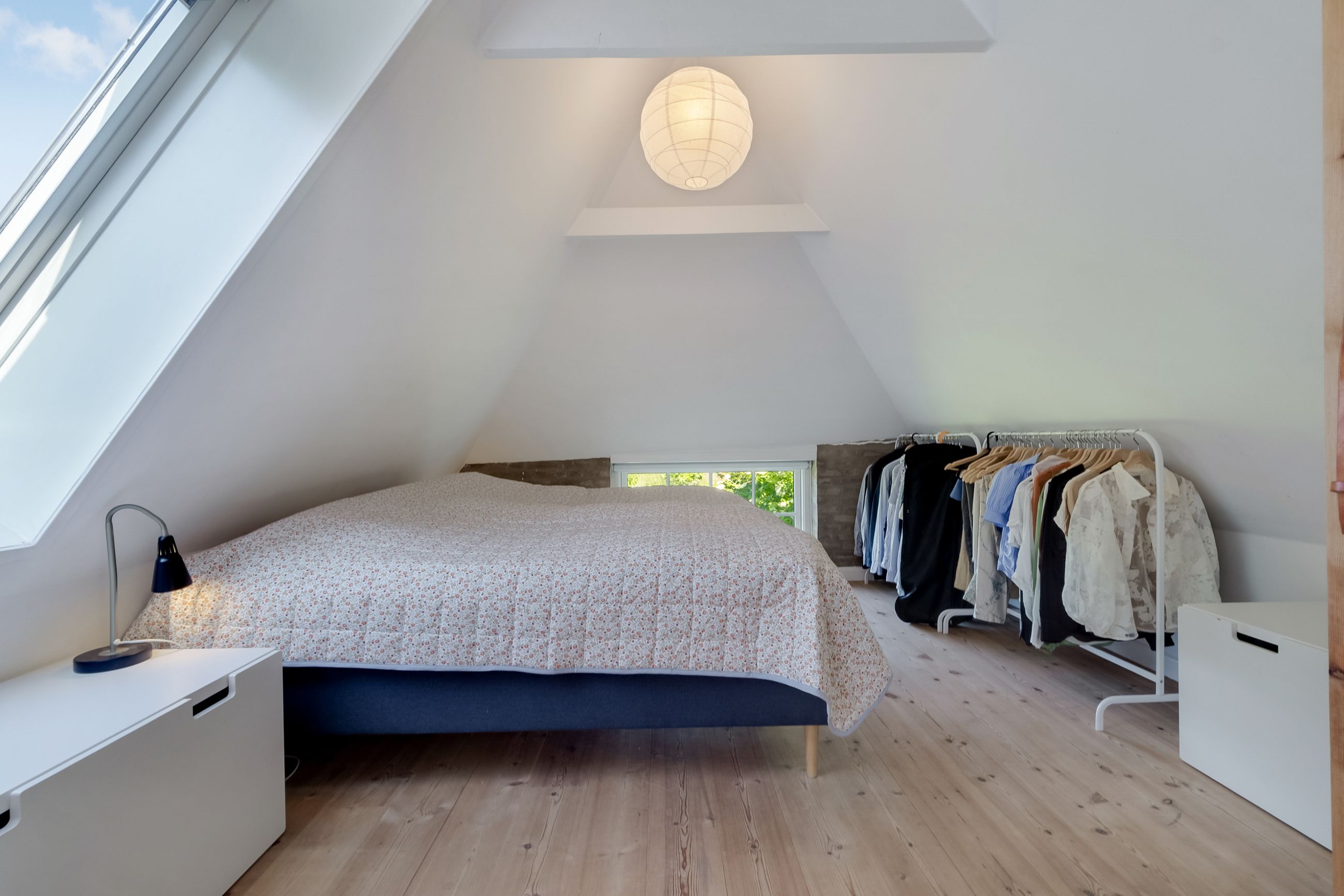 Trappen i alrummet fører op til førstesal, hvor loftet er ført til kip, og fritlagte bjælker sætter stemningen. Her finder du et rummeligt repos, et mindre kvistværelse og tre værelser – to store og et mindre gennemgangsværelse, oplagt som kontor eller legerum. Hele etagen er bygget med gibsvægge, så planløsningen nemt kan tilpasses.