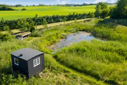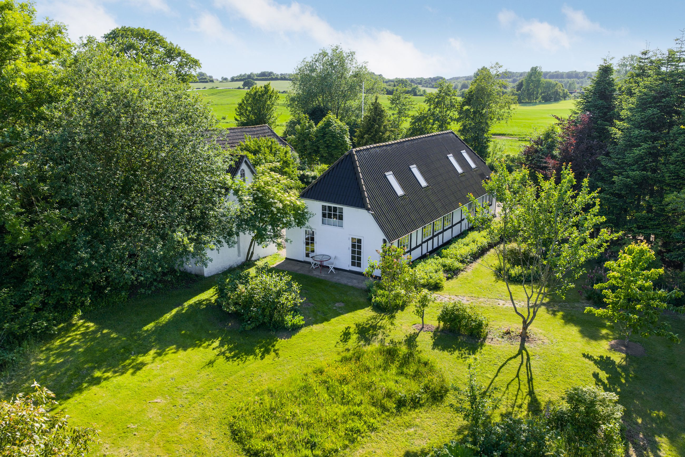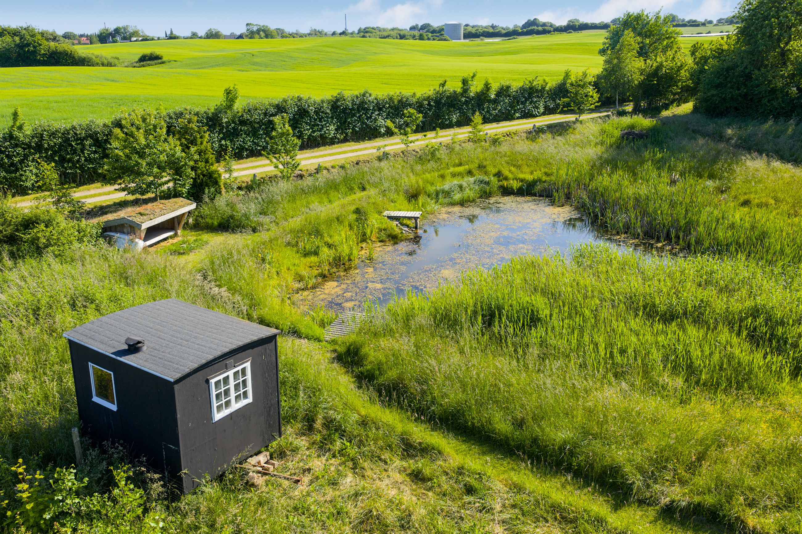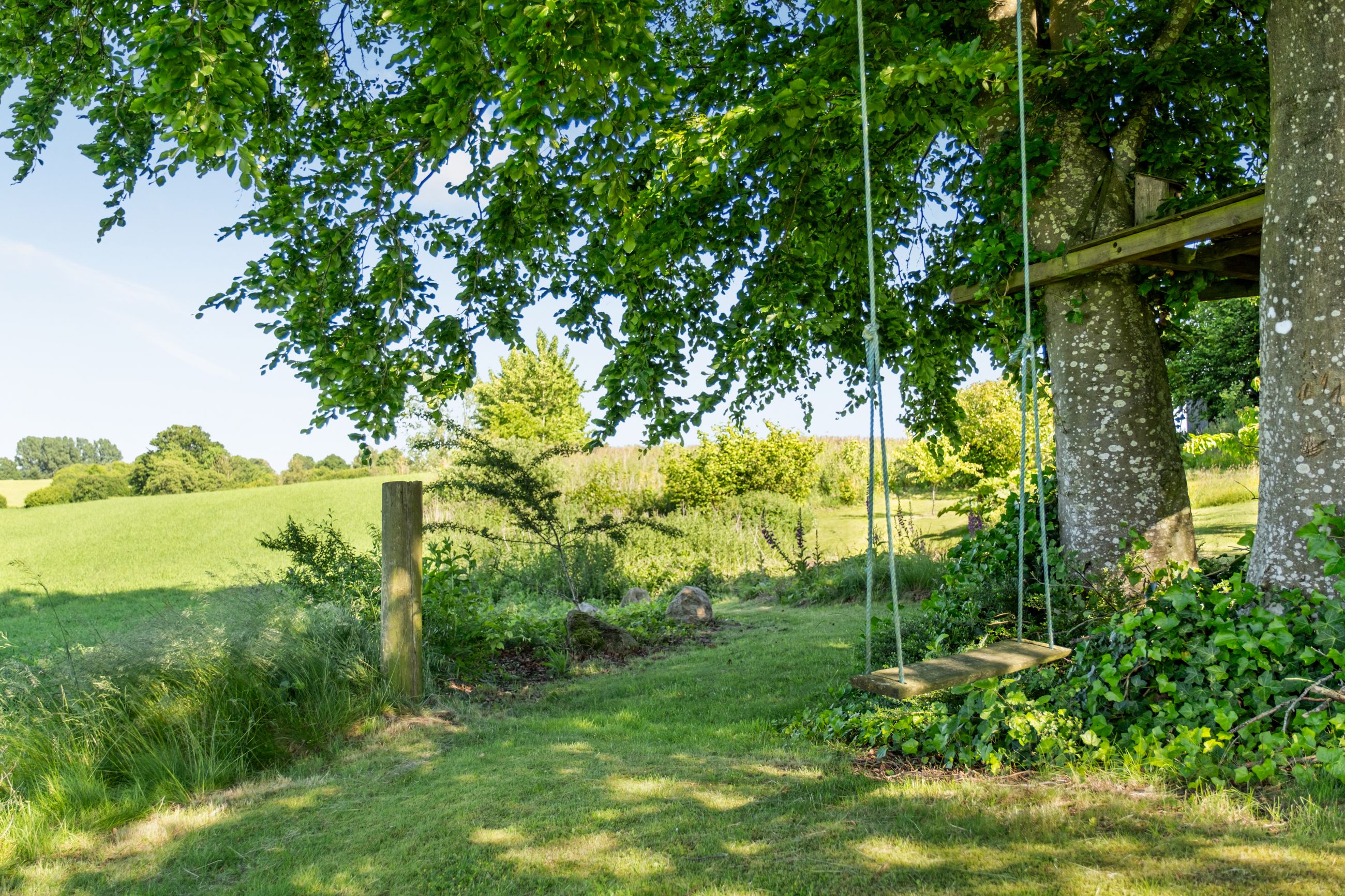 Og så er der haven. Den er ganske enkelt noget helt særligt. Du får en lukket gårdhave med solrige terrasser og lækroge. Du får blomsterbede, gamle træer og en idyllisk badesø med tilhørende sauna. Et charmerende lille træhus mellem store træer fungerer som kontorplads med varme og vinduer. Derudover finder du drivhus, køkkenhave, bærbuske, frugttræer, shelter – og hele 1,3 hektar jord at boltre dig på. Her kan du mærke roen, høre fuglene og opleve naturen helt tæt på.