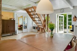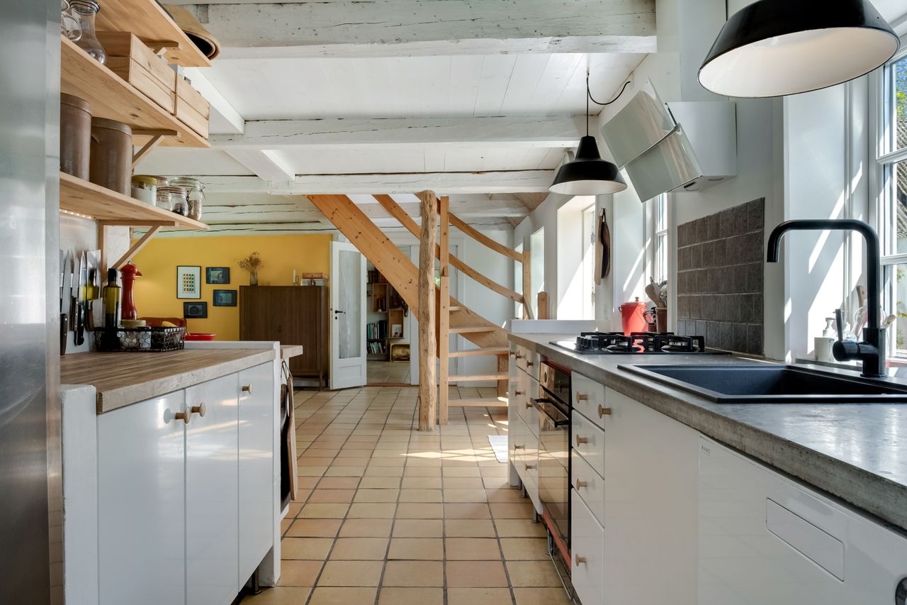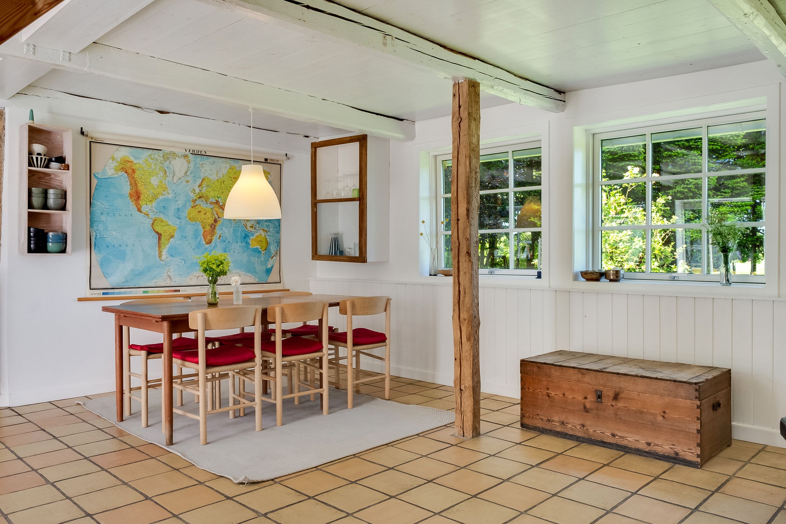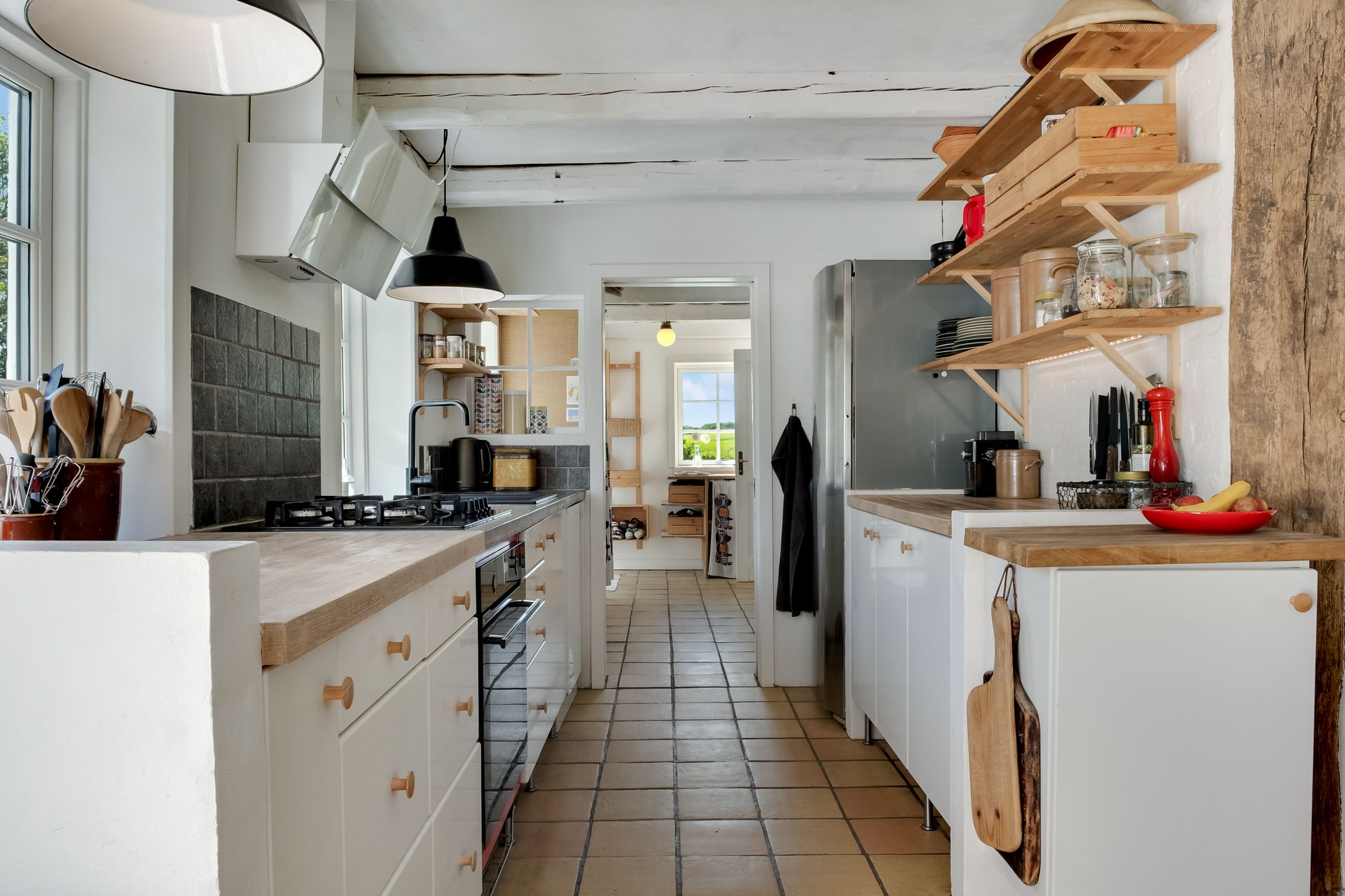 Husets naturlige samlingspunkt er det store køkken-alrum. Her er der synlige bjælker i det hvide loft, fine fliser på gulvet og masser af plads til at samle familie og venner omkring spisebordet. Køkkenet er lyst med et skønt lysindfald og indrettet med åbne træhylder, træbordplade og betonbordplade omkring vasken. En havedør gør det nemt at bære maden direkte ud i den solrige gårdhave. Fra alrummet leder dobbeltdøre ind til stuen, hvor bjælker og store vinduespartier skaber et stemningsfuldt rum med udgange til haven. Der er gulvvarme i hele underetagen.