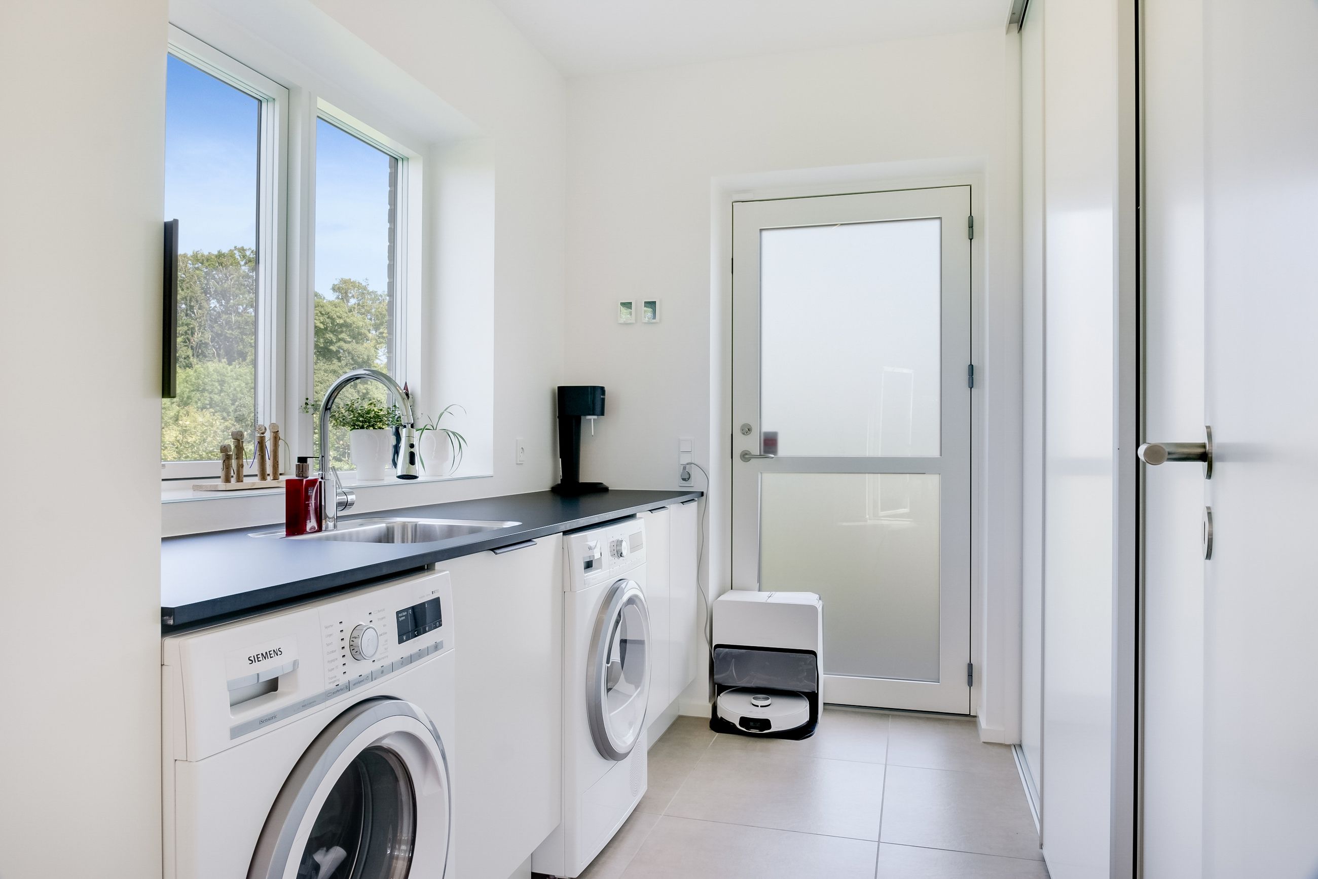 Bryggerset ligger i forbindelse med køkkenet og rummer plads til vaskemaskine, tørretumbler, opbevaring bag skydelåger og egen udgang.
