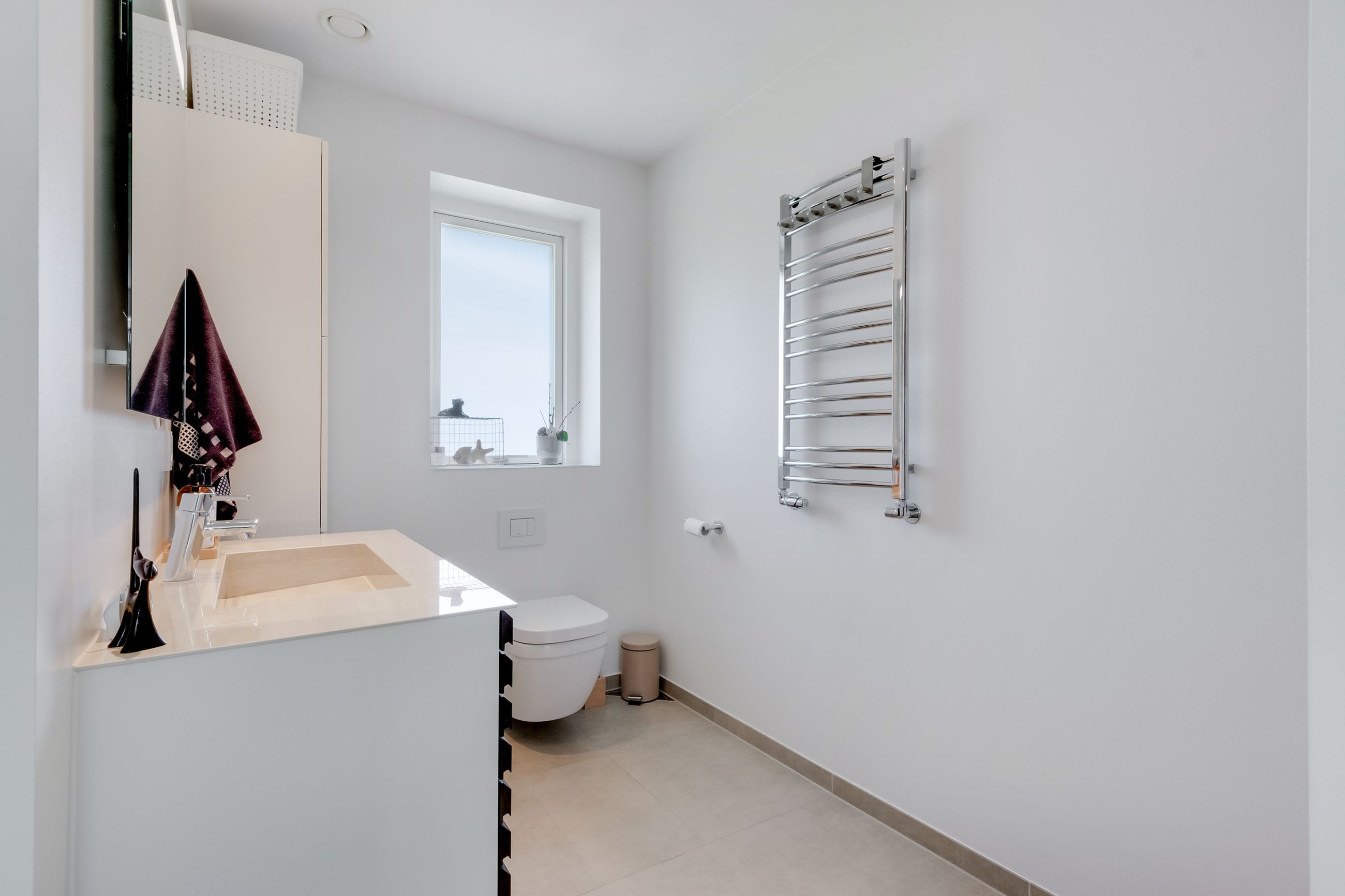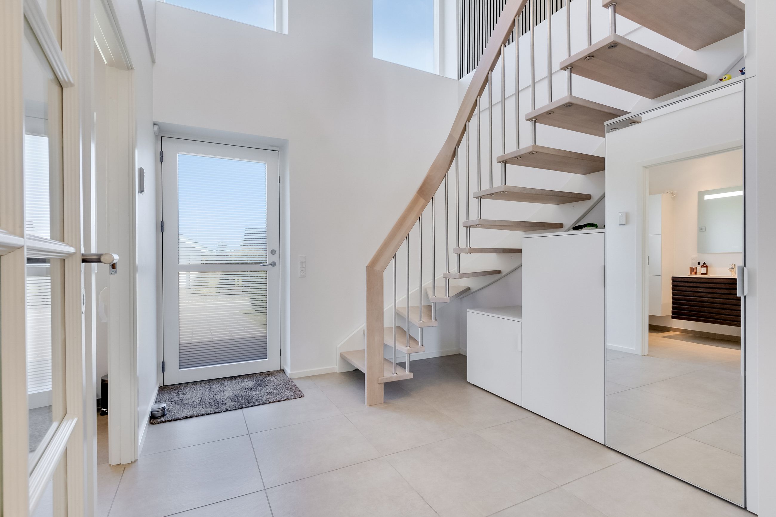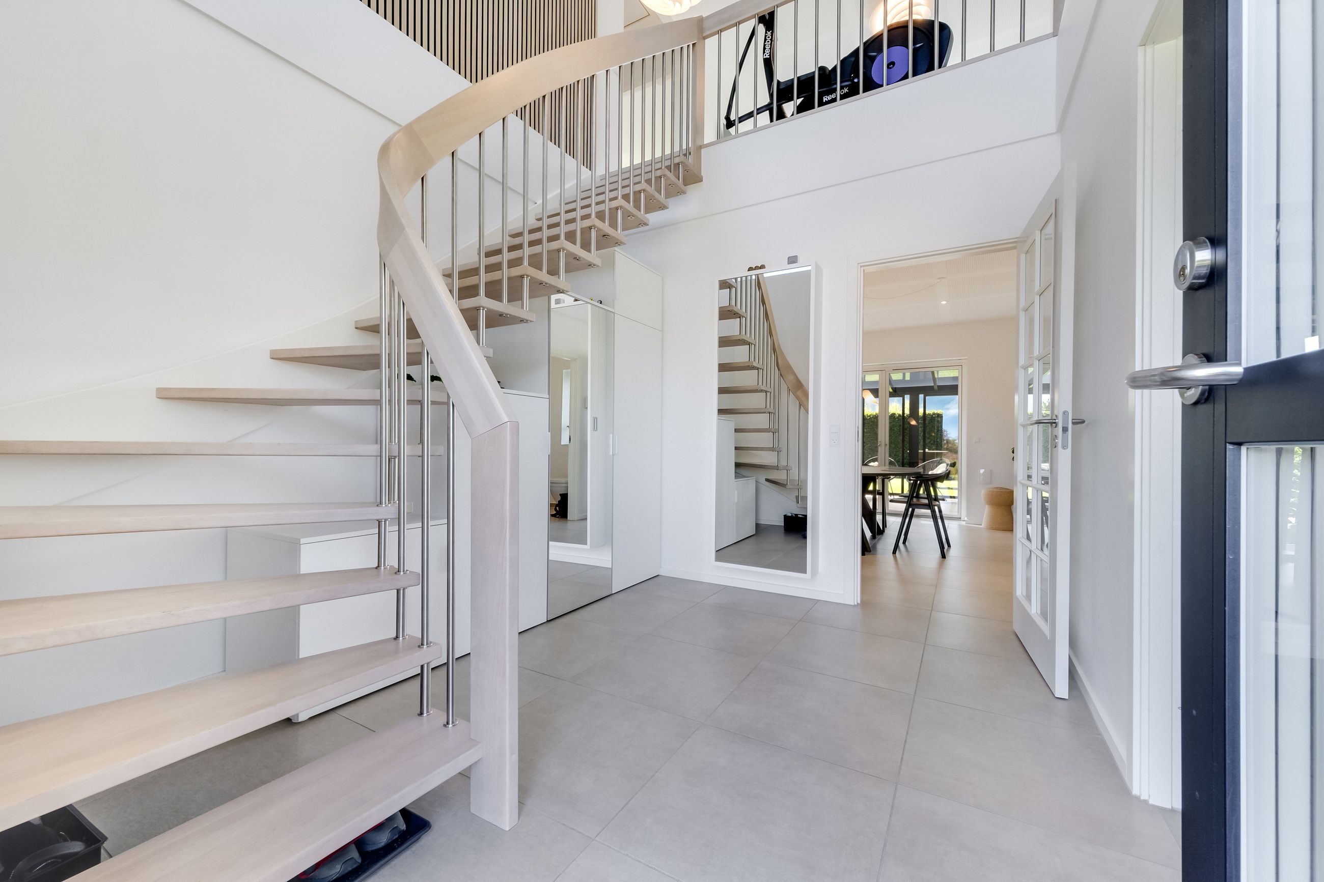 Når I træder ind ad døren bliver I mødt af en smuk hall med et helt fantastisk lysindfald. Her er god opbevaringsplads under trappen, store, elegante klinker på gulvet og en flot, svungen trappe. Til højre ligger et moderne badeværelse med væghængt toilet, indbygget bruseniche og smukt møbel i samme stil som resten af huset.