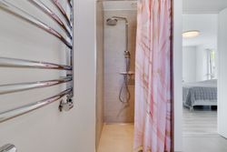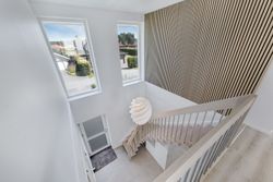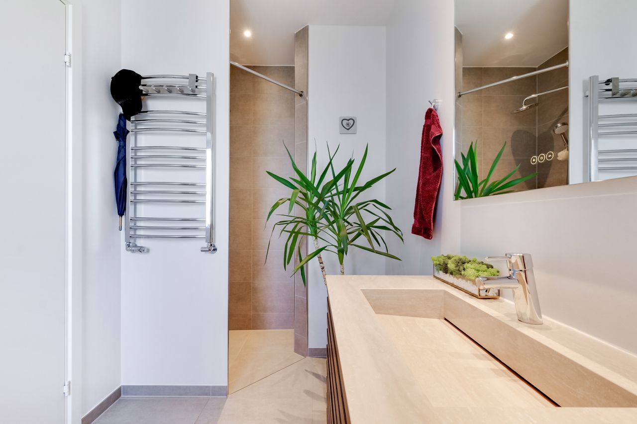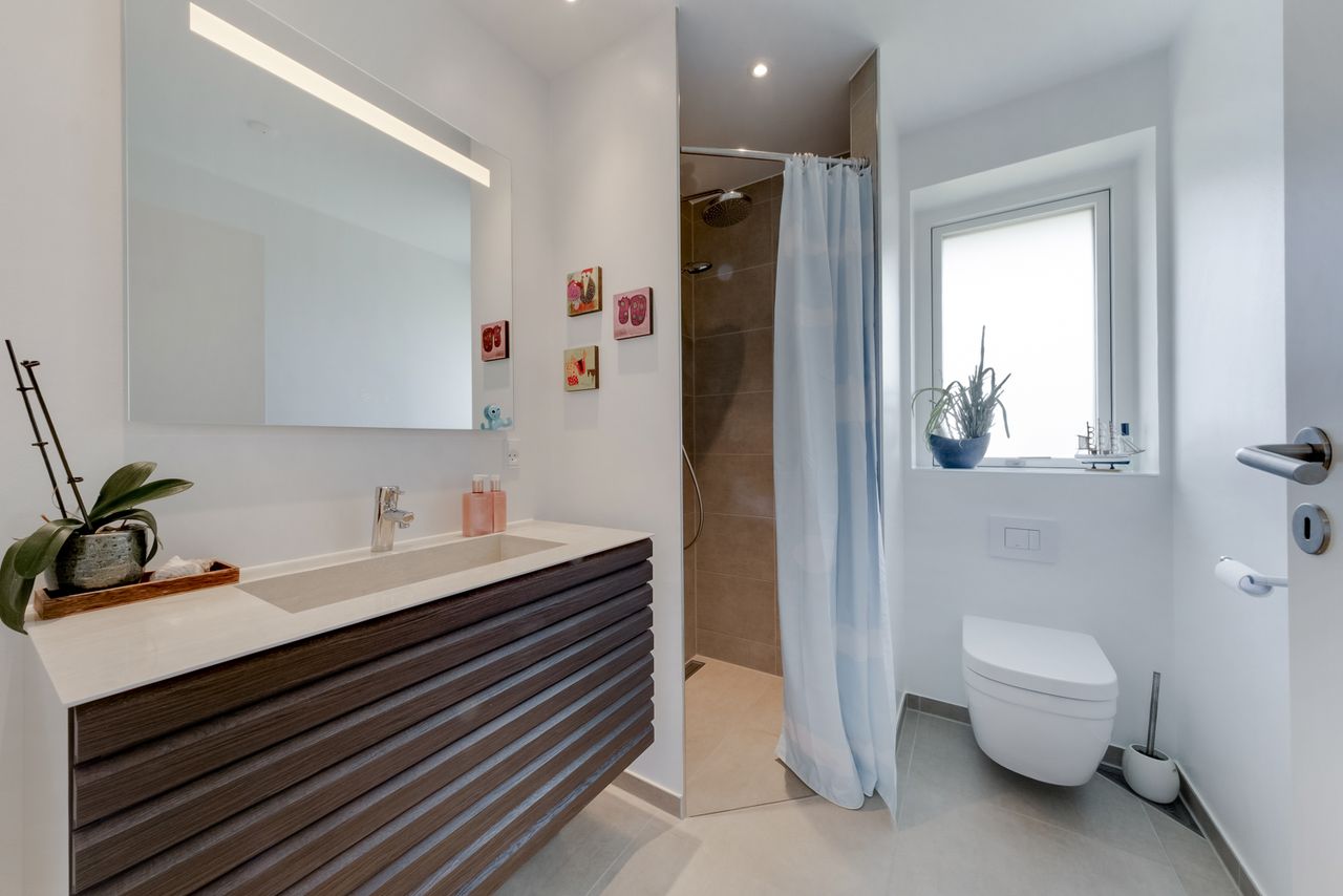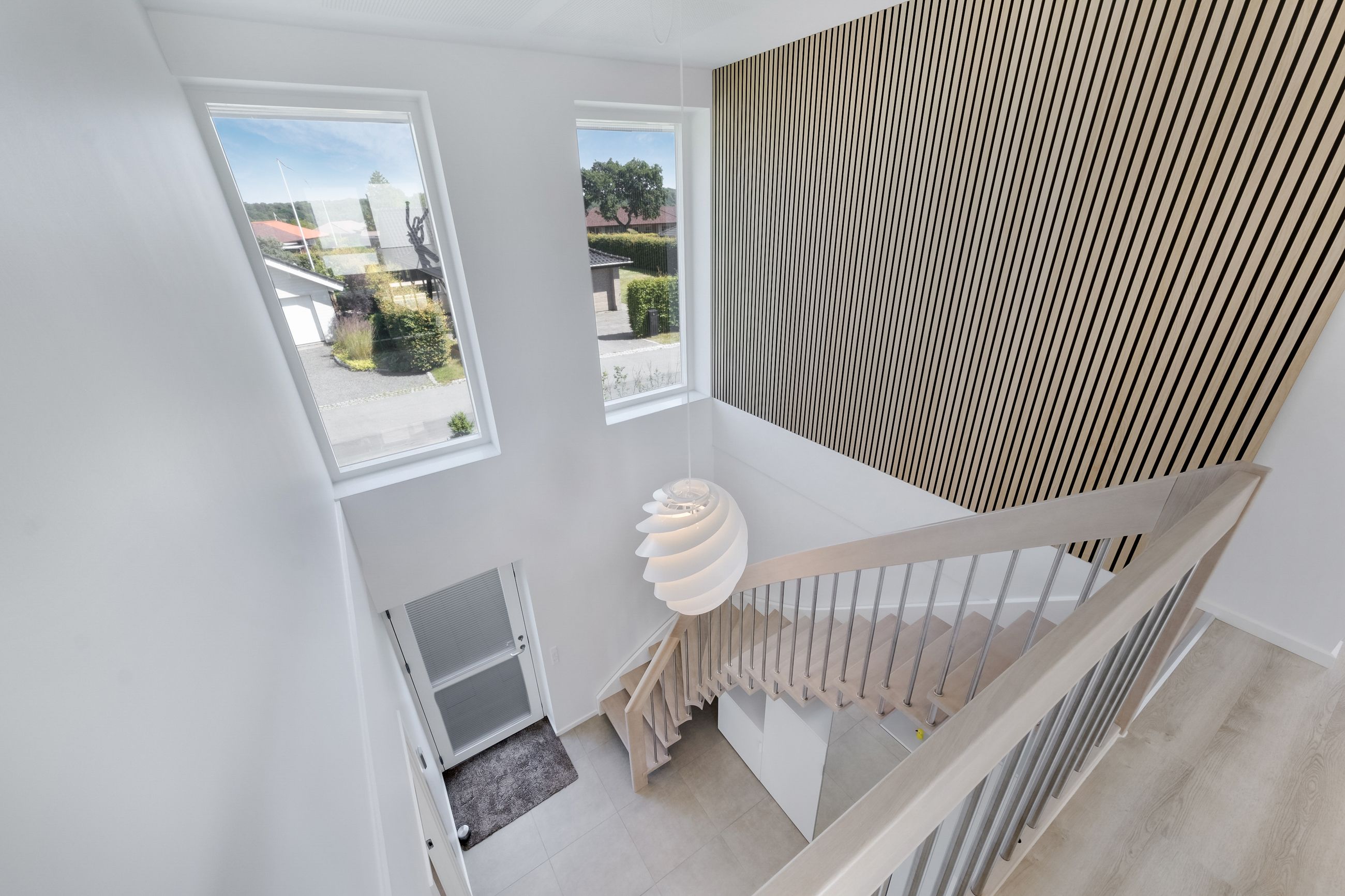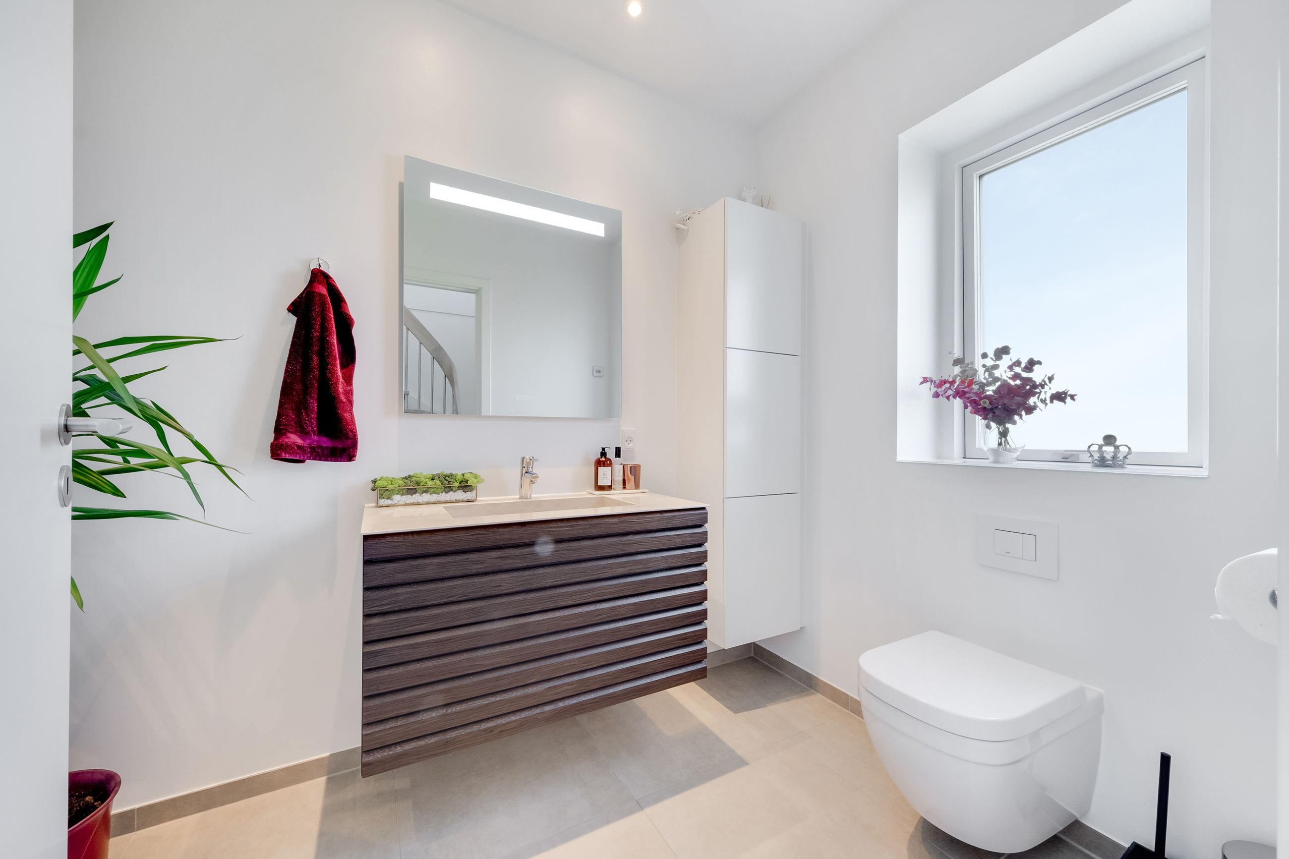 Når I træder ind ad døren bliver I mødt af en smuk hall med et helt fantastisk lysindfald. Her er god opbevaringsplads under trappen, store, elegante klinker på gulvet og en flot, svungen trappe. Til højre ligger et moderne badeværelse med væghængt toilet, indbygget bruseniche og smukt møbel i samme stil som resten af huset.