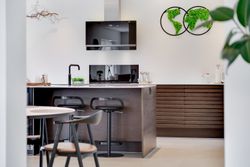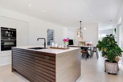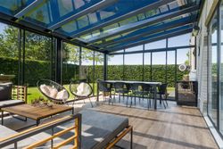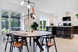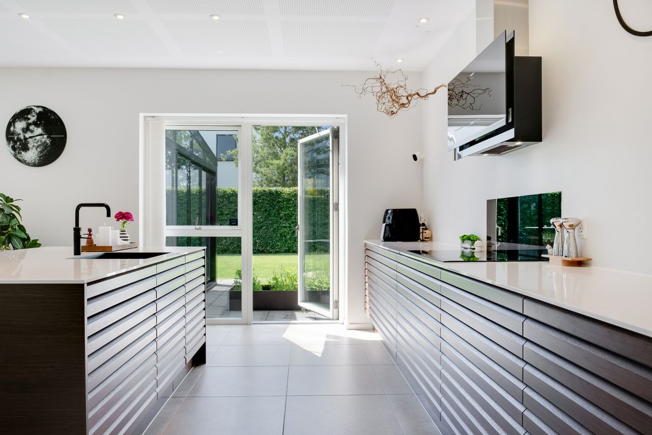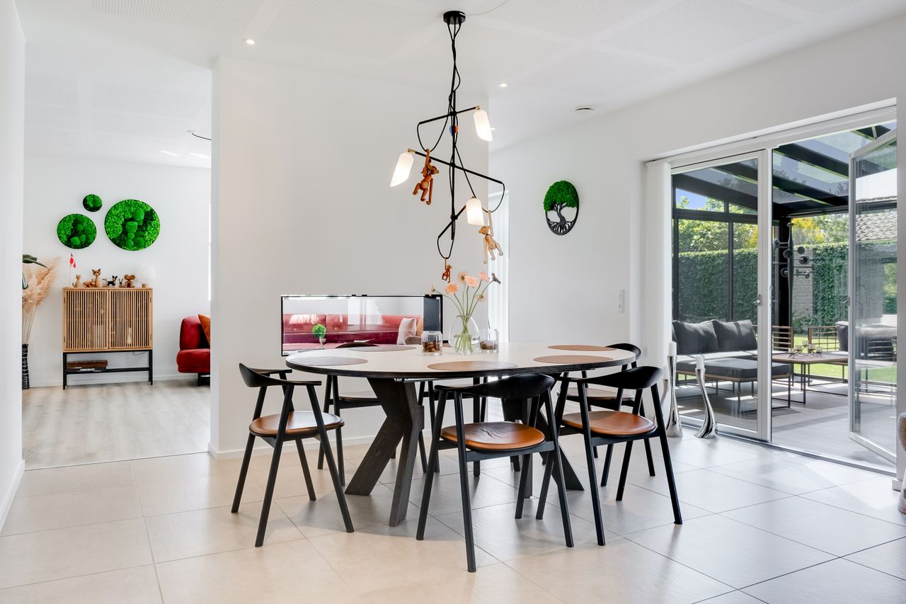 Fortsætter I videre, kommer I ind i ejendommens imponerende køkken-alrum med elegante fronter, slidstærk bordplade, Quooker og en skøn køkkenø med barstole – perfekt til både madlavning og lektielæsning. Her er også plads til et langt spisebord, og via dobbeltdøre er der adgang til terrassen. Du kan også træde ud i den eksklusive orangeri med plads til sofaområde og spisebord – et ekstra opholdsrum, der forlænger udesæsonen og inviterer naturen helt tæt på.