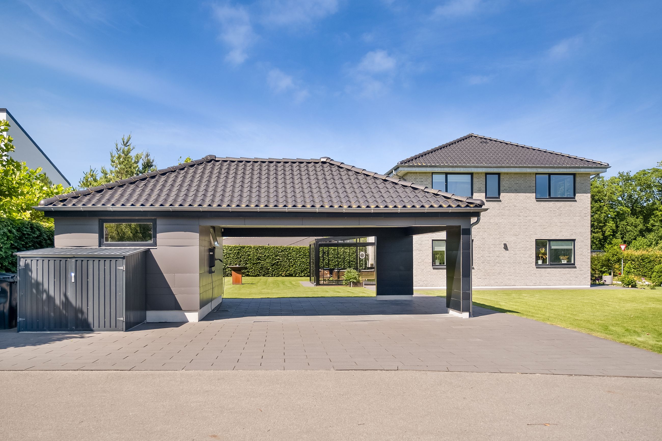 Haven står snorlige med en veltrimmet græsplæne, enkelte buske og roser. Den er nem at holde, men kan nemt blive en grøn oase, hvis I ønsker det. Det indbydende udeområde har desuden flere gode kroge og skønne terrassemiljøer. Afslutningsvis fuldender ejendommen det gennemførte indtryk med en rummelig carport til to biler og et isoleret skur til opmagasinering.