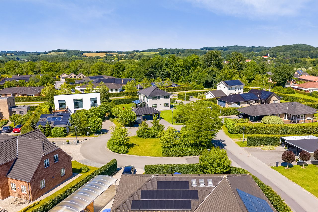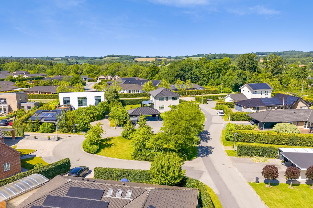 Når du ankommer til huset, bliver du hurtigt imponeret over, hvor eksklusiv og imponerende villaen tager sig ud. Her er højt til loftet, store vinduer og en stor dobbelt carport med mulighed for el-ladestander. Huset har gulvvarme overalt, blødgøringsanlæg, centralstøvsuger, akustiklofter med spots og opvarmes økonomisk med jordvarme – så alt i alt får man her en ejendom der emmer af luksus og kvalitet og med gennemtænkte løsninger og materialer i topklasse.