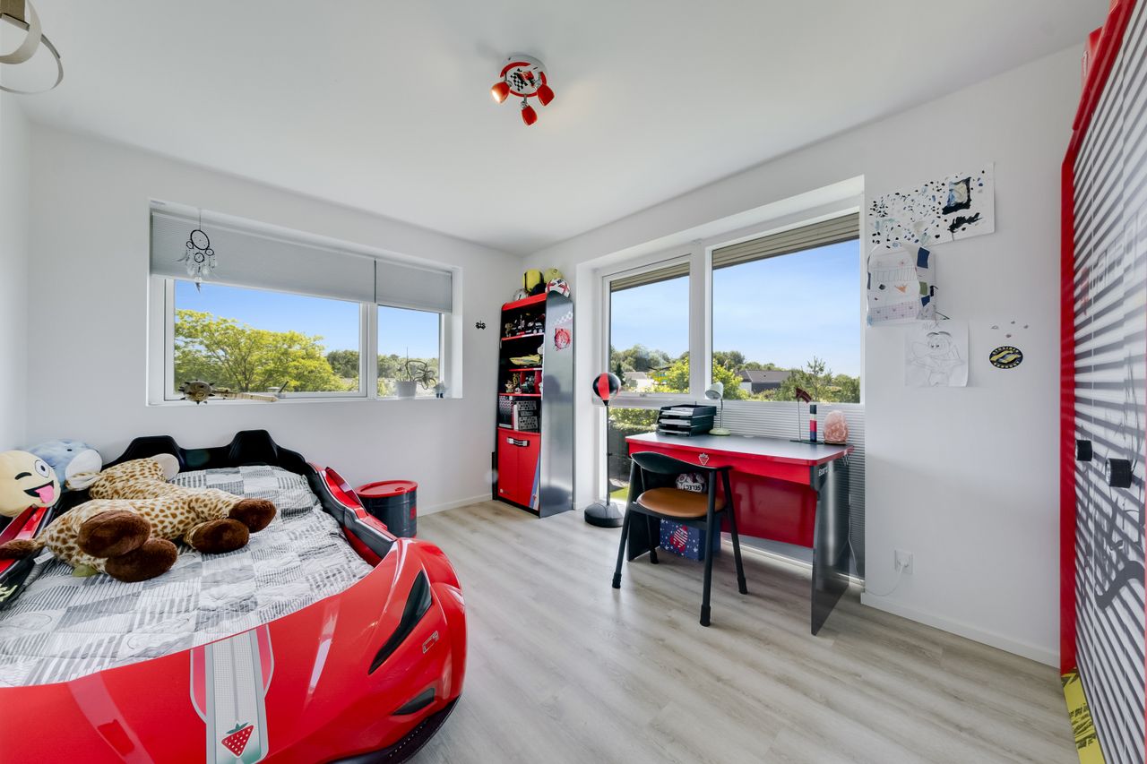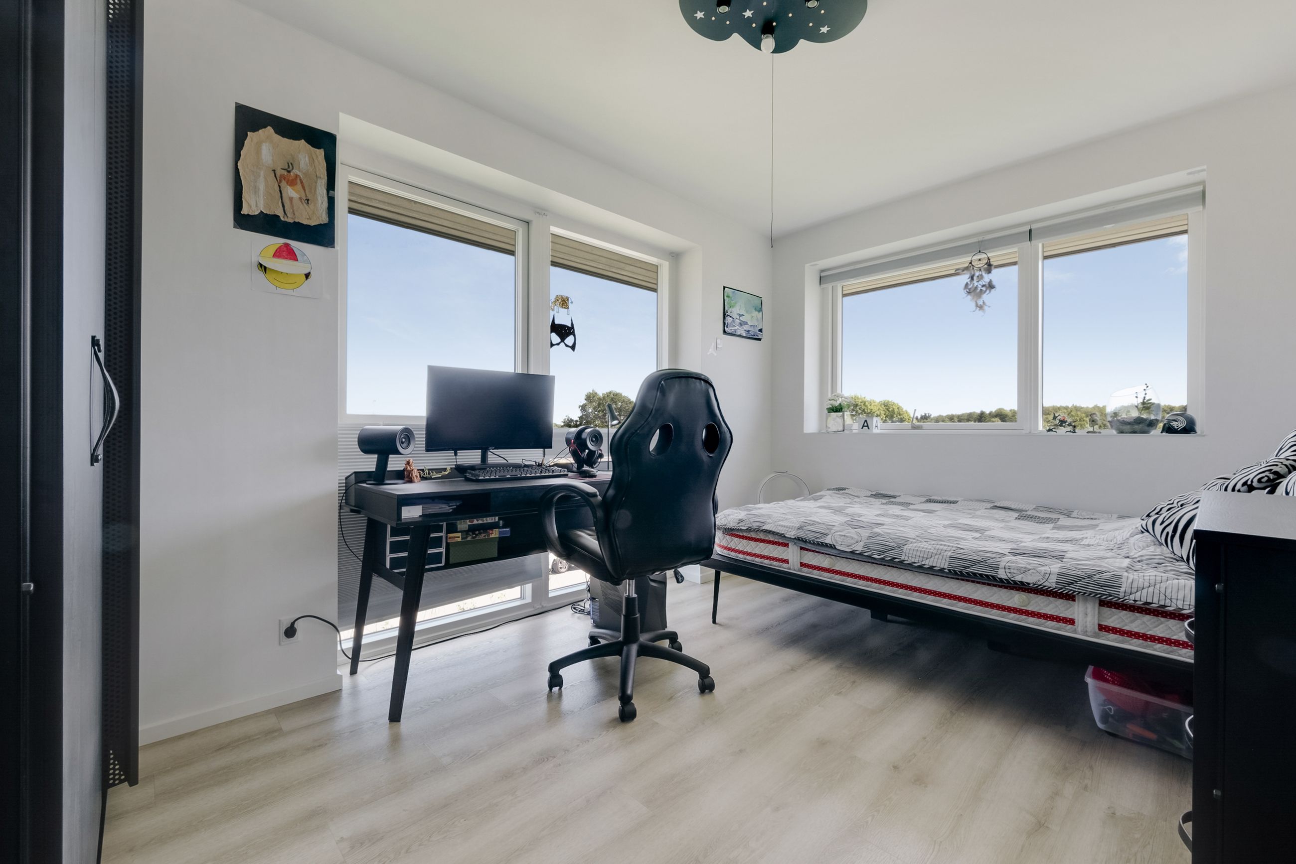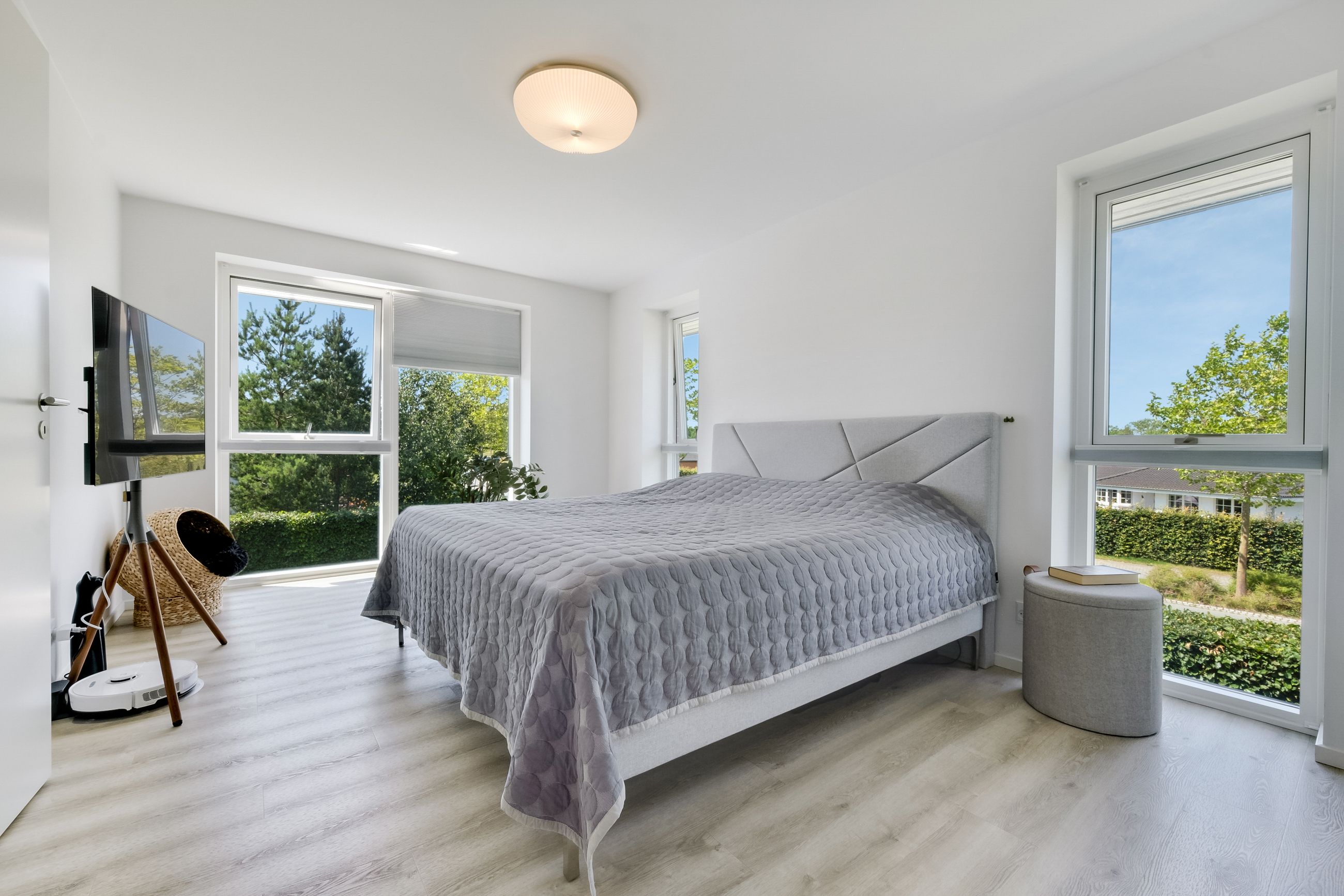 På førstesalen venter et stort aktivitetsrum/repos – oplagt som ekstra stue eller legerum – og tre gode værelser. Det ene er forældresoveværelse med walk-in og eget badeværelse, mens de to andre deler endnu et badeværelse. Alle badeværelser er opført i samme smukke stil. Værelserne er rummelige med plads til både leg, opbevaring og ro.