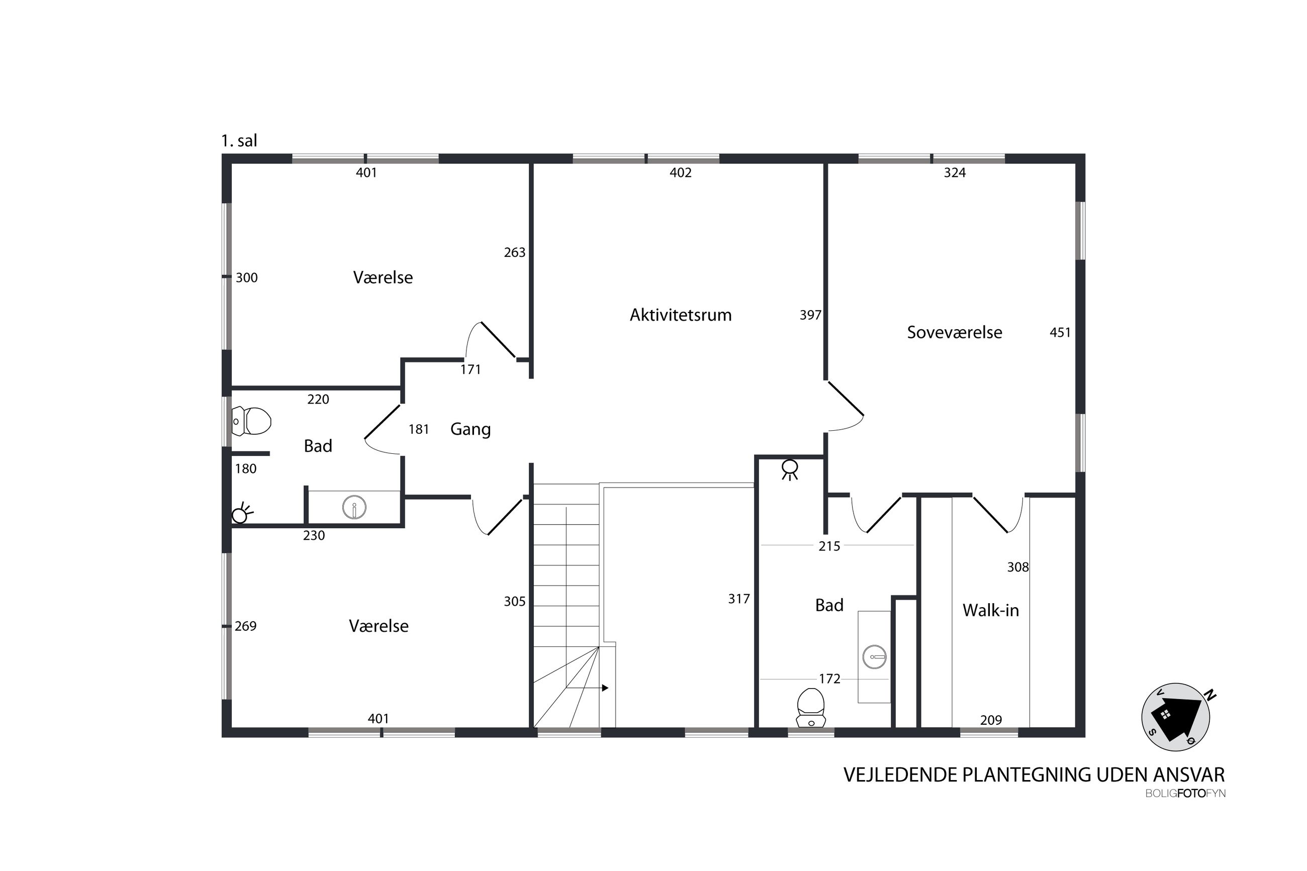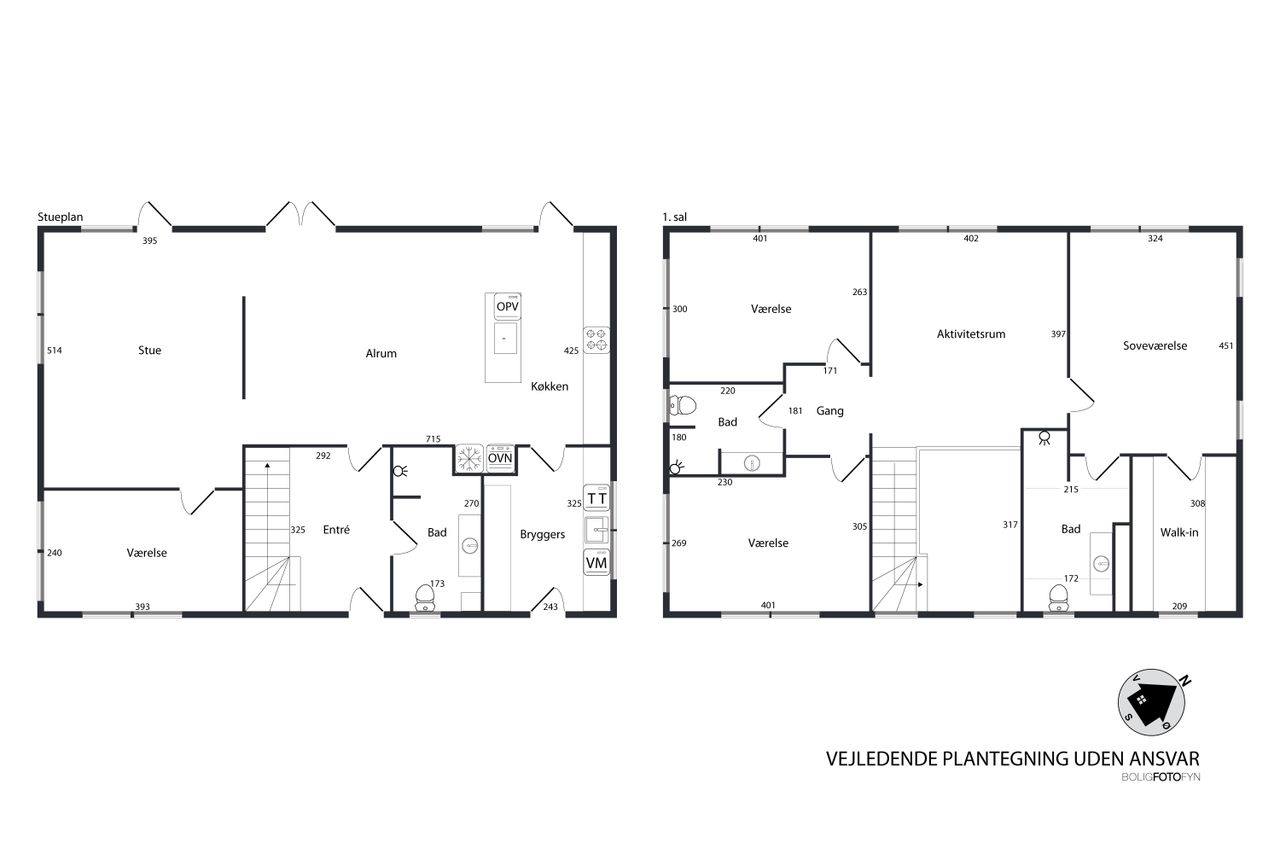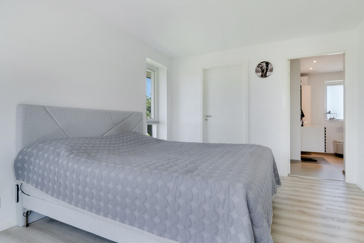 På førstesalen venter et stort aktivitetsrum/repos – oplagt som ekstra stue eller legerum – og tre gode værelser. Det ene er forældresoveværelse med walk-in og eget badeværelse, mens de to andre deler endnu et badeværelse. Alle badeværelser er opført i samme smukke stil. Værelserne er rummelige med plads til både leg, opbevaring og ro.