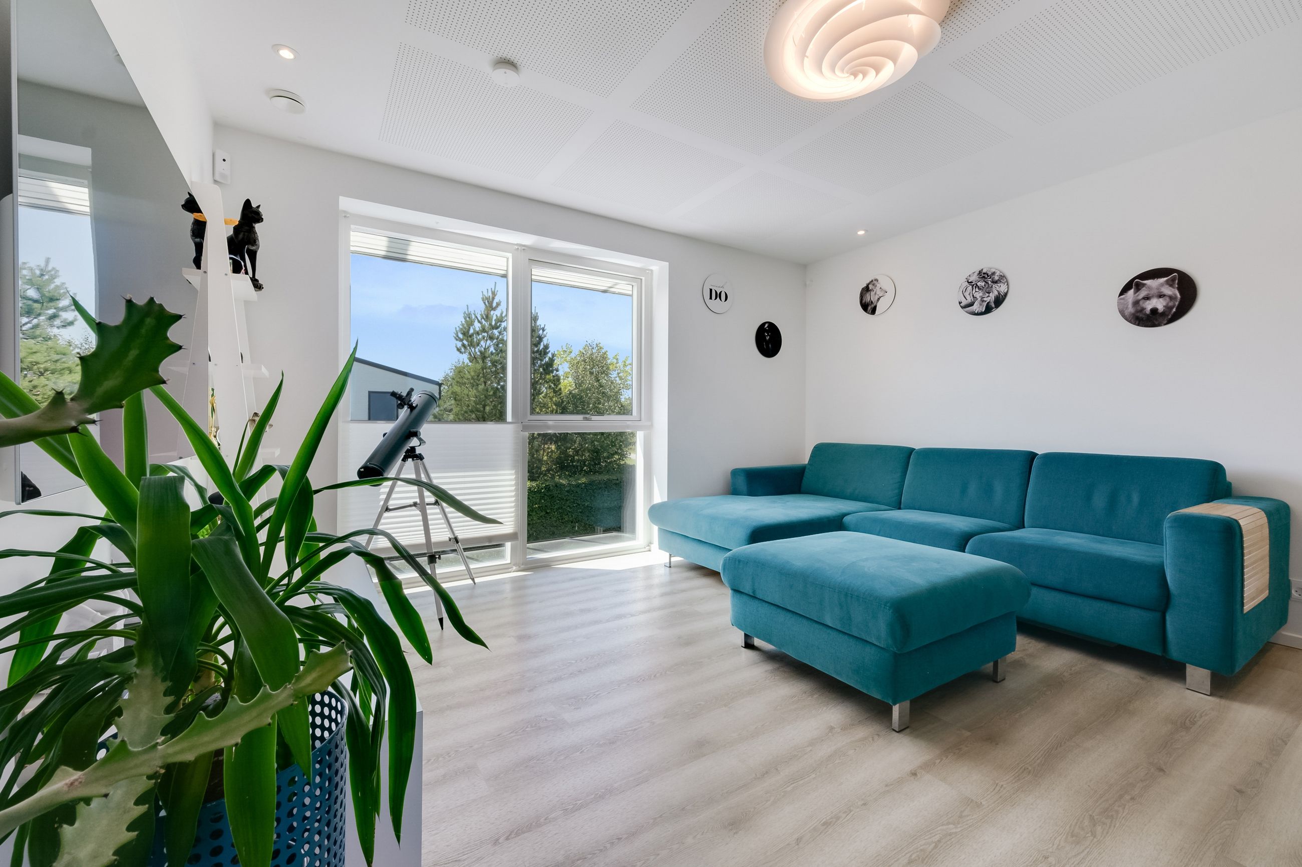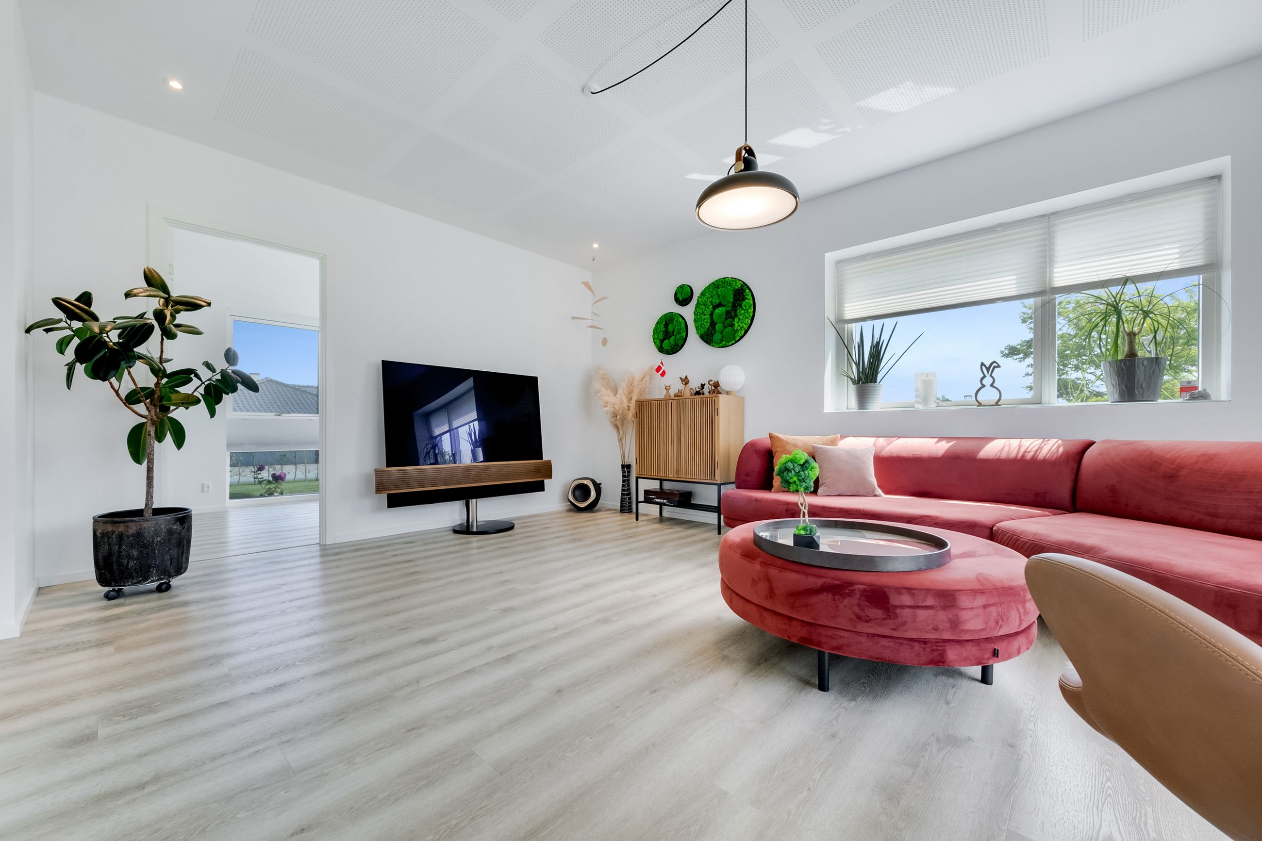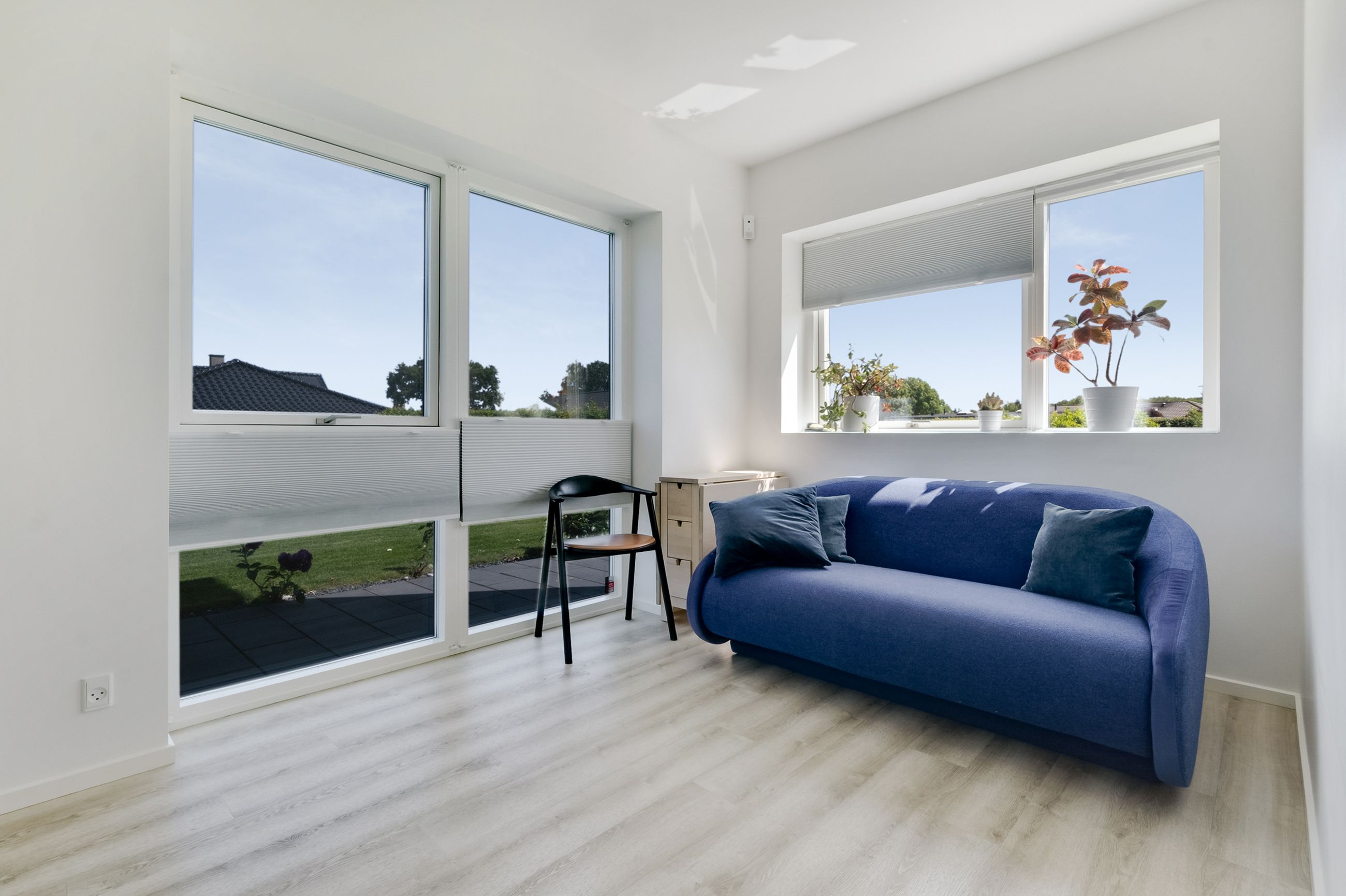 En mur med indbygget to-siddet biopejs adskiller spiseområdet fra den hyggelige stue med plads til afslapning og fællesskab. Her finder I også et værelse, oplagt som teenageafdeling, gæsteværelse eller kontor.