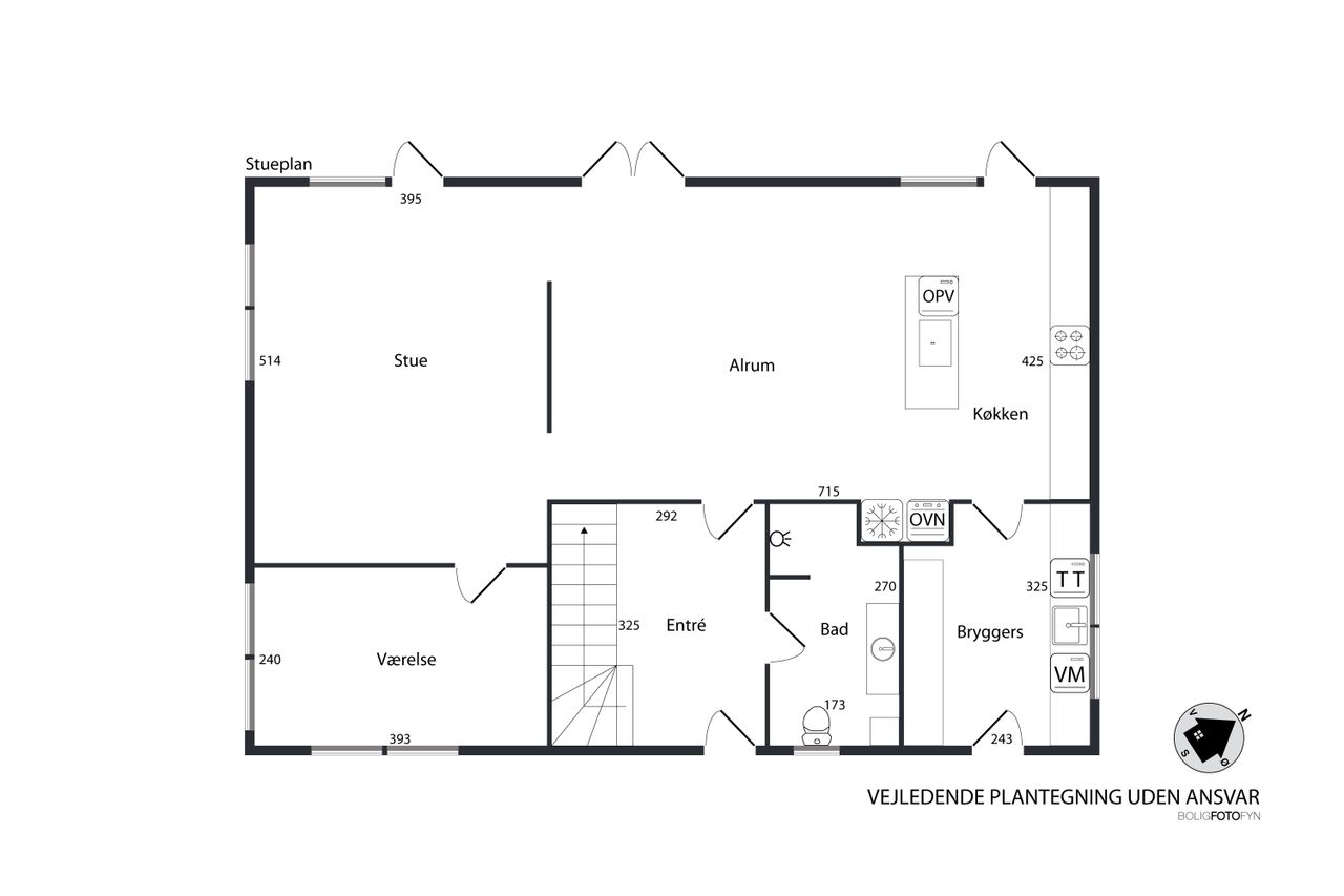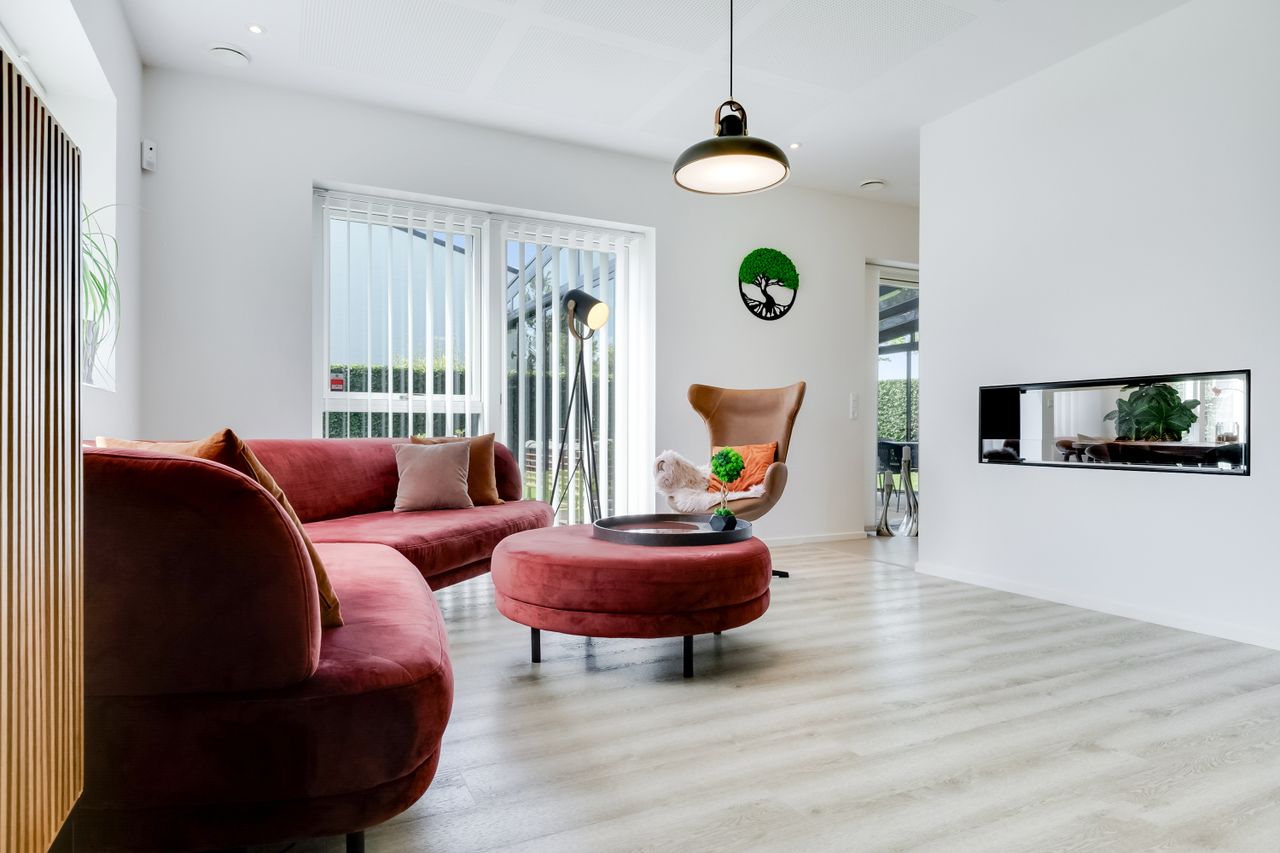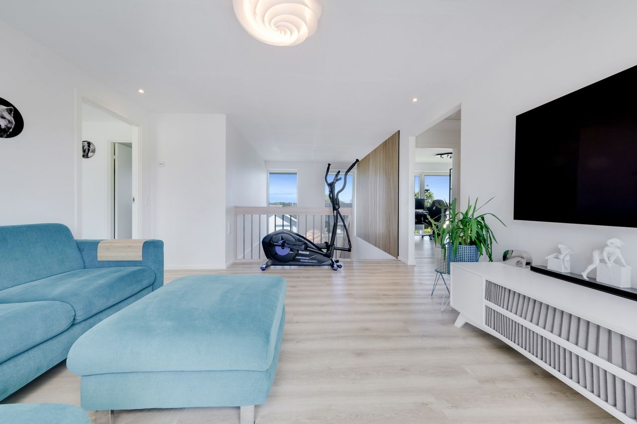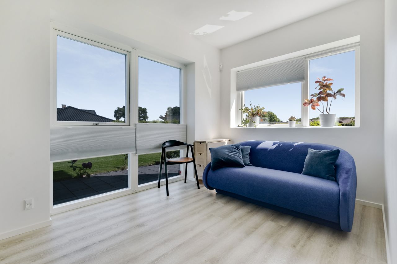 En mur med indbygget to-siddet biopejs adskiller spiseområdet fra den hyggelige stue med plads til afslapning og fællesskab. Her finder I også et værelse, oplagt som teenageafdeling, gæsteværelse eller kontor.