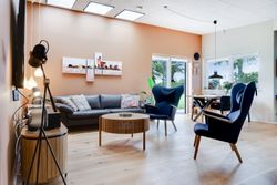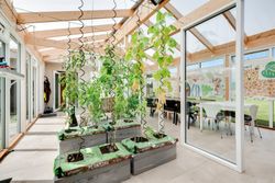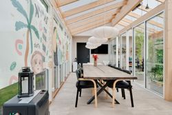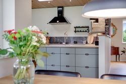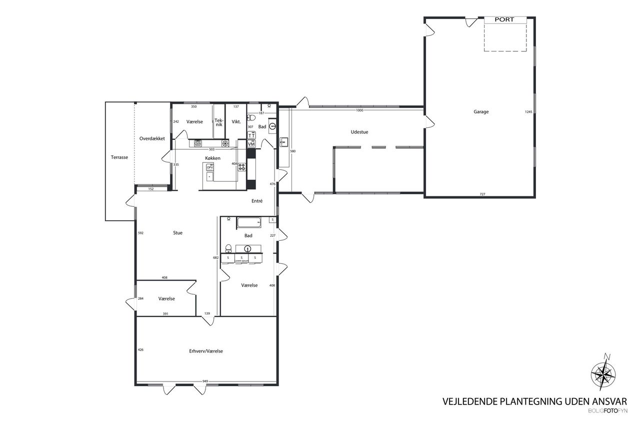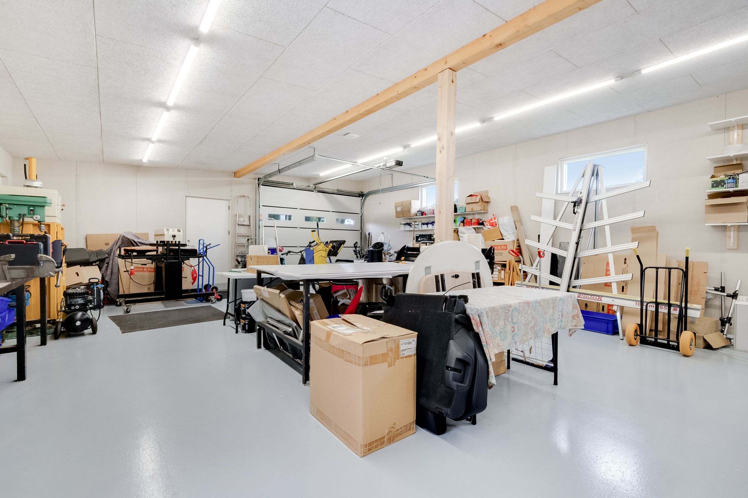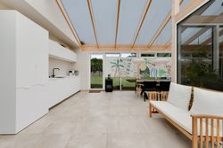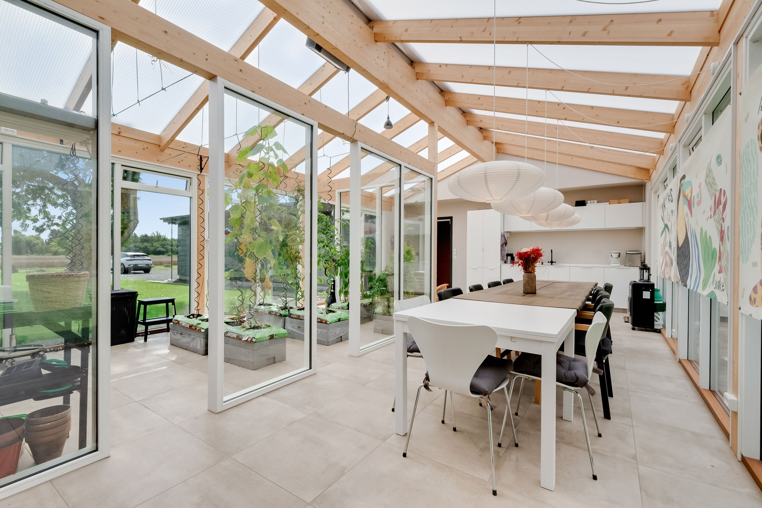 Udestuen er en sand perle – indrettet som orangeri med masser af planter og lys, klinkegulv og et tekøkken med god opbevaringsplads. Her kan du opholde dig året rundt. Fra orangeriet er der direkte adgang til den 90 kvadratmeter store garage, som er opvarmet med luft-til-luft varmepumpe.
