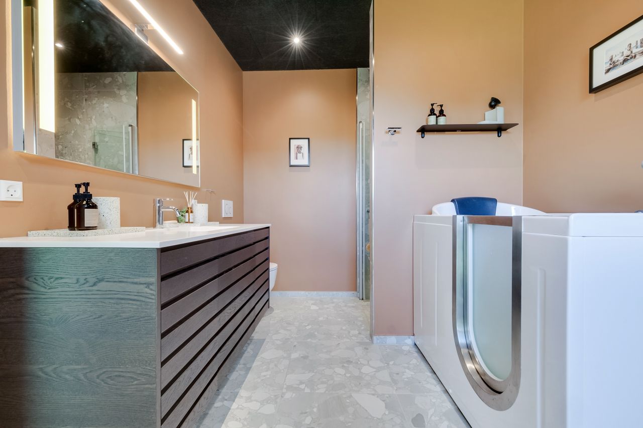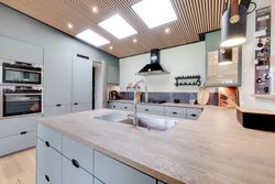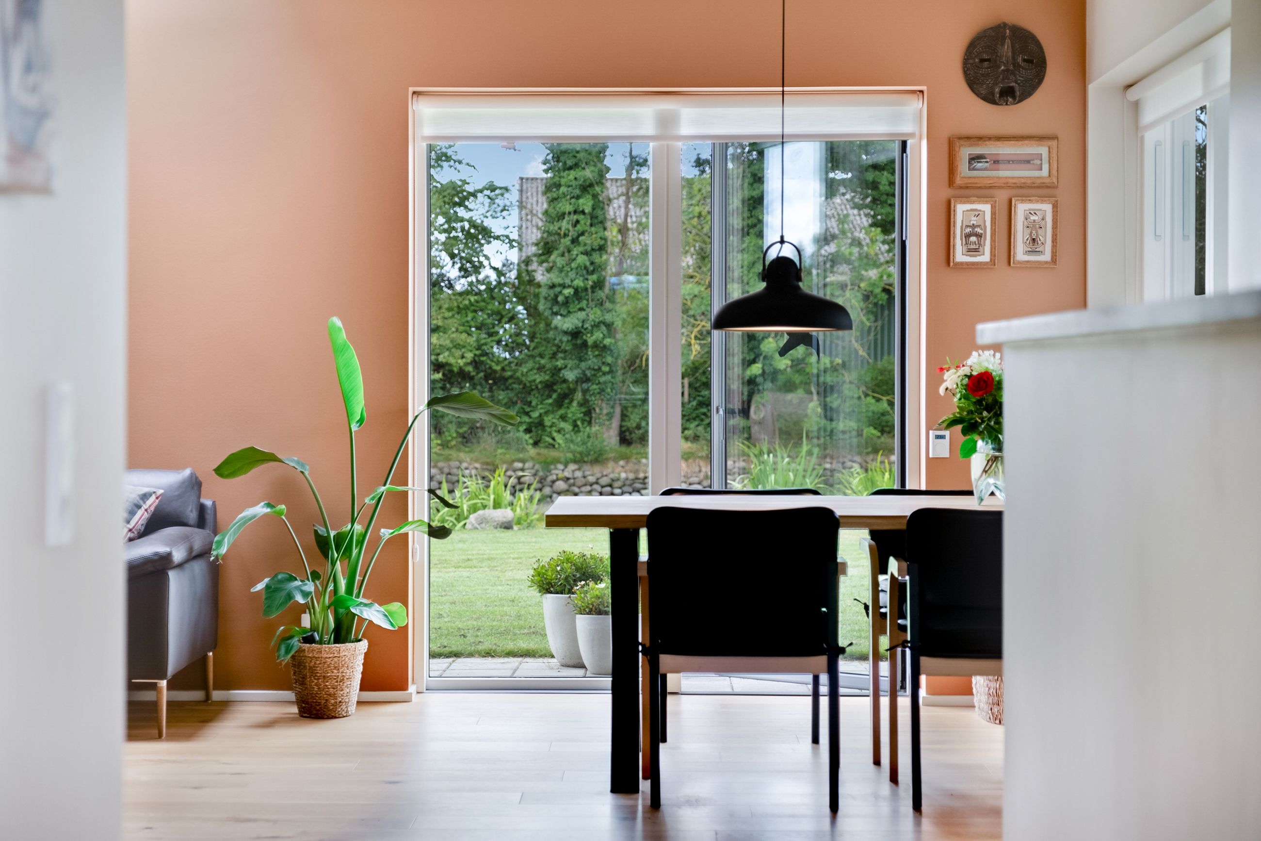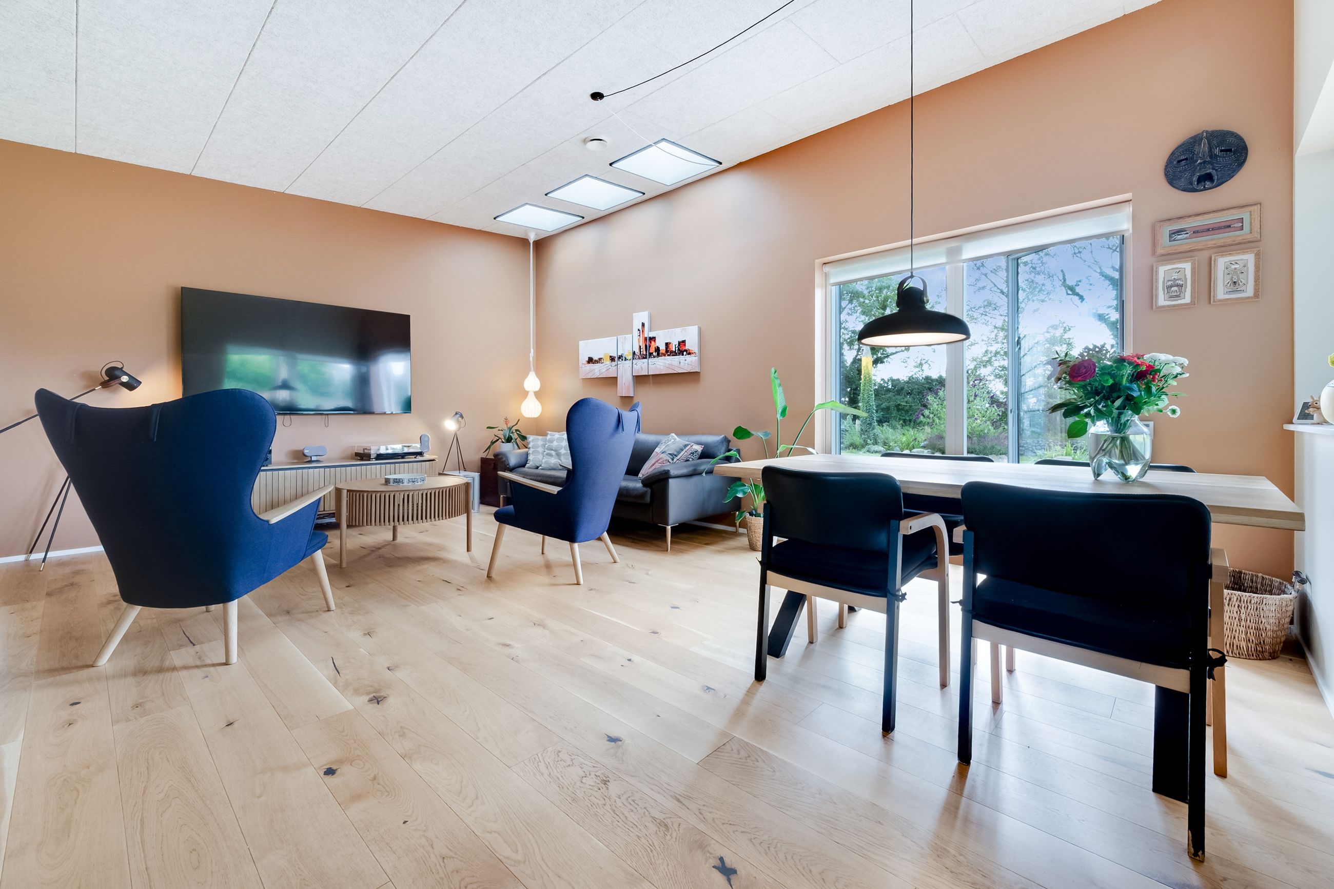 Hus og have står snorlige – alt er gennemtænkt. Her er store vinduespartier, der trækker naturen helt ind, smukke trægulve i store dele af huset, køkken og badeværelsesmøbler fra Kvik og et vidunderligt orangeri. Troldtektlofter sikrer god akustik, her er blødgøringsanlæg, ventilationssystem samt solceller på garagetaget, der holder elforbruget nede.