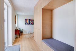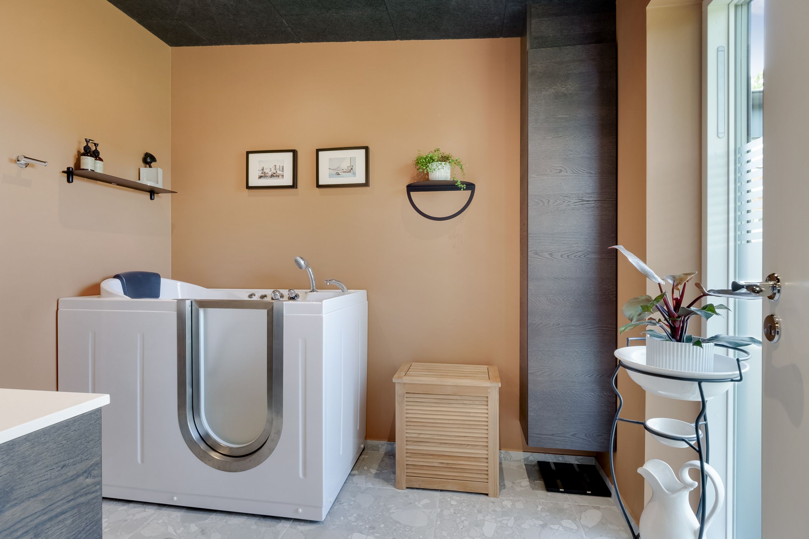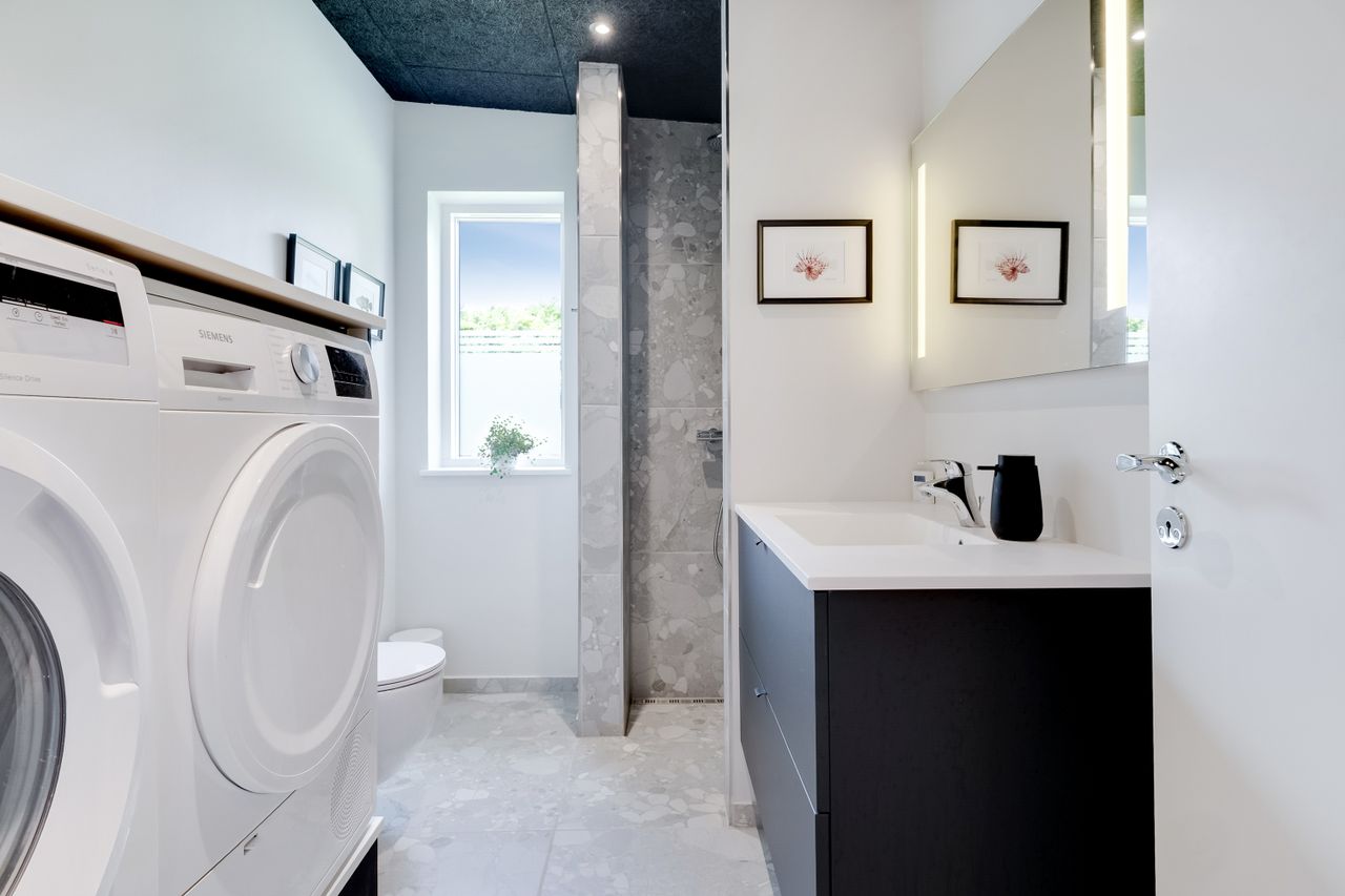 Entréen byder velkommen med et elegant indbygget skab med bænk til at tage sko på. Her ligger også husets første badeværelse med vaskefaciliteter, væghængt toilet og indbygget bruseniche.