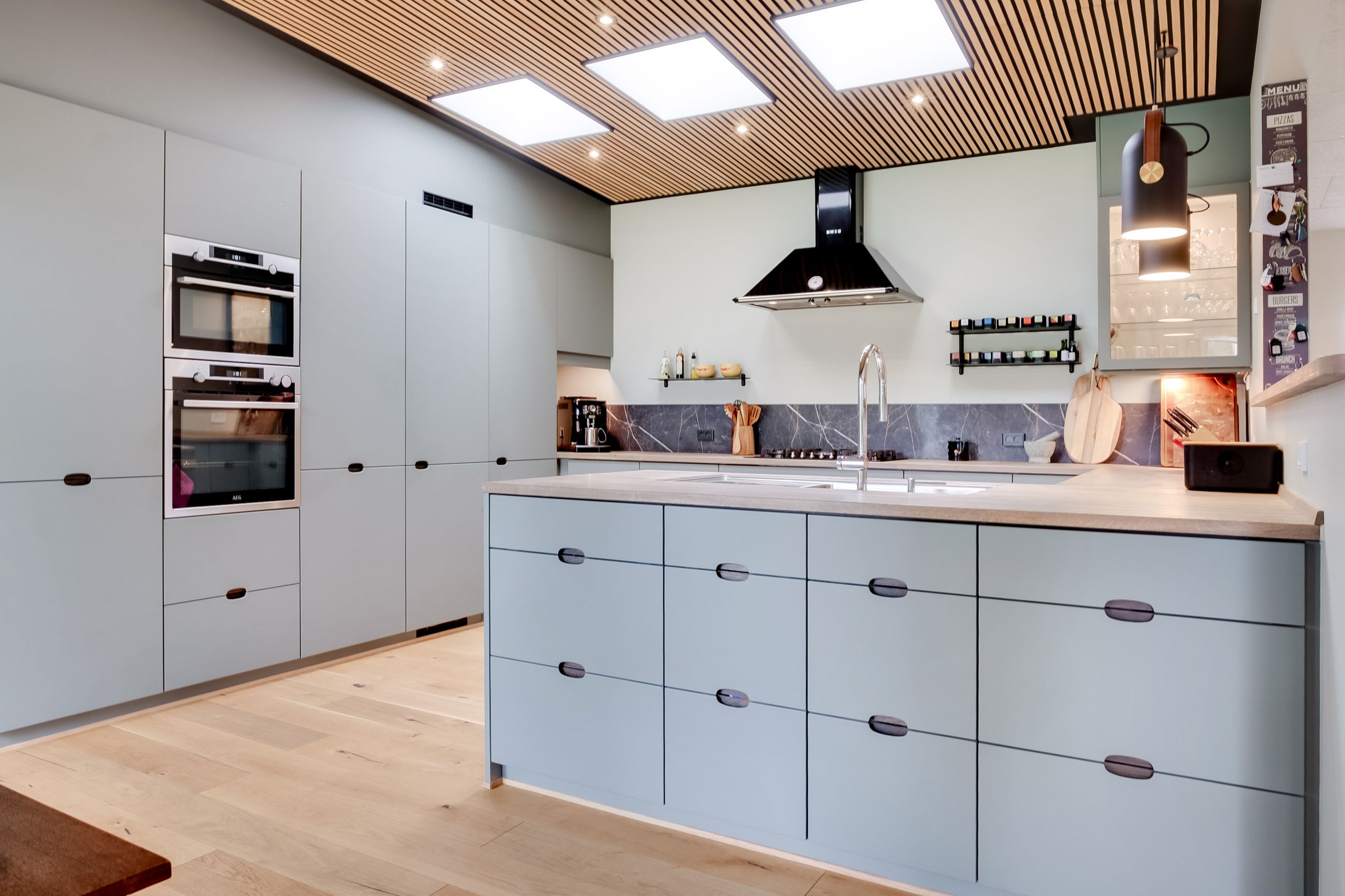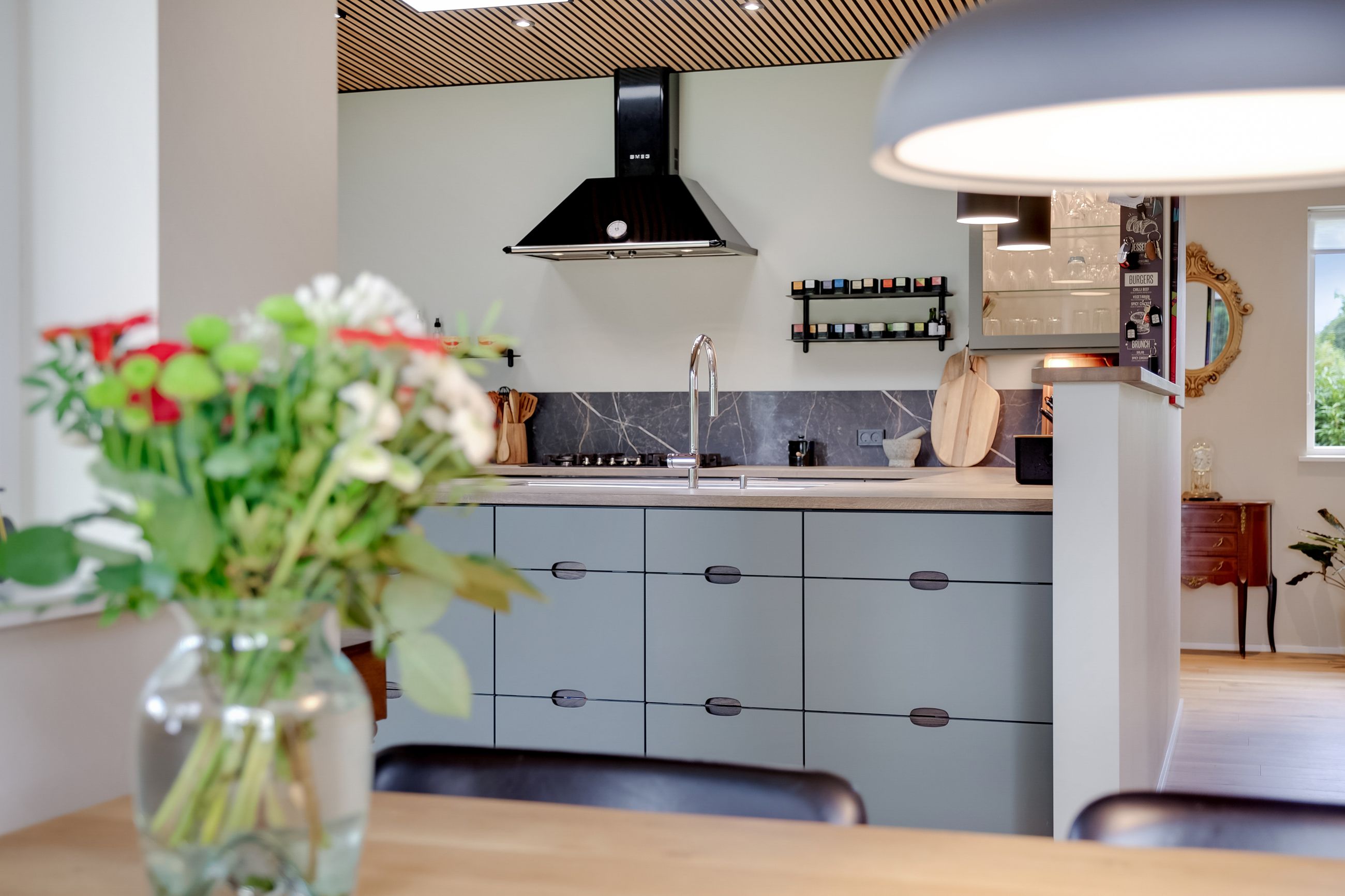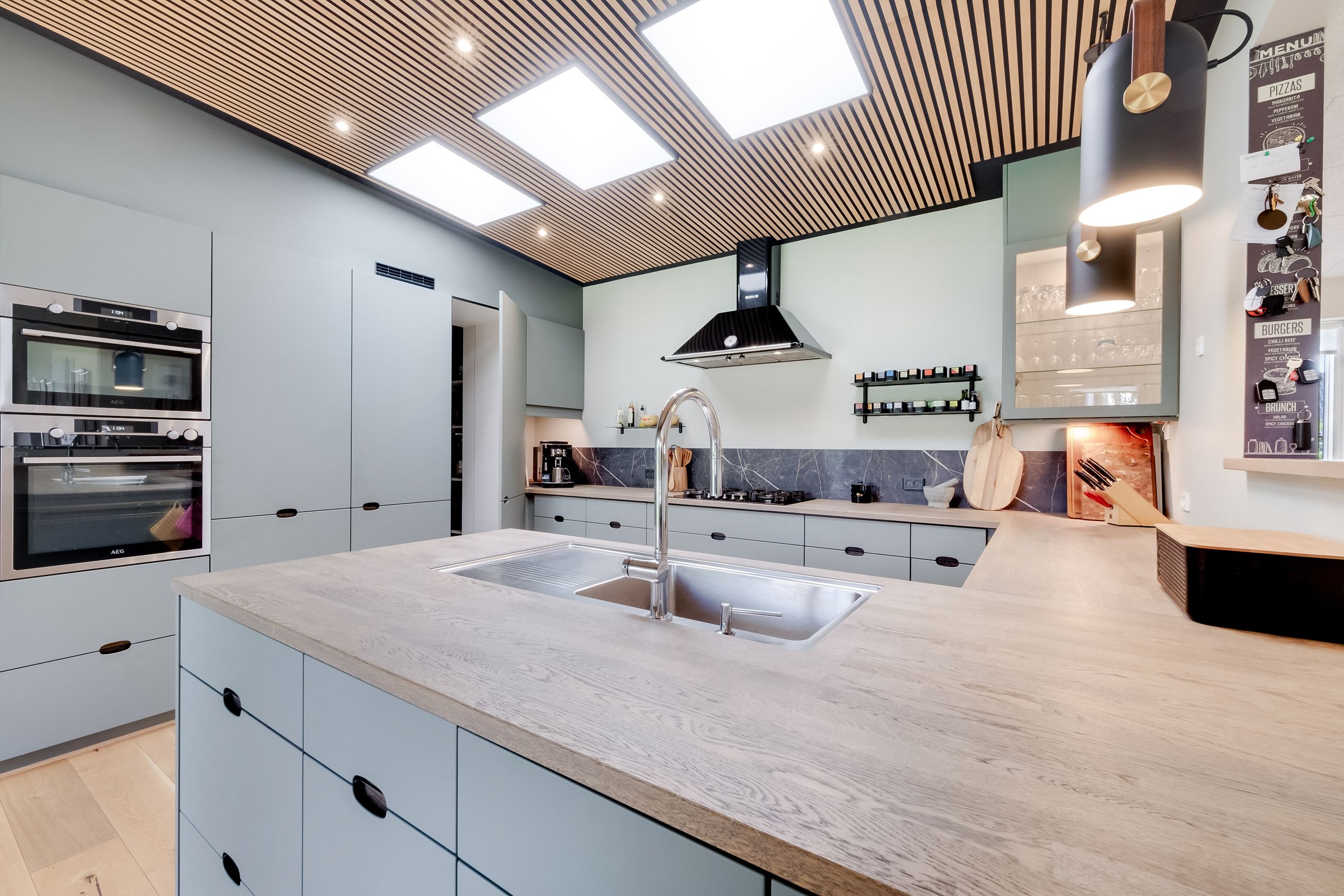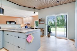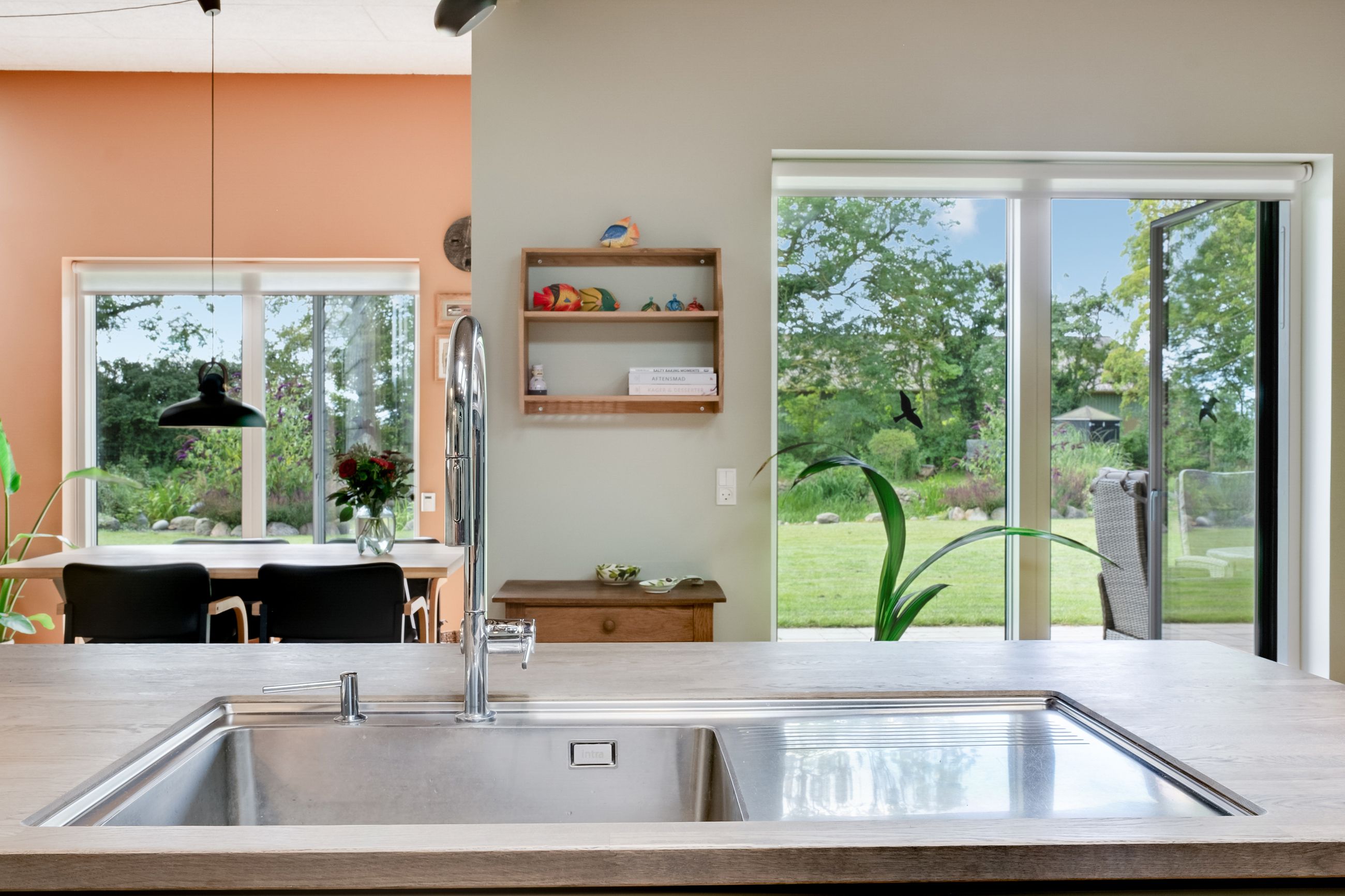 Fra entréen træder du ind i det store køkken-alrum – husets hjerte. Køkkenet står smukt med ovenlysvinduer, flotte fronter og en halvkøkkenø, hvor familien kan samles om madlavningen. Et praktisk viktualierum er skjult bag en af fronterne og gør opbevaring både let og elegant. Og når du står og ordner grøntsager i køkkenet, har du udsigt til havens smukke lille sø. Stueafdelingen har god plads til både spise- og sofagruppe, og herfra er der udgang til en terrasse med overdækning, så udelivet kan nydes i al slags vejr.