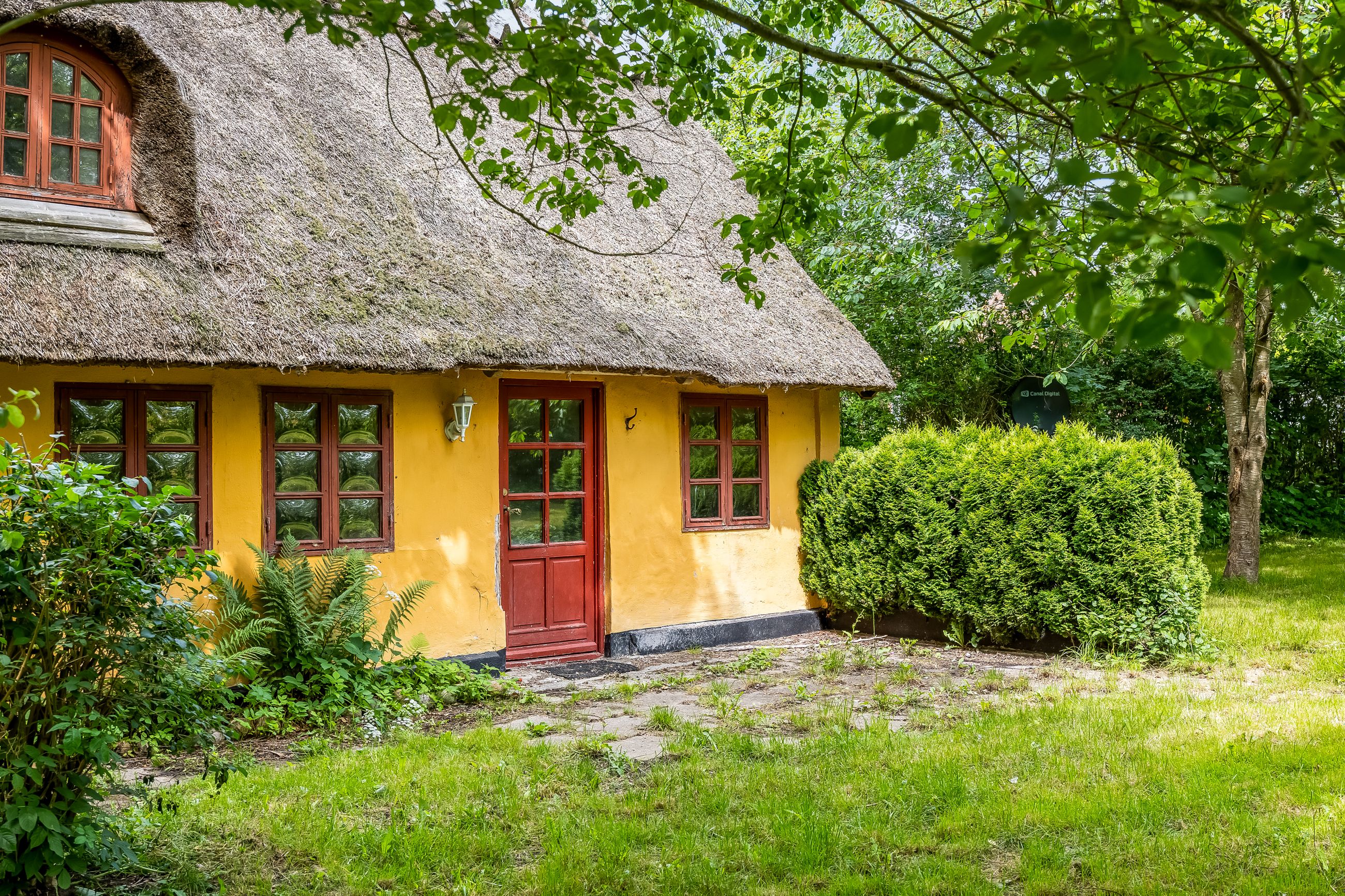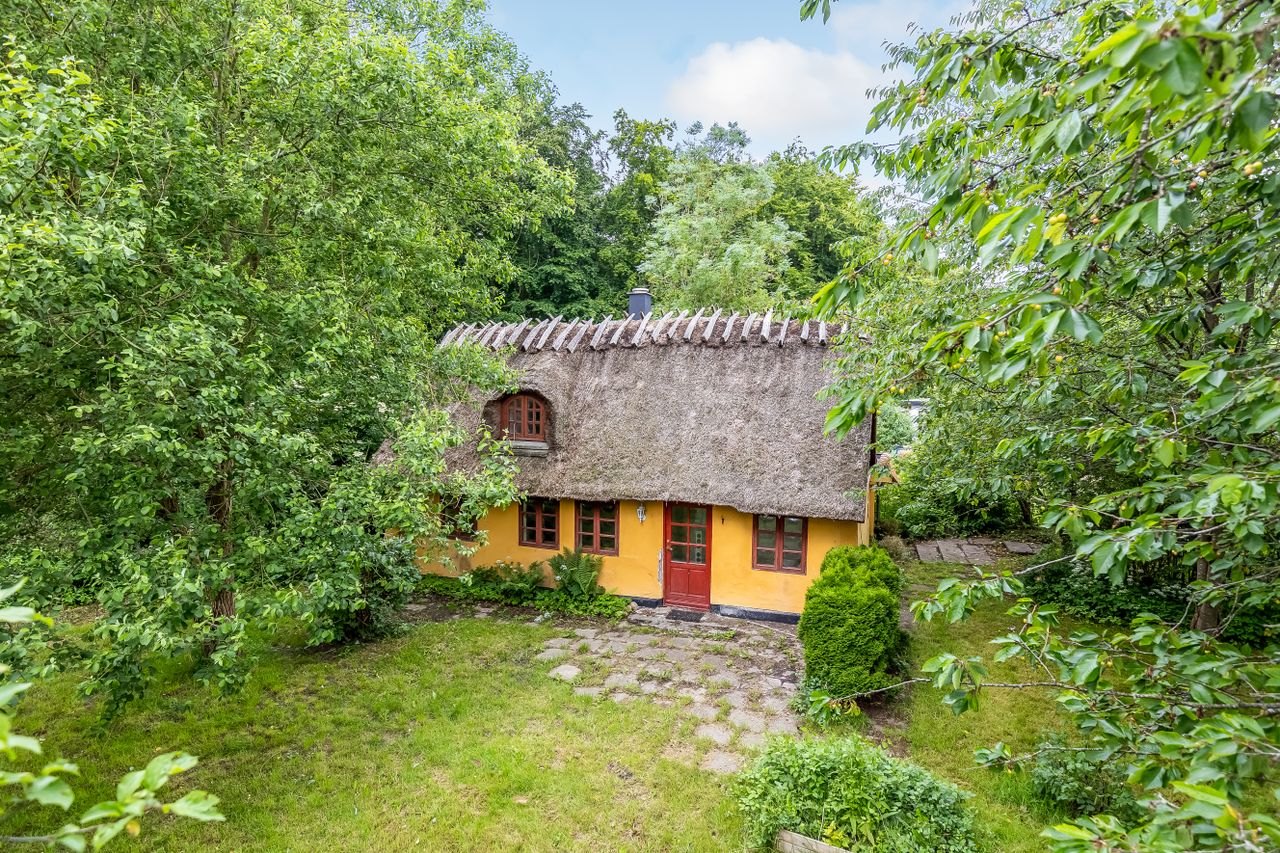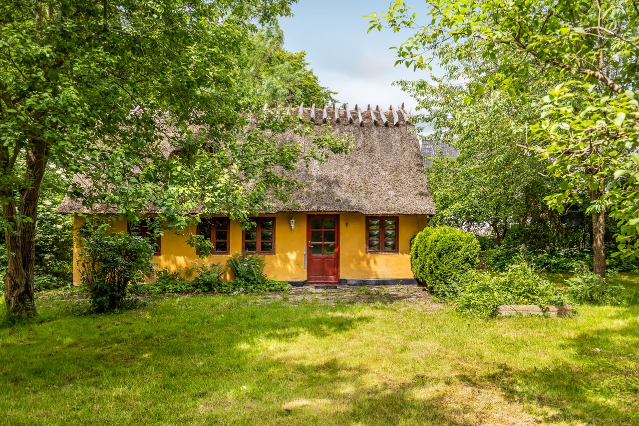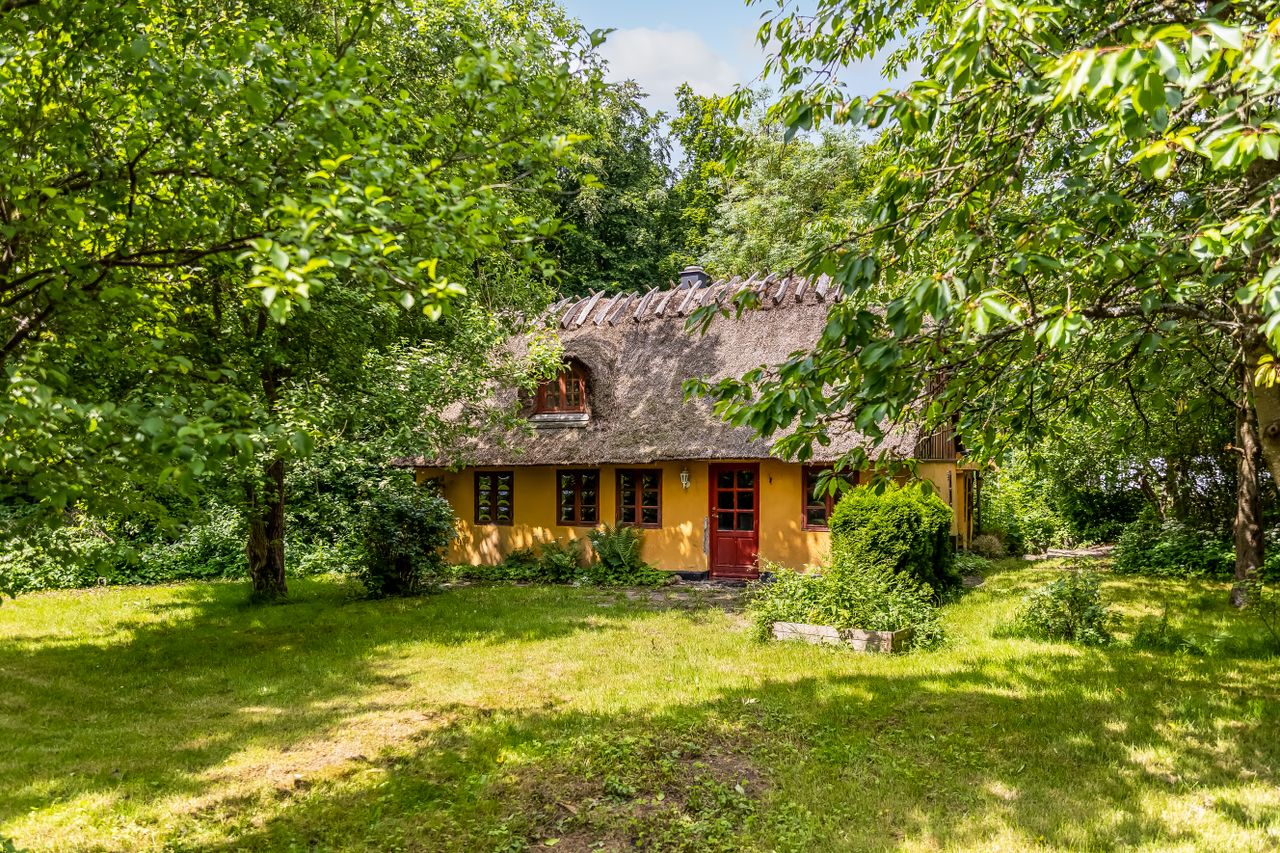 Huset fremstår med gulkalkede facader, stråtag på forhuset og tagpap på bagbygningen. Der er installeret billig fjernvarme og termovinduer, så nogle af de vigtige opgraderinger er allerede på plads.