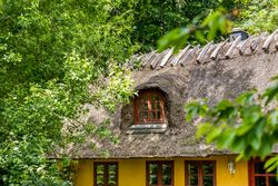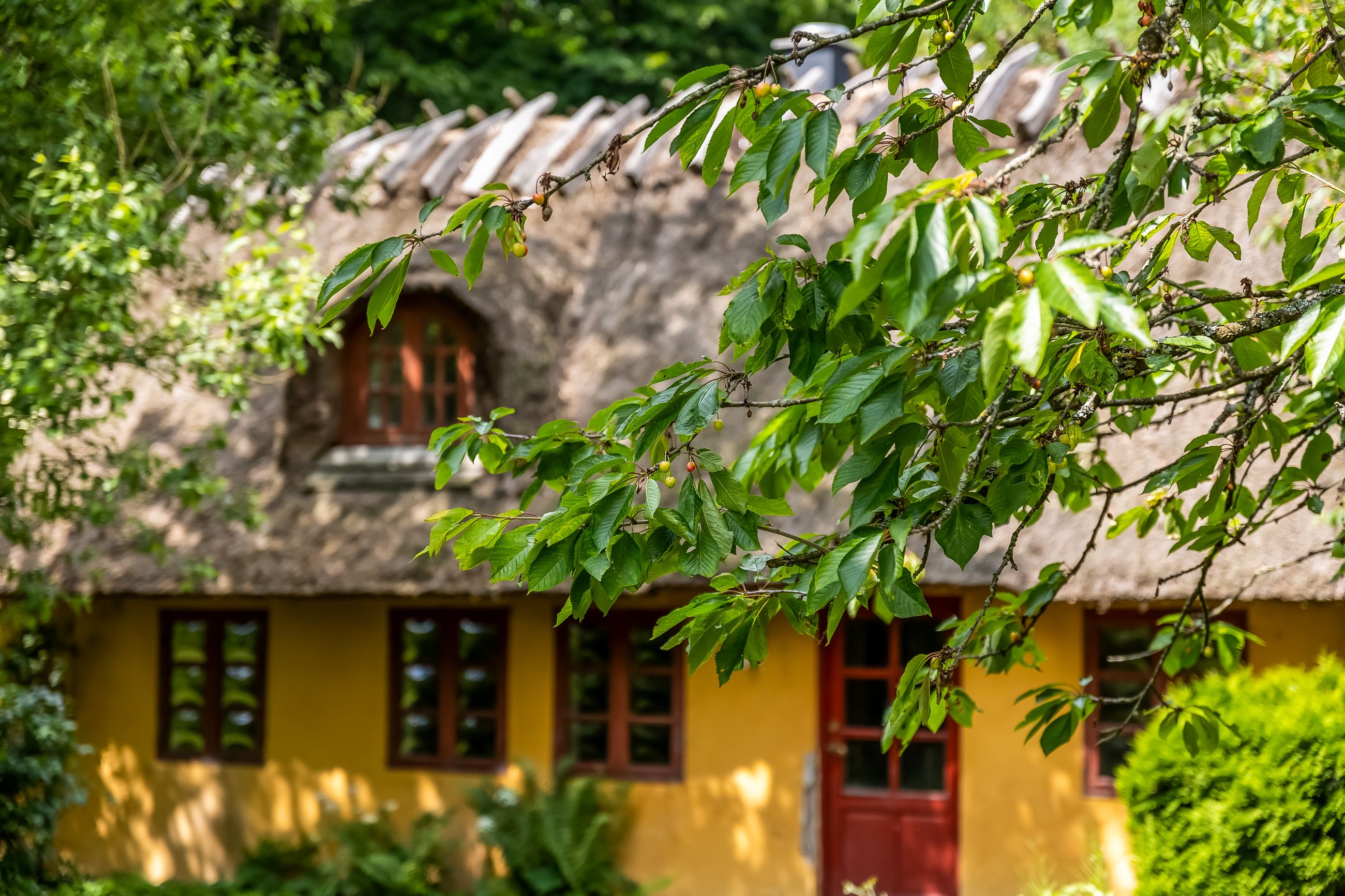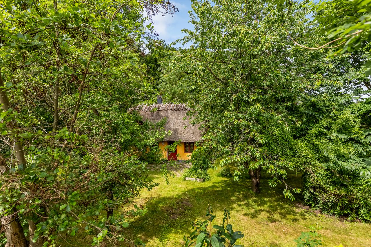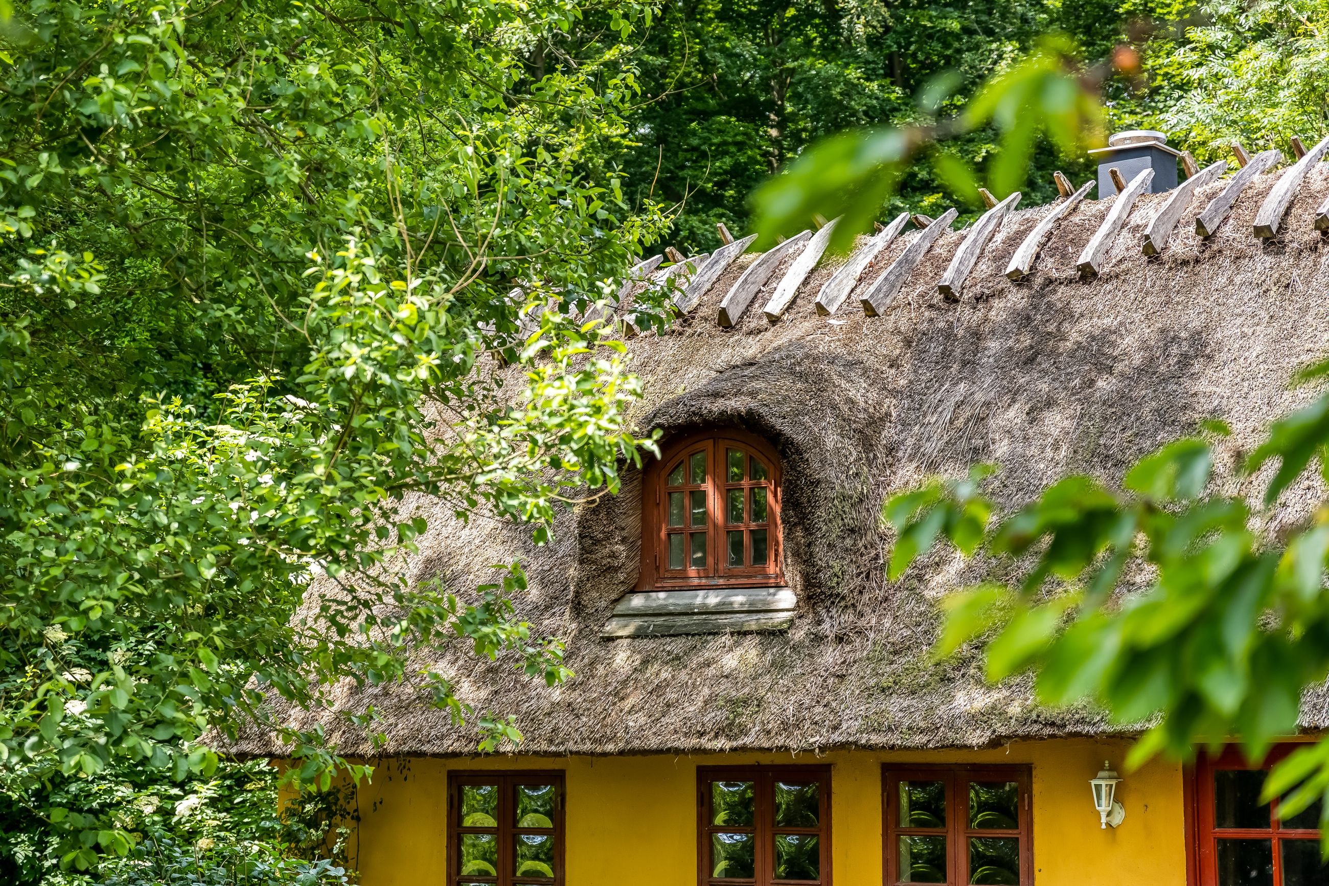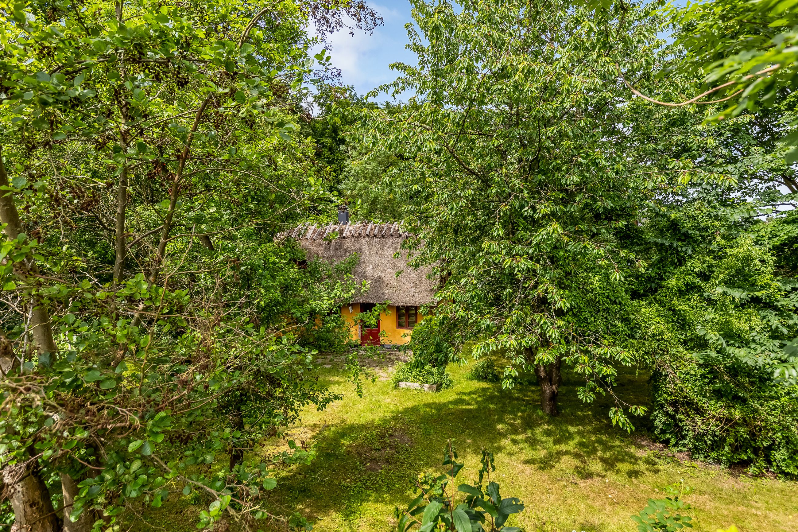 Huset fremstår med gulkalkede facader, stråtag på forhuset og tagpap på bagbygningen. Der er installeret billig fjernvarme og termovinduer, så nogle af de vigtige opgraderinger er allerede på plads.