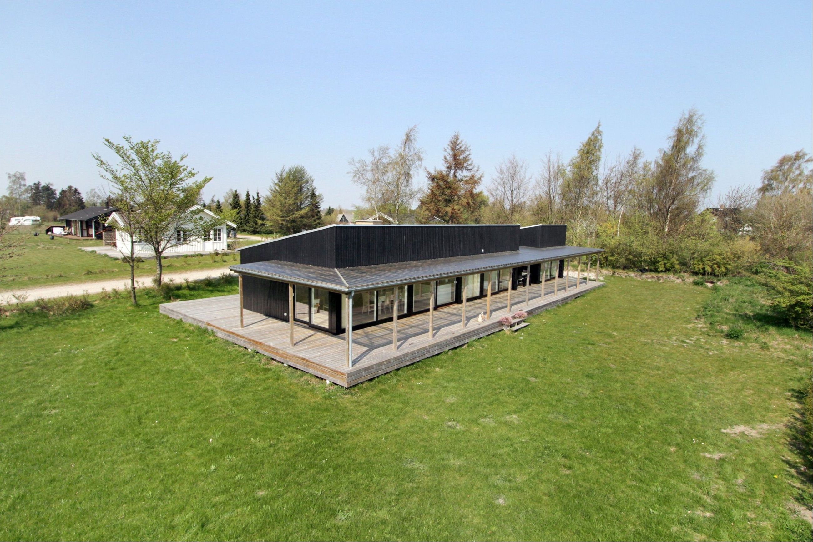 Spændende og enestående fritidshus med et boligareal på 103 m2 + 6 m2 udestue (mellemgang) i glas, opført i 2009 i træ med tag i tappap med ensidigt fald, masser af store vinduespartier med energiglas vendt mod vandet og tagrender. Enorm træterrasse på hele 90 m2 med større overdækning/pergola.
