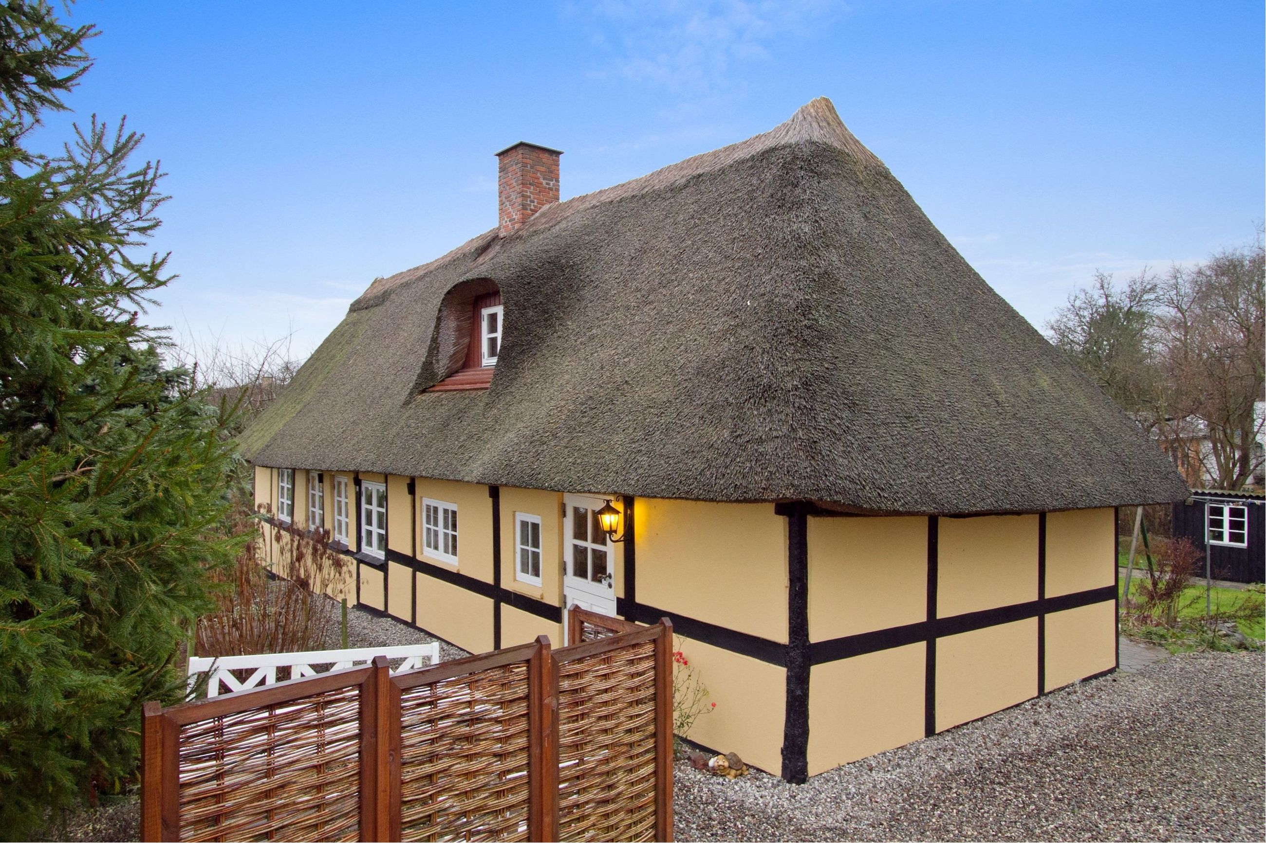 Ejendommen fremtræder velholdt og er i bindingsværk med stråtag og der er værksted/brændehus samt mindre brændeskur og flere hyggekroge. Grunden på 986 m2 er opdelt i flere afdelinger med dejlige hyggekroge, legeplads m.v. , frugttræer og buske og ligger direkte ud til åbne marker og off. vej.