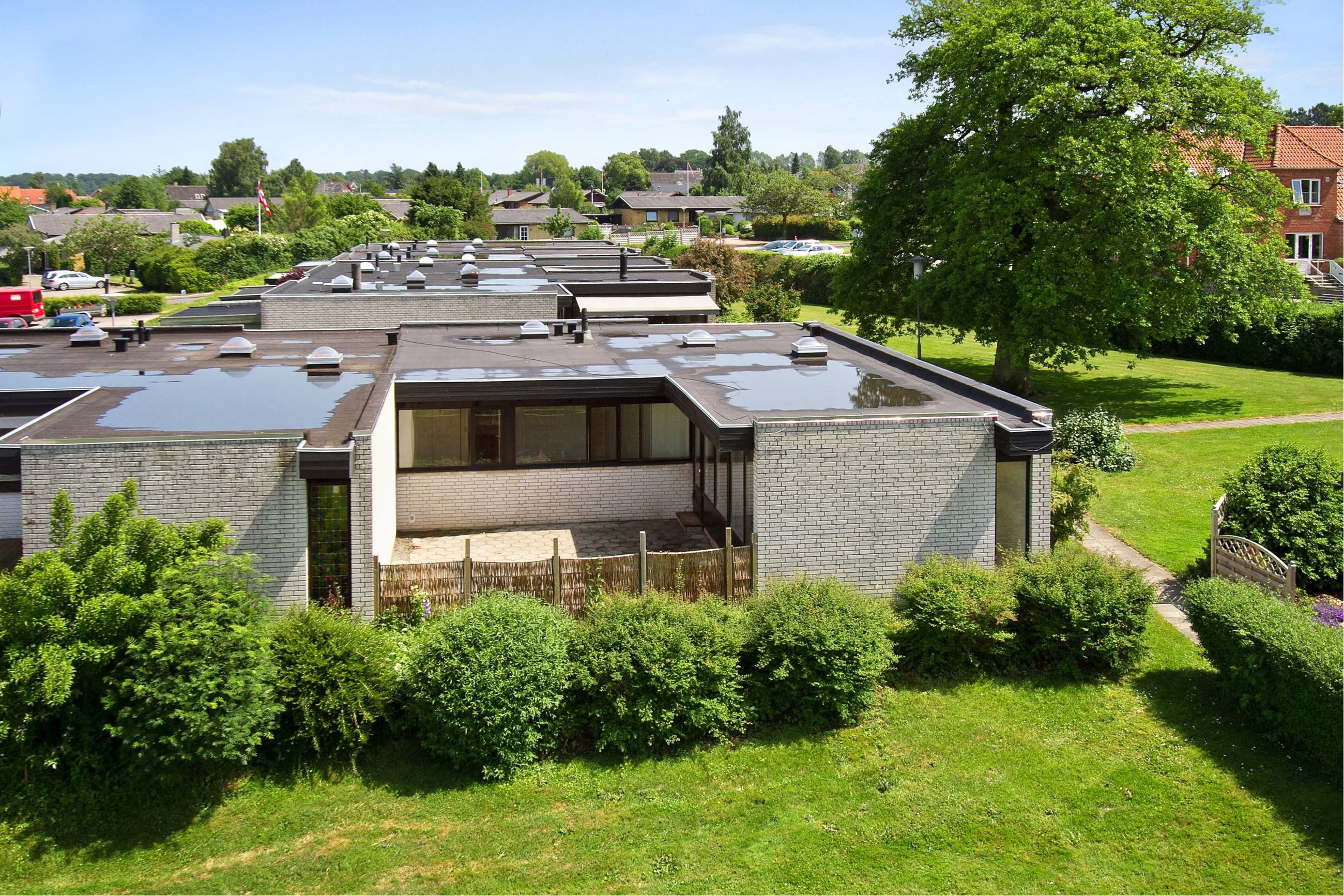 Særdeles velindrettet og vinkelbygget rækkehus i 1 plan på 114 m2, opført i 1971 i hvide sten med renoveret build-up-tag (2012) og skylights samt termovinduer.