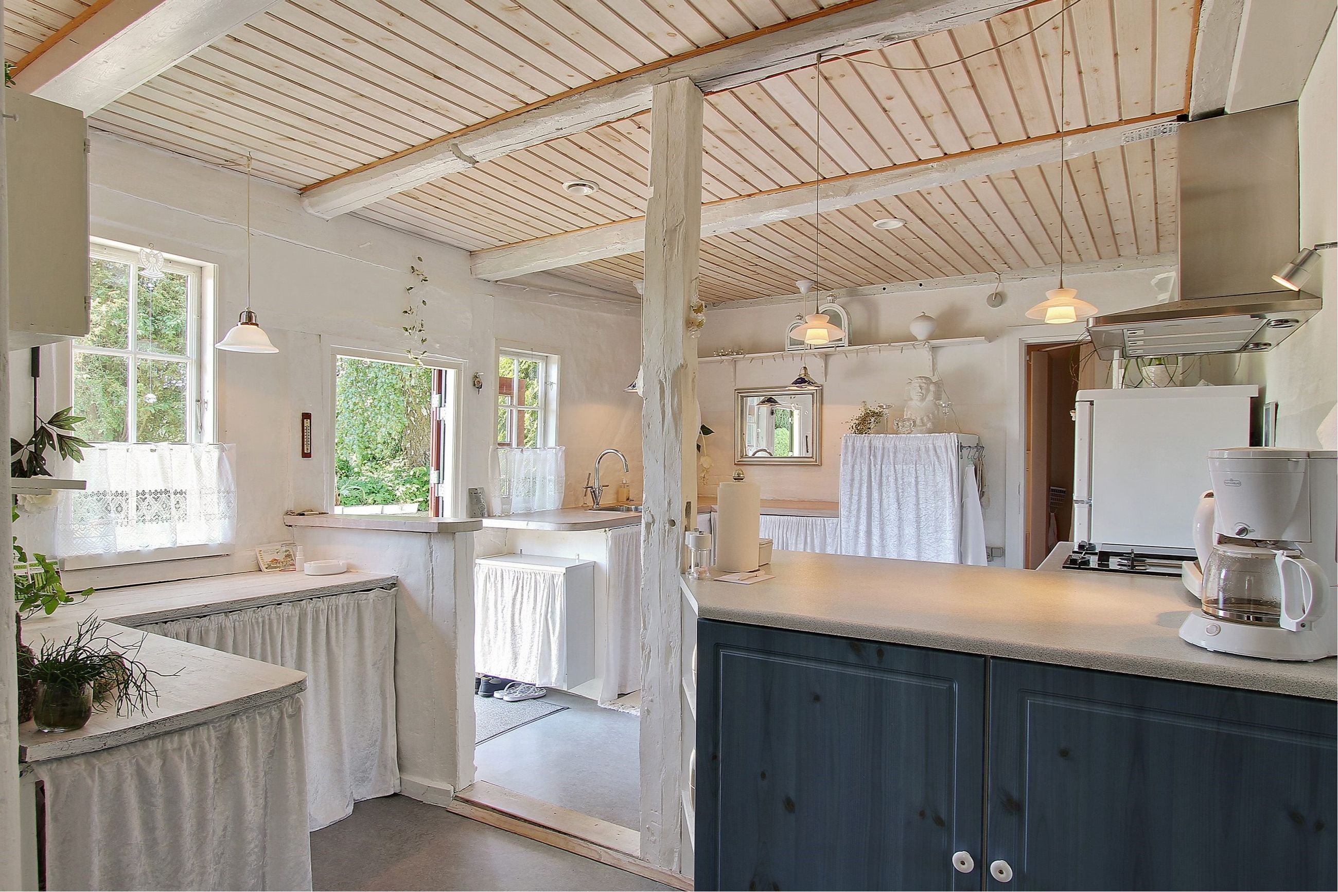 Indgang via lav oprindelig dør til flot moderniseret køkken med linoleumsgulv med varme, træloft og varmepumpe, og i den ene ende af køkkenet står dele af det oprindelige køkken, fra køkken adgang til rustikt badeværelse med gulvvarme, søjlehåndvask og muret bruseniche, fra køkken er mellemgang med det gamle originale brændekomfur og adgang til spise-/opholdsstue med udsigt til markerne, flot plankegulv og udgang til haven, oprindelig entre, der anvendes som depotrum/opbevaring, lyst soveværelse med ældre trægulv og flot udsigt til markerne, værelse/kontor med ældre trægulv og vindue mod haven. Fra mellemgang er der trappe til repos med videre trappe til 1. sal, der er ét stort rum med flot lysindfald og synlige hanebånd. Ved trappen er indrettet garderobeafdeling mens resten af 1. sal er stue/soveværelse med brændeovn.