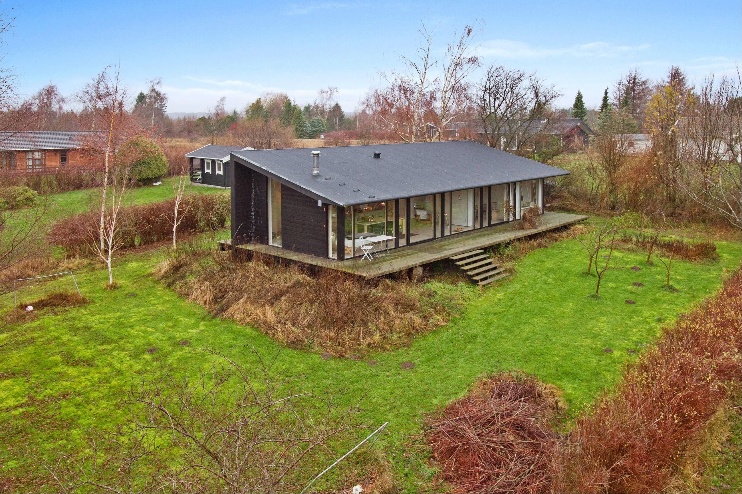 Pæn entre med vaskemaskine og skydedør i træ, pragtfuld stor og lys stue/alrum med stort vinduesparti, trægulv, vandudsigt, skråloft, brændeovn og skydedør med glas til bred østvendt træterrasse, åbent og moderne køkken i stål med trægulv, skråloft, hvidevarer, vandkig og udgang til vestvendt terrasse via dobbelt glasdør, lækkert badeværelse med skråloft, mørkt klinkegulv, gulvvarme, vægge med blå stiftmosaik, bruseniche, toilet, håndvask og bademiljø, rart depotrum med skydedør i træ, lyst værelse med flytbare vægge, trægulv, skråloft og skydedør til østvendt træterrasse med vandudsigt, mellemgang med trægulv, stort soveværelse med flytbare vægge, trægulv, skråloft og udgang til nordvendt træterrasse samt indbygget garderobeskab... Læs mindre...