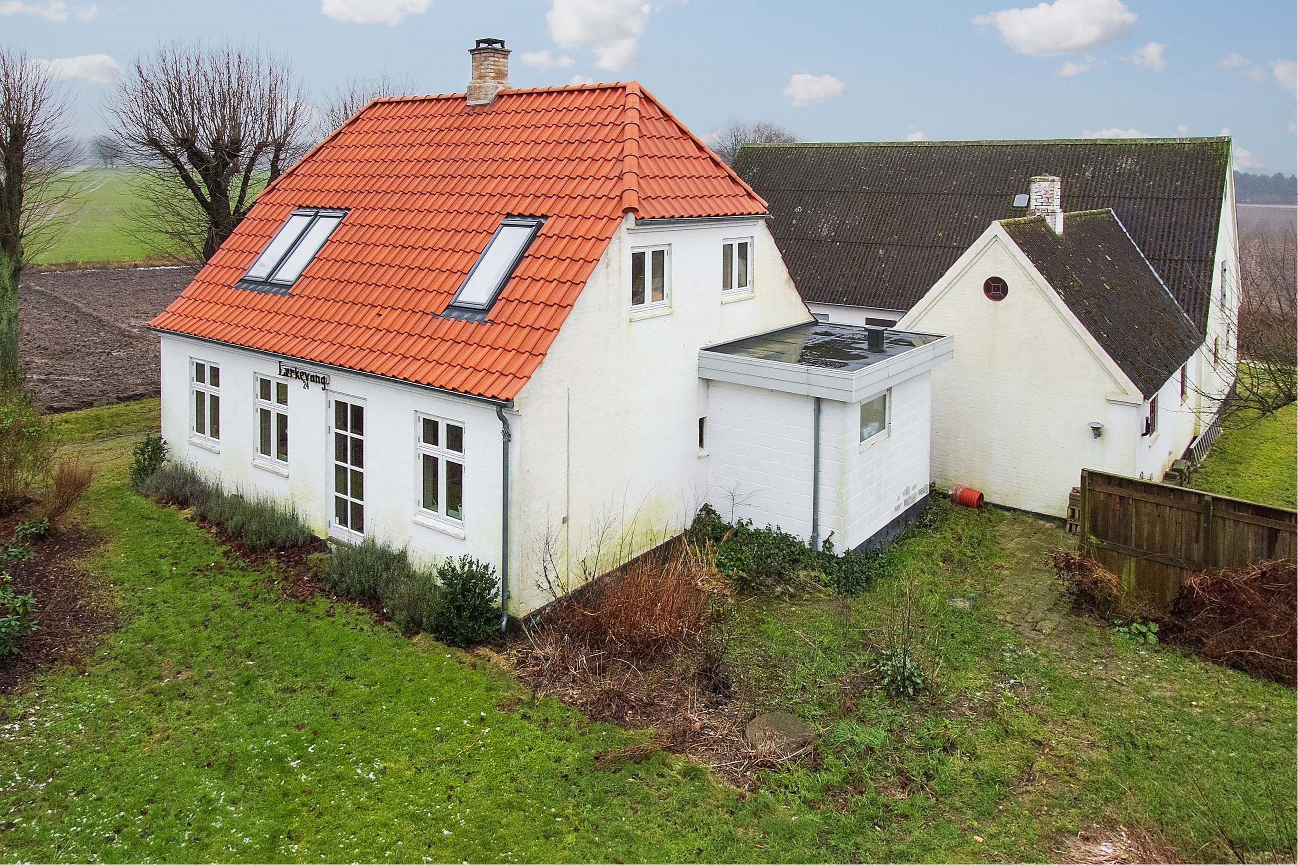 Flot originalt stuehus i 2 plan, opført i 1938 i hvidmalet mursten med et smukt rødt tegltag fra 2013, energivinduer fra 2007, nyere Veluxvinduer, nyere el i hele boligen, tagrender og et lyst og spændende boligareal på 121 m2, hvoraf 1. salen er nyetableret, velisoleret og særdeles indbydende med den skønneste udsigt over det åbne landskab. Off. kloak, alment vandværk, oliefyr og brændeovn.