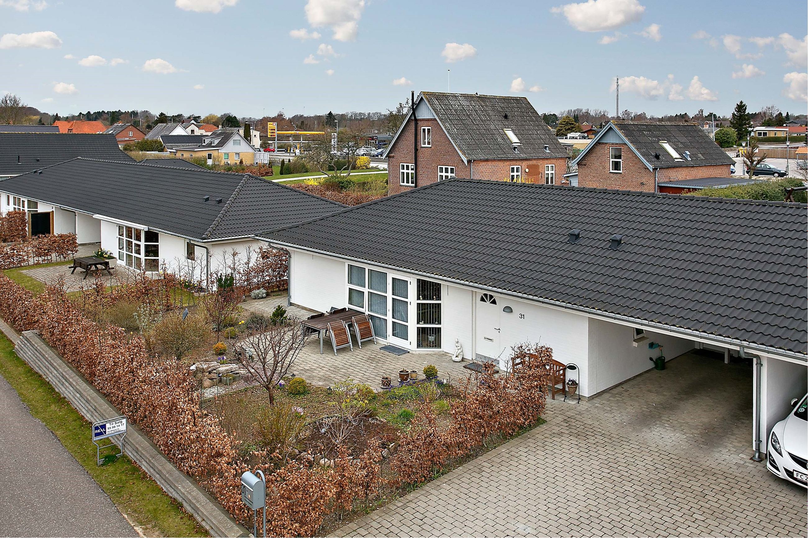 Flot og elegant enderækkehus i 1 plan med et boligareal på 110 m2 + 25 m2 carport/udhus, opført af Danflex Huse i 2008 med smukke hvide filtsede facader, tag i mørk cementsten, vinduer og døre med lavenergiruder, tagrender, glaskarnap, gasfyr, gulvvarme overalt med individuel rumstyring, grundejerforening, off. kloak, Stensved Vandværk og mulighed for fællesantenne/internet. Energimærke B sikrer samtidig en fair varmeøkonomi.