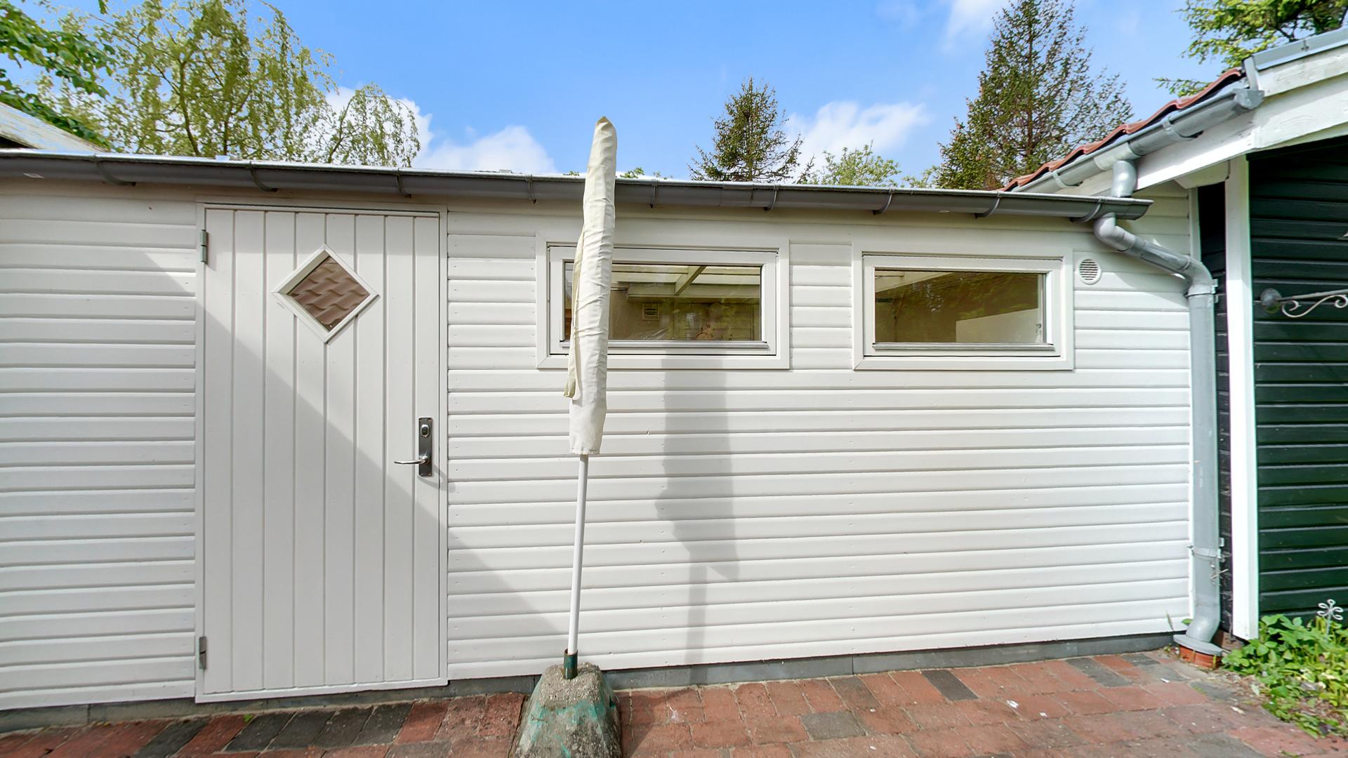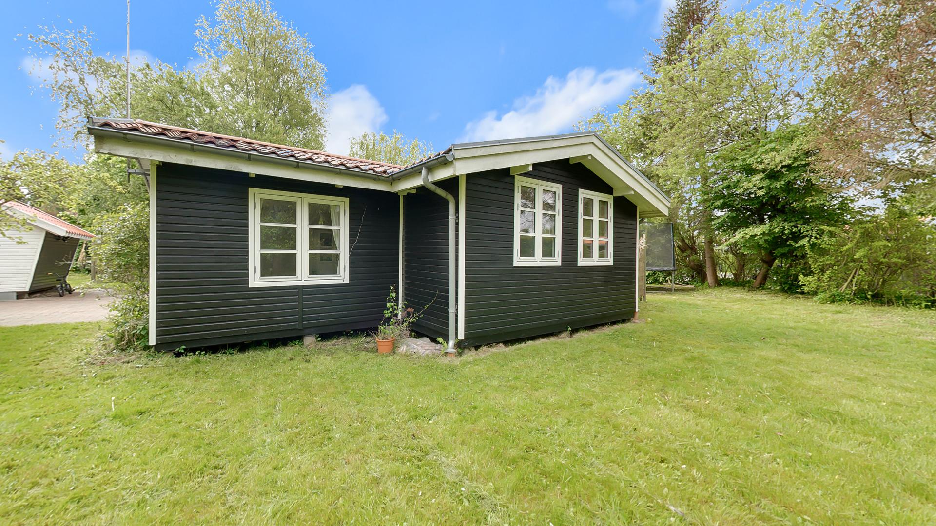 Tilbage på Hvidklirevej 2 præsenterer fritidshuset sig særdeles nydeligt med sortmalet facade, rødt tag og hvide, sprossede termovinduer. En del af træbeklædningen er udskiftet i 2021. Omkring ejendommen breder sig en fortræffelig have med hængepil og frugttræer, og den tætte randbeplantning sørger for et rart udeliv.