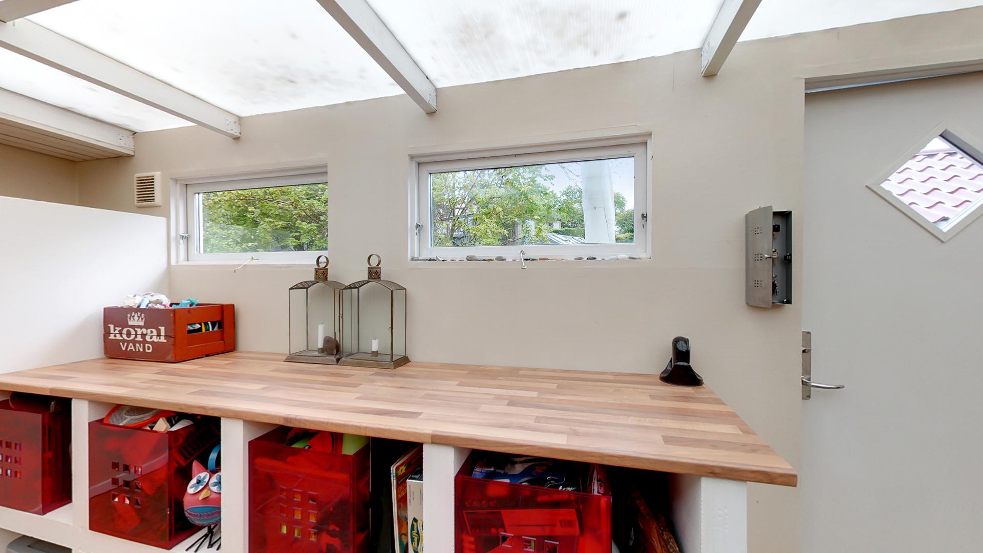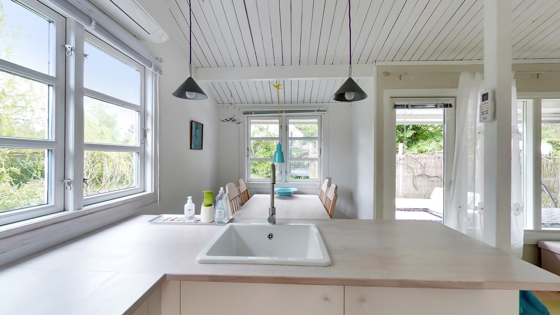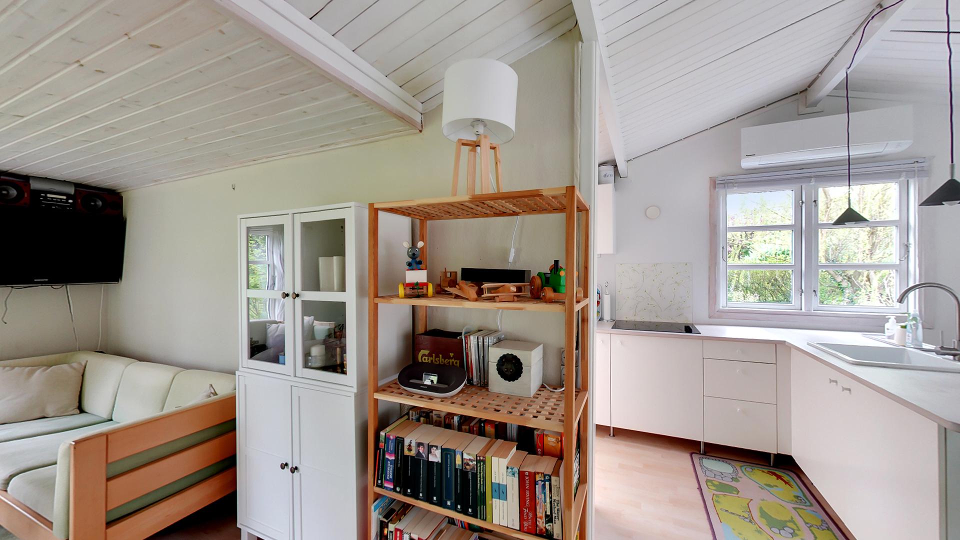 Inden døre åbenbarer sig 47 moderne kvadratmeter med en yderst behagelig atmosfære. Det åbne opholdsmiljø med loft til kip og laminatgulv i lys Ask udgør boligens primære opholdsmiljø, og rummet løfter også sløret for det stilrene, hvide køkken med hvidpigmenteret træbordplade i ask. I tilknytning til alrummet er der to fine værelser. Badeværelset befinder sig separat med toilet og en bruseniche med italienske fliser, og de to afdelinger er bundet sammen af udestuen, der ligeledes fungerer som entré. Endelig er der også et fritstående udhus i boligstandard.