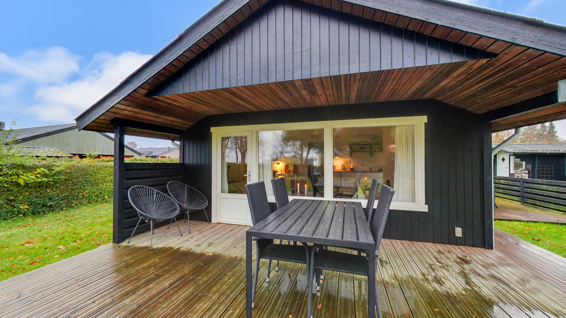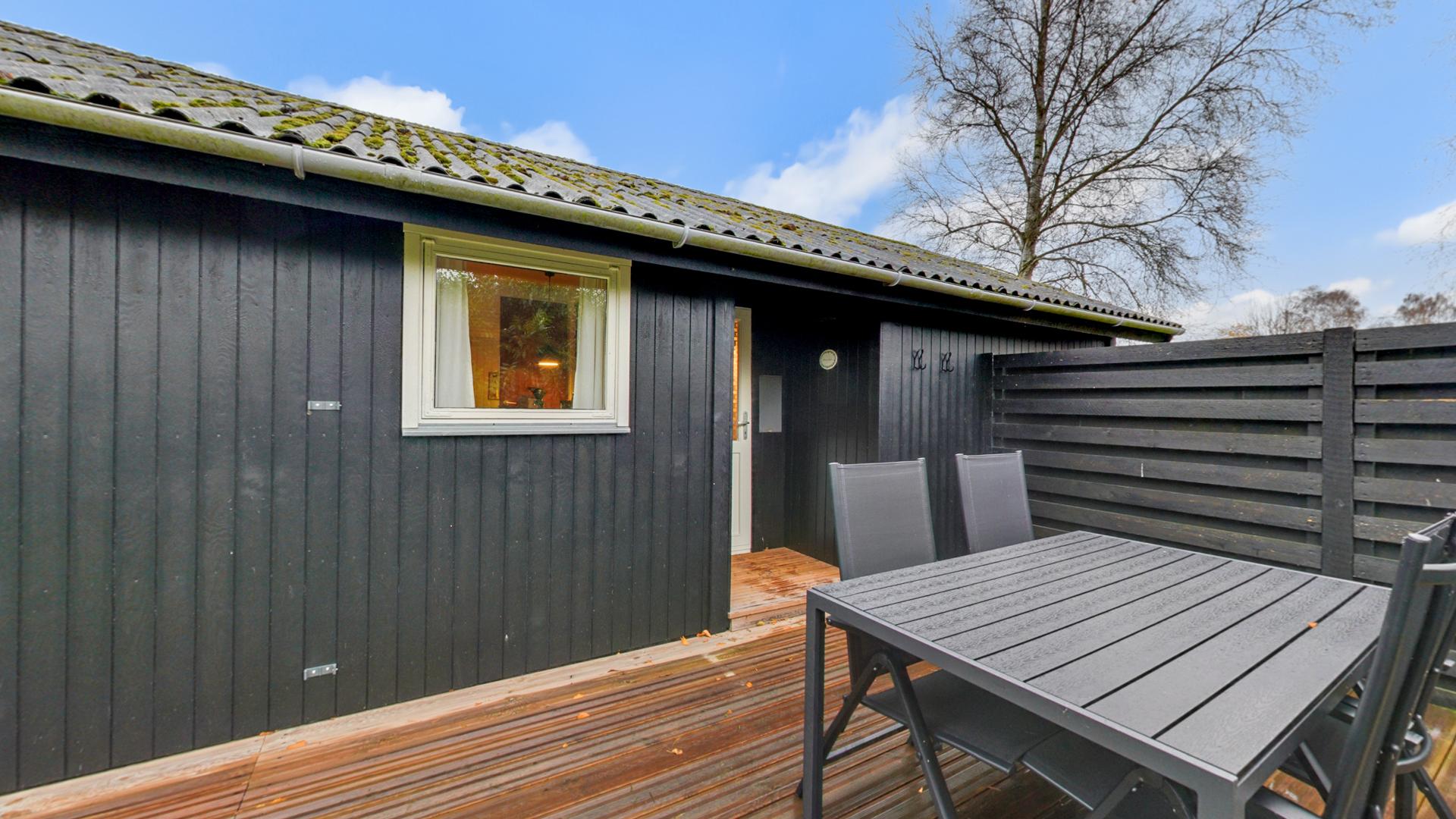 Grundstykket er grønt og hyggeligt med hæk, græs og et kæmpe terrasseområde i træ, der er forhøjet og etableret i perioden 2017-2018. Den herlige terrasse giver desuden en virkelig flot udsigt til Stubbekøbing havn og færgen, der sejler mellem byen og Bogø.