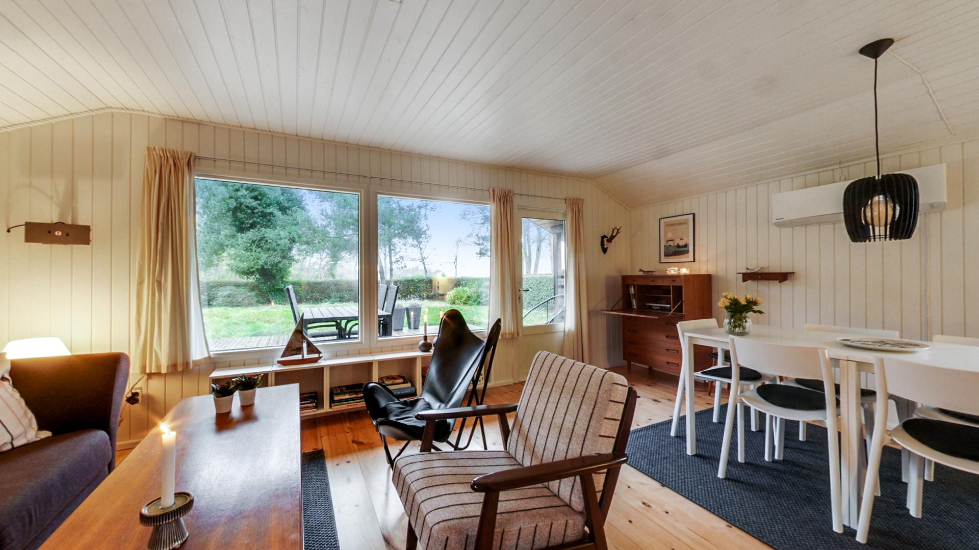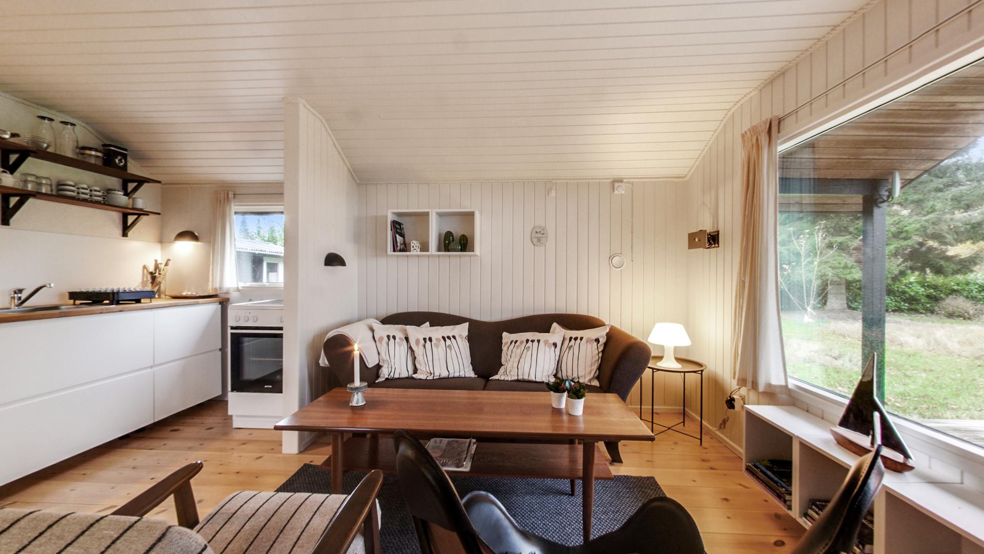Indenfor møder I en dejlig stemning, som understreges af udsigten til vandet gennem de markante vinduer. Opholdsrummet med terrassedør forener stue, spisestue og IKEA-køkkenet, sidstnævnet blev moderniseret i 2017. Der er også to fine værelser og et badeværelse.