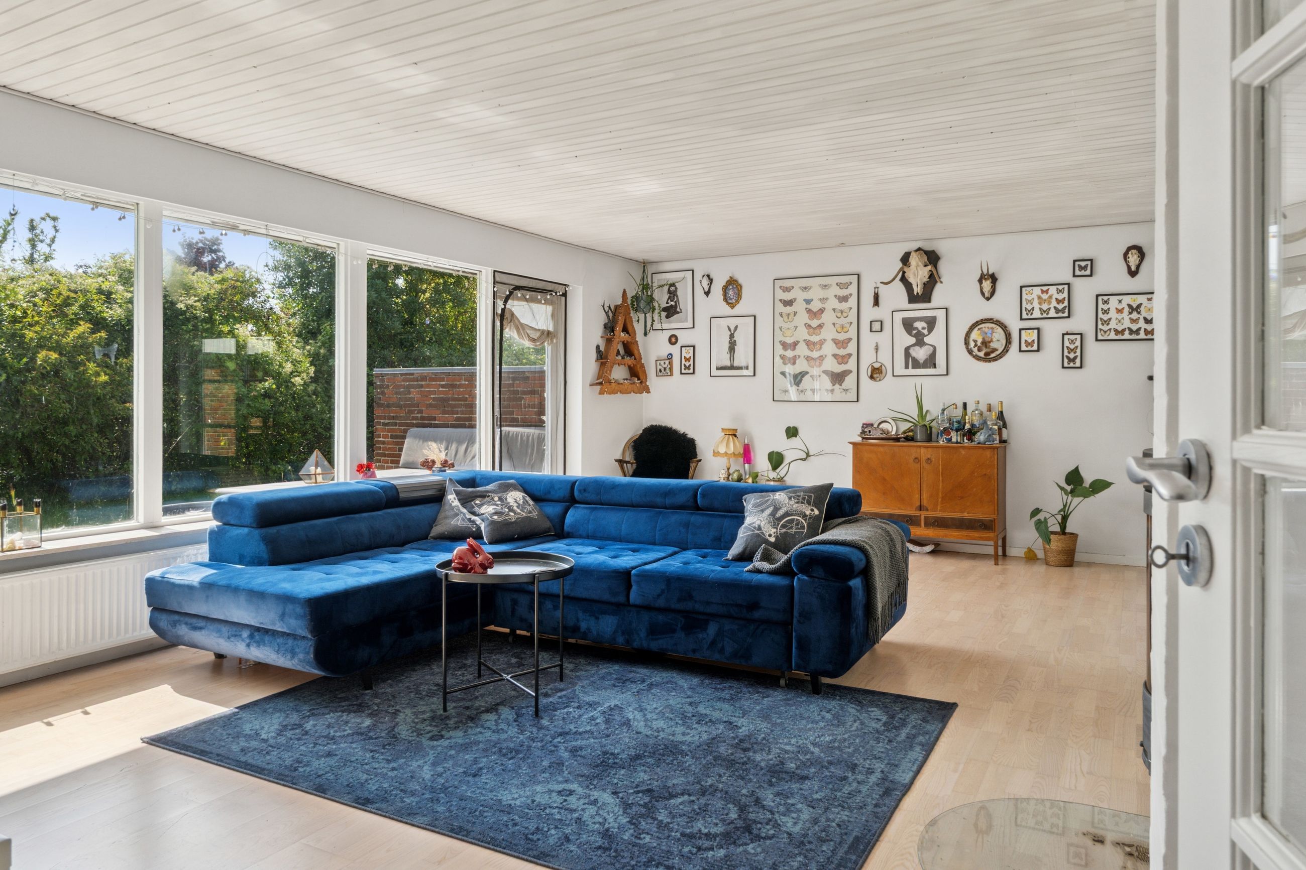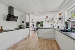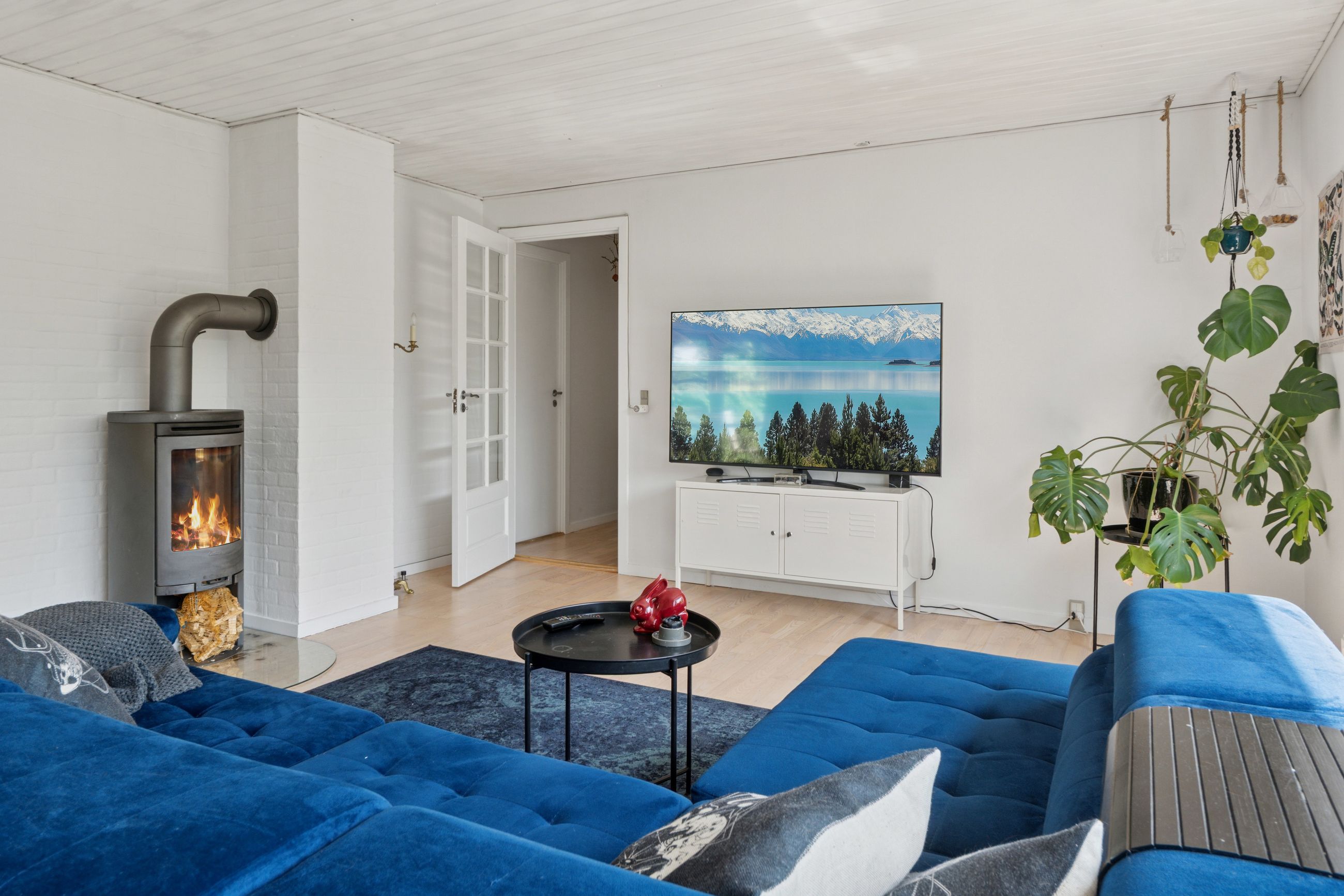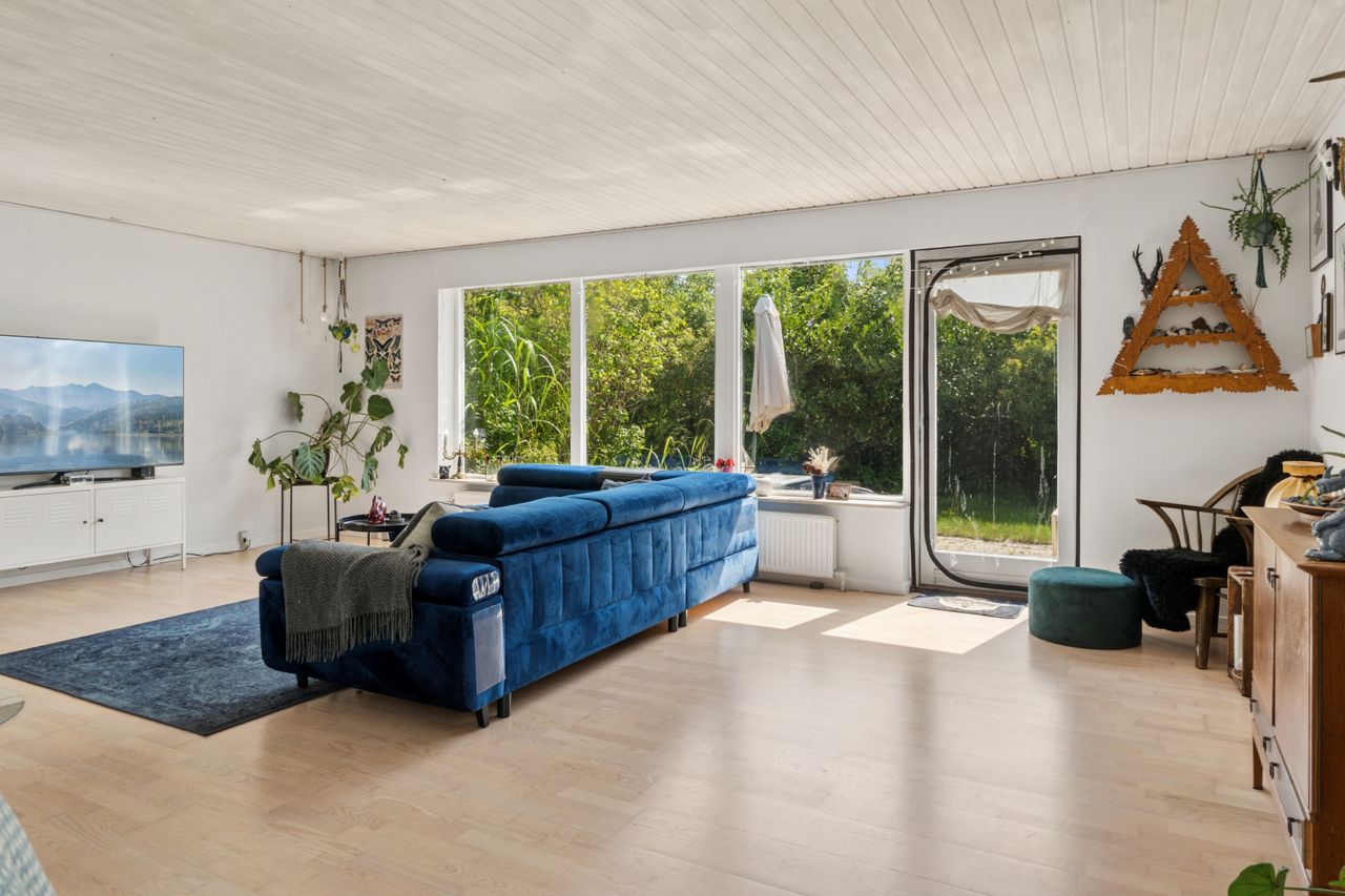 Stuen er lys og luftig og har store vinduespartier. Der er som sagt også brændeovn, og både her og ved køkkensektionen er der terrassedør til udemiljøet.