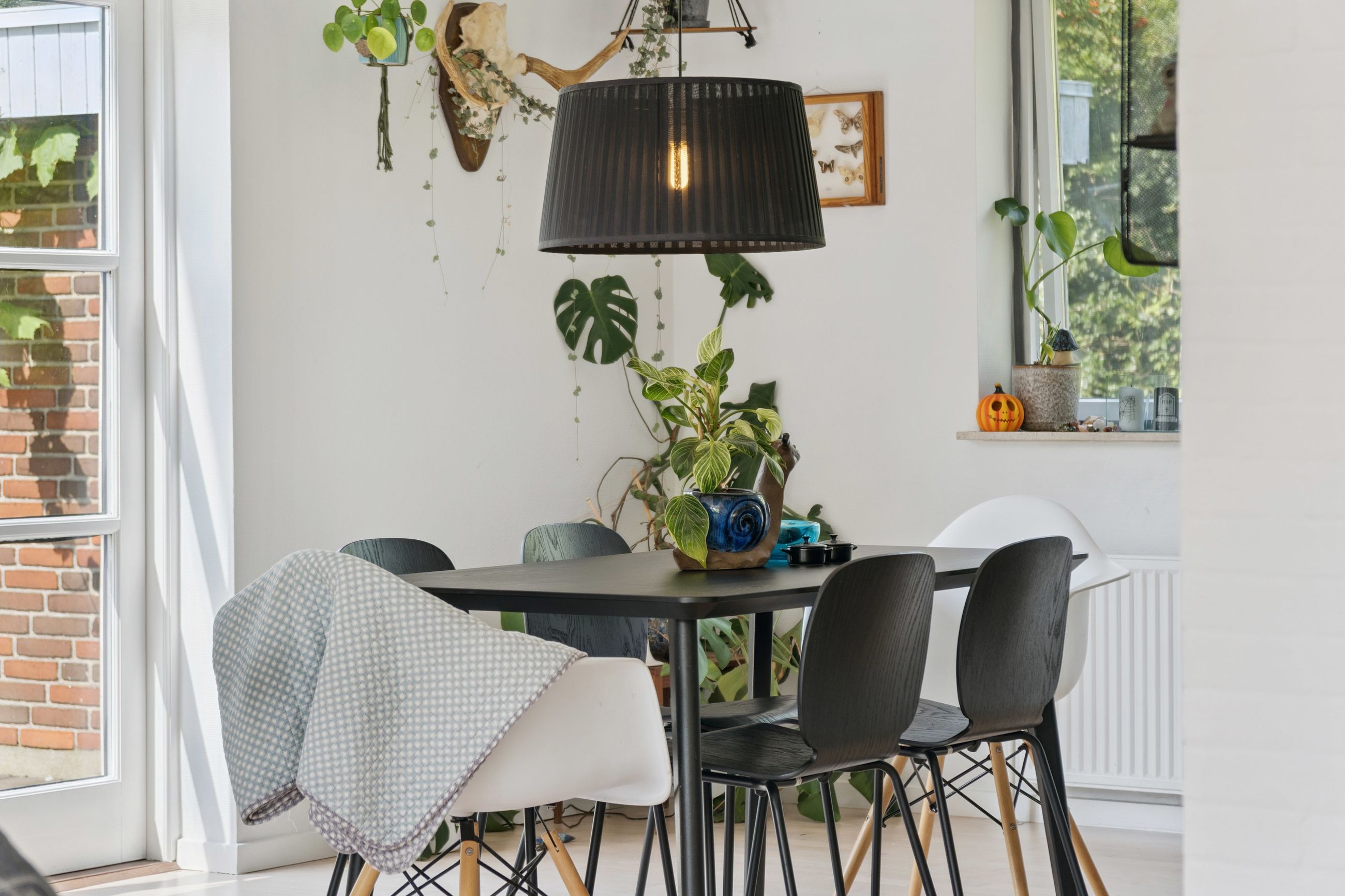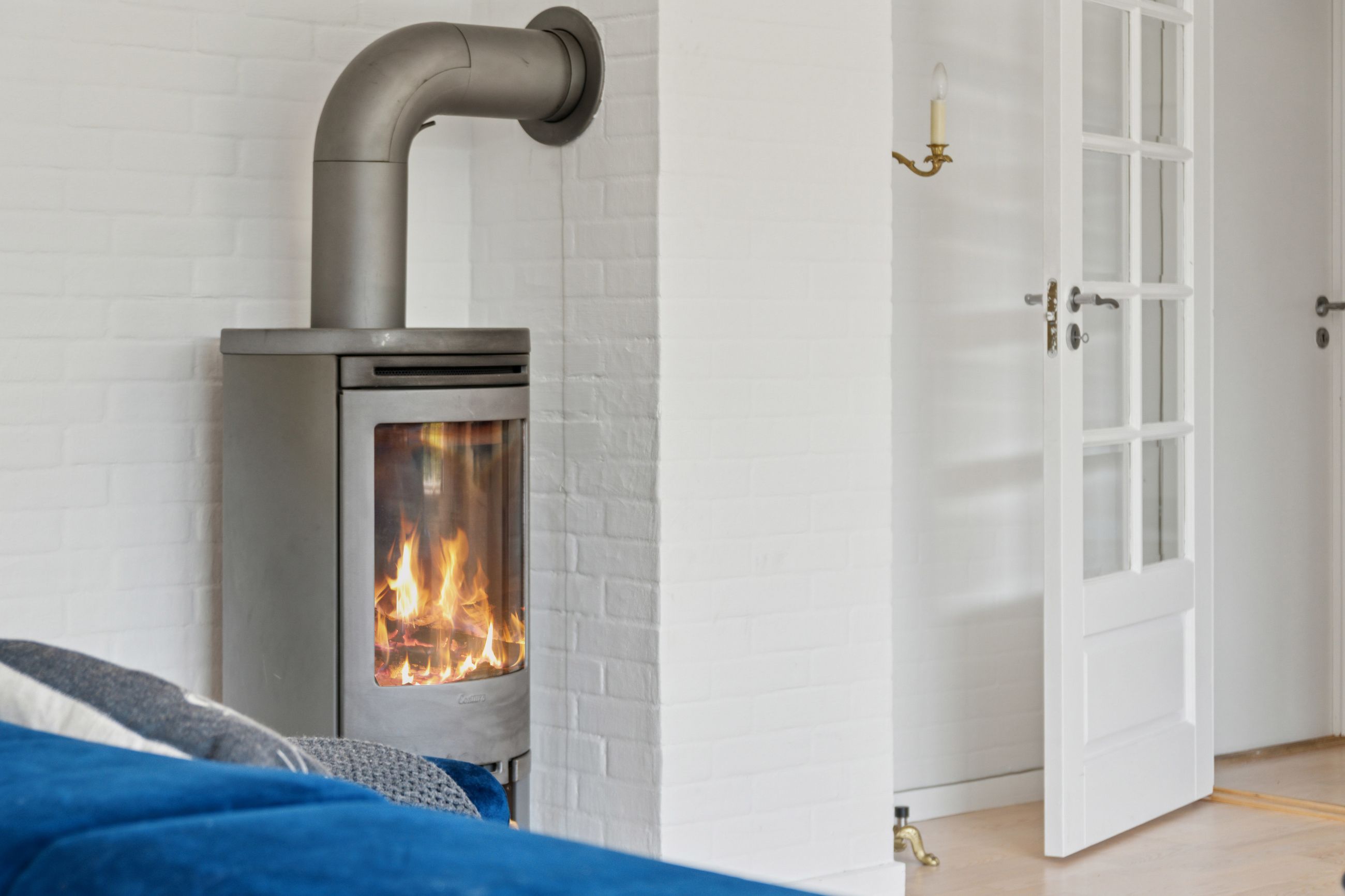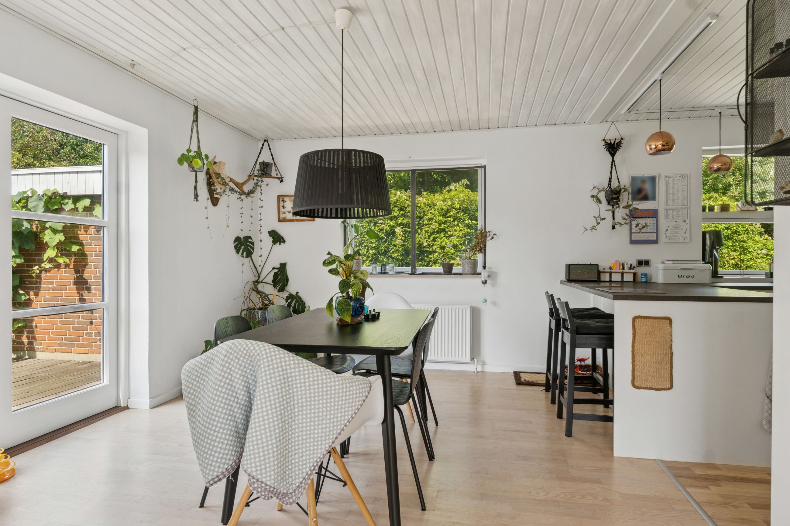 Stuen er lys og luftig og har store vinduespartier. Der er som sagt også brændeovn, og både her og ved køkkensektionen er der terrassedør til udemiljøet.