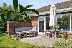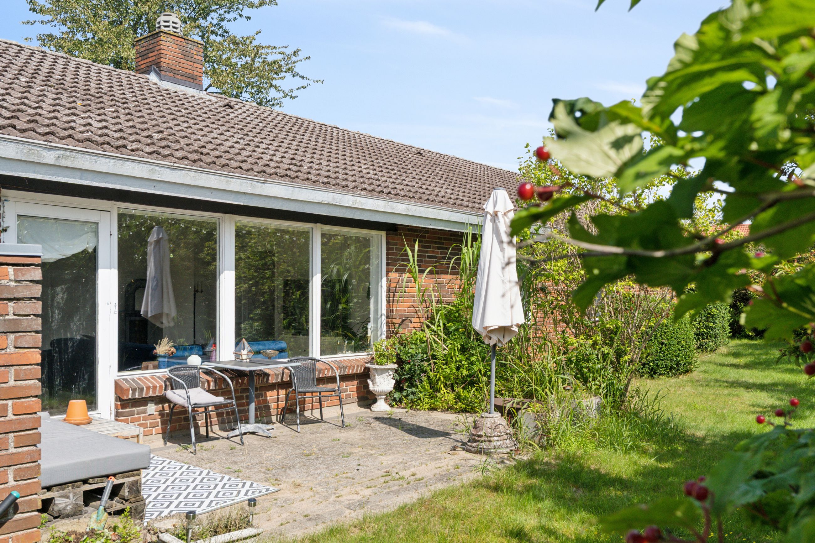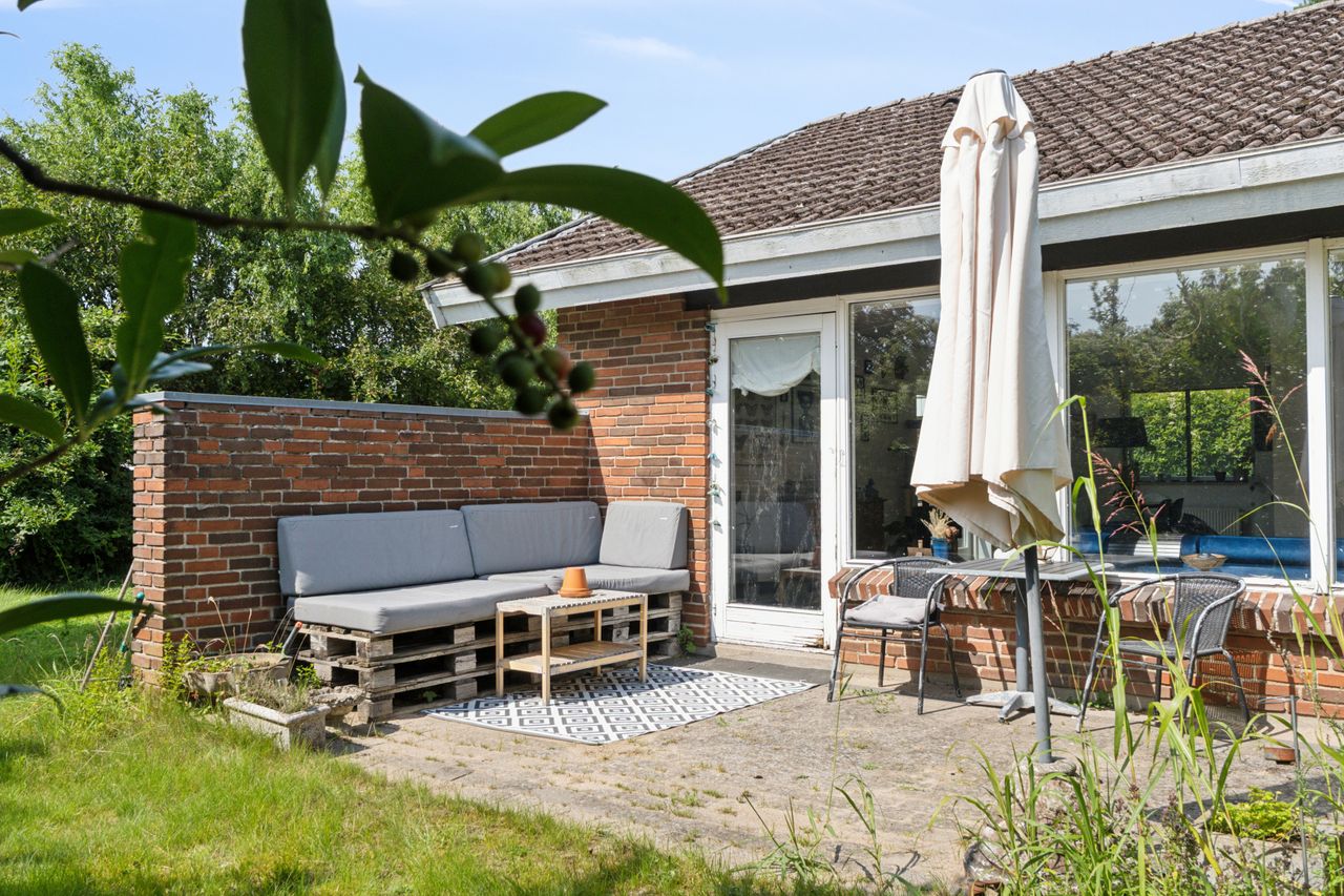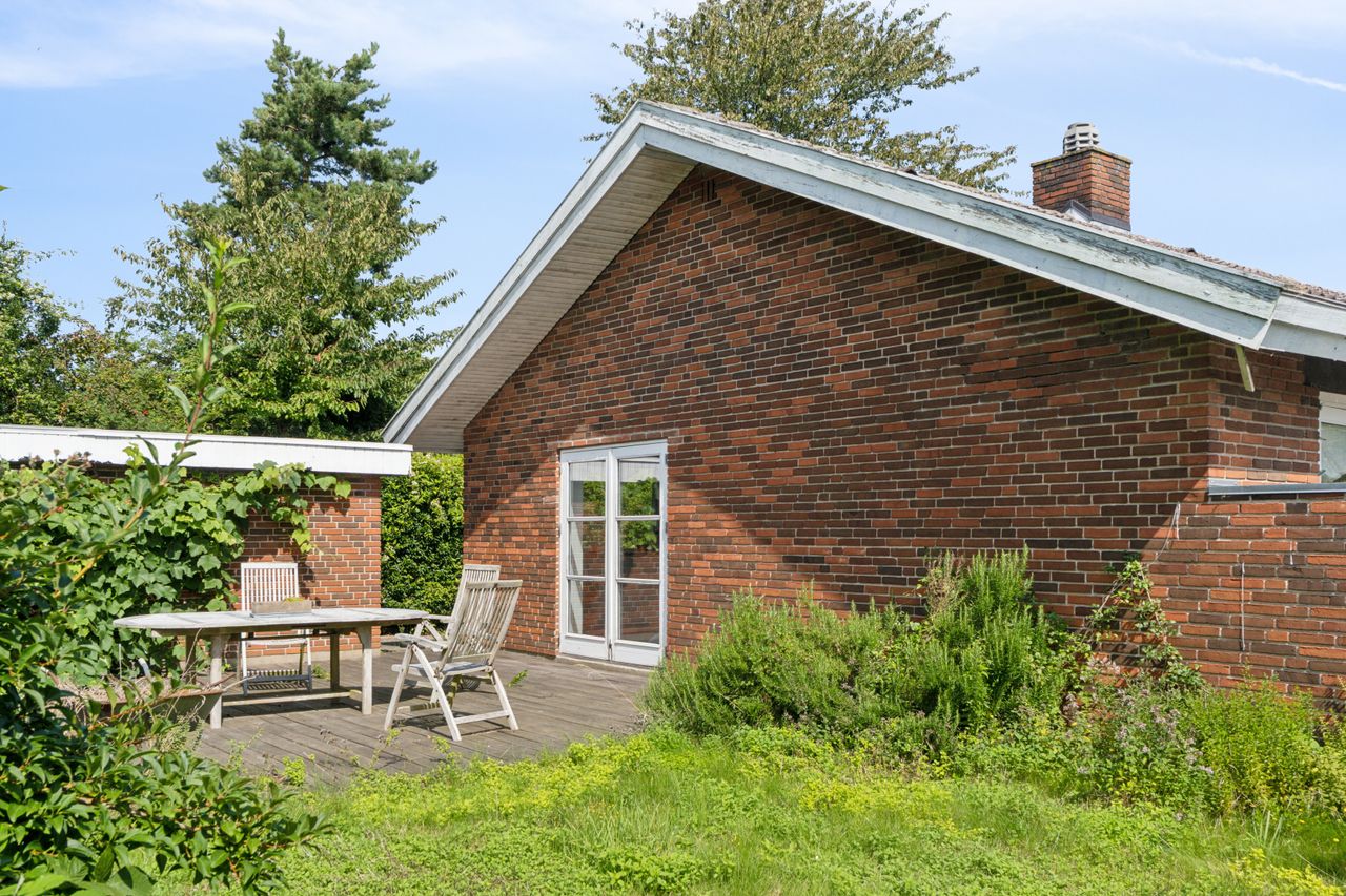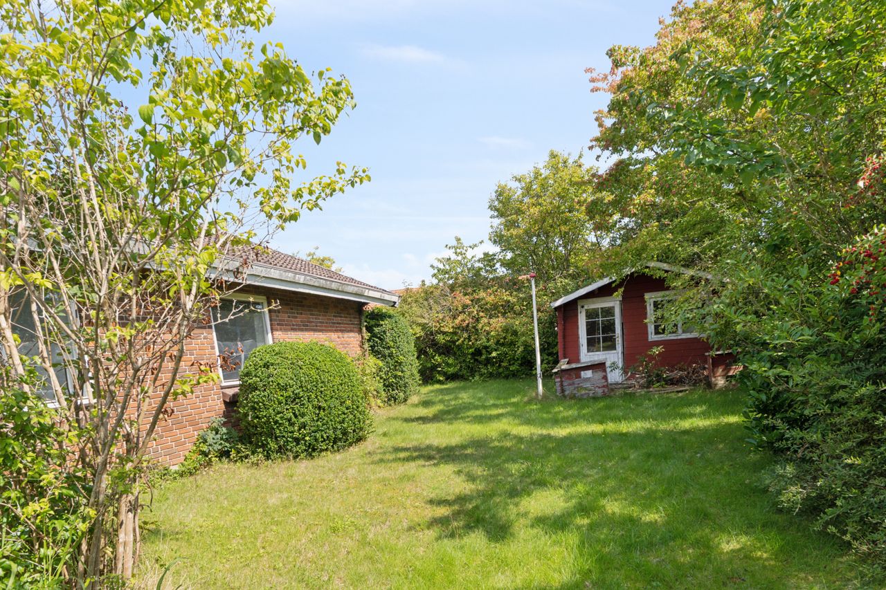 Haven er anlagt, så der uanset sæsonen altid er noget kønt at se på. Den frodige beplantning inkluderer såvel bærbuske som frugttræer, og det lune vejr kan nydes på de to terrasser, som vender perfekt i forhold til solen. Med til ejendommen følger endvidere en muret garage, der er på 25 m2.