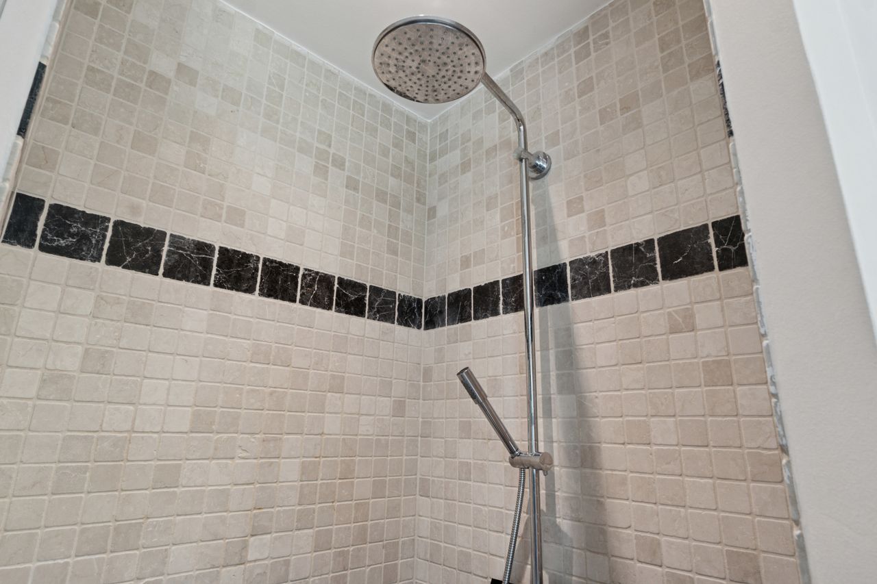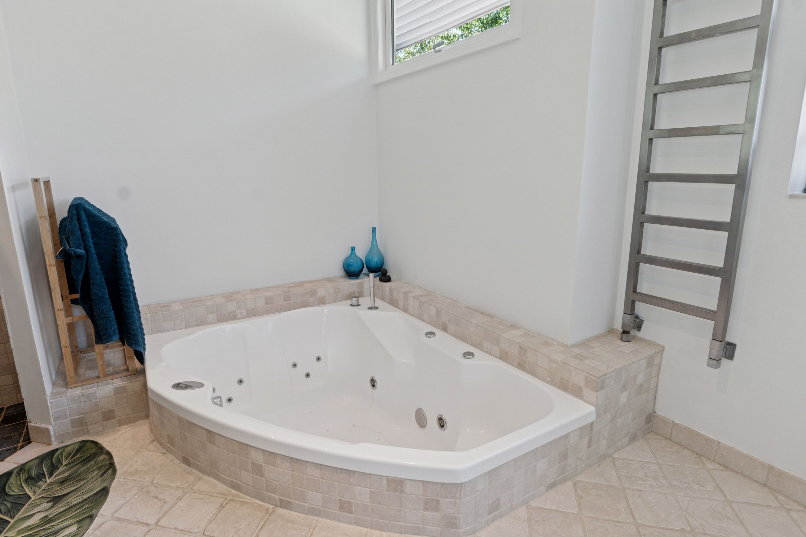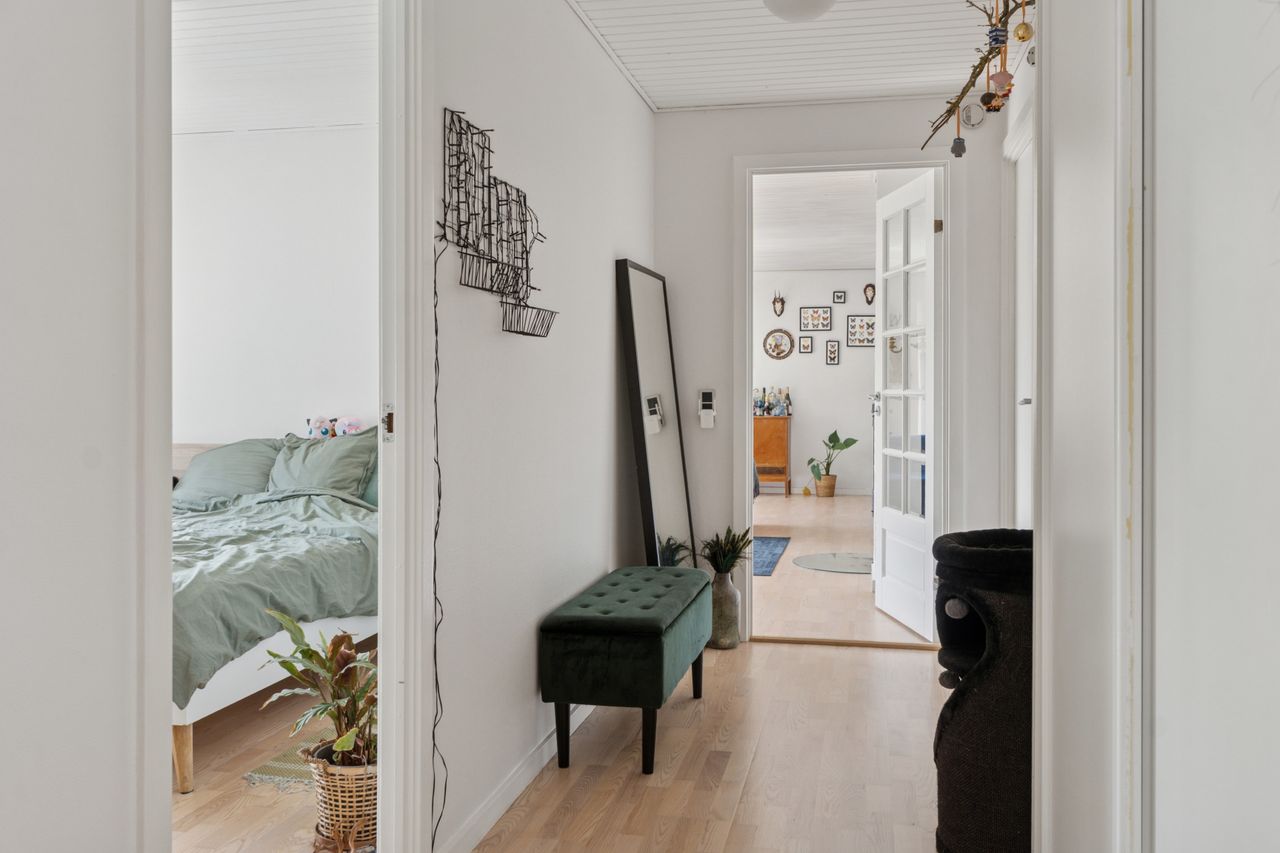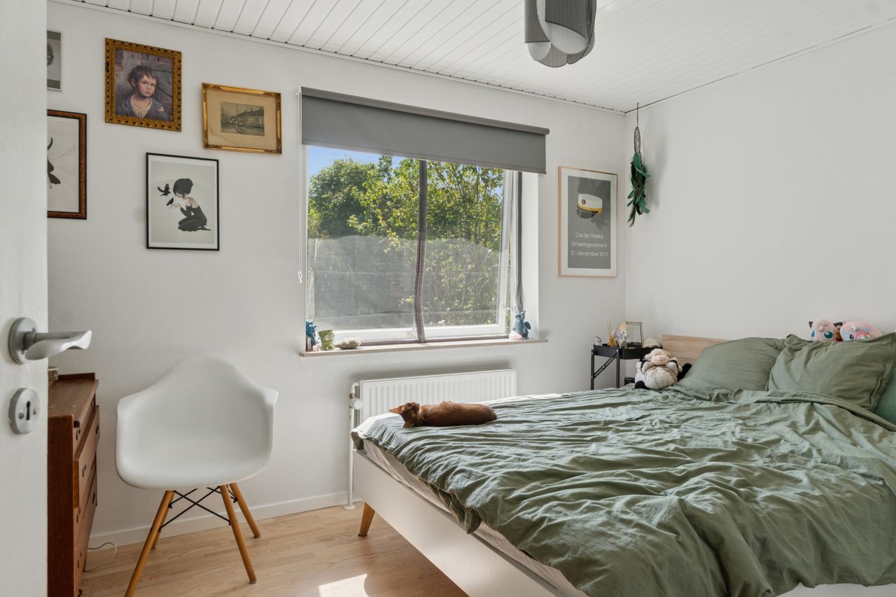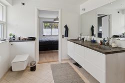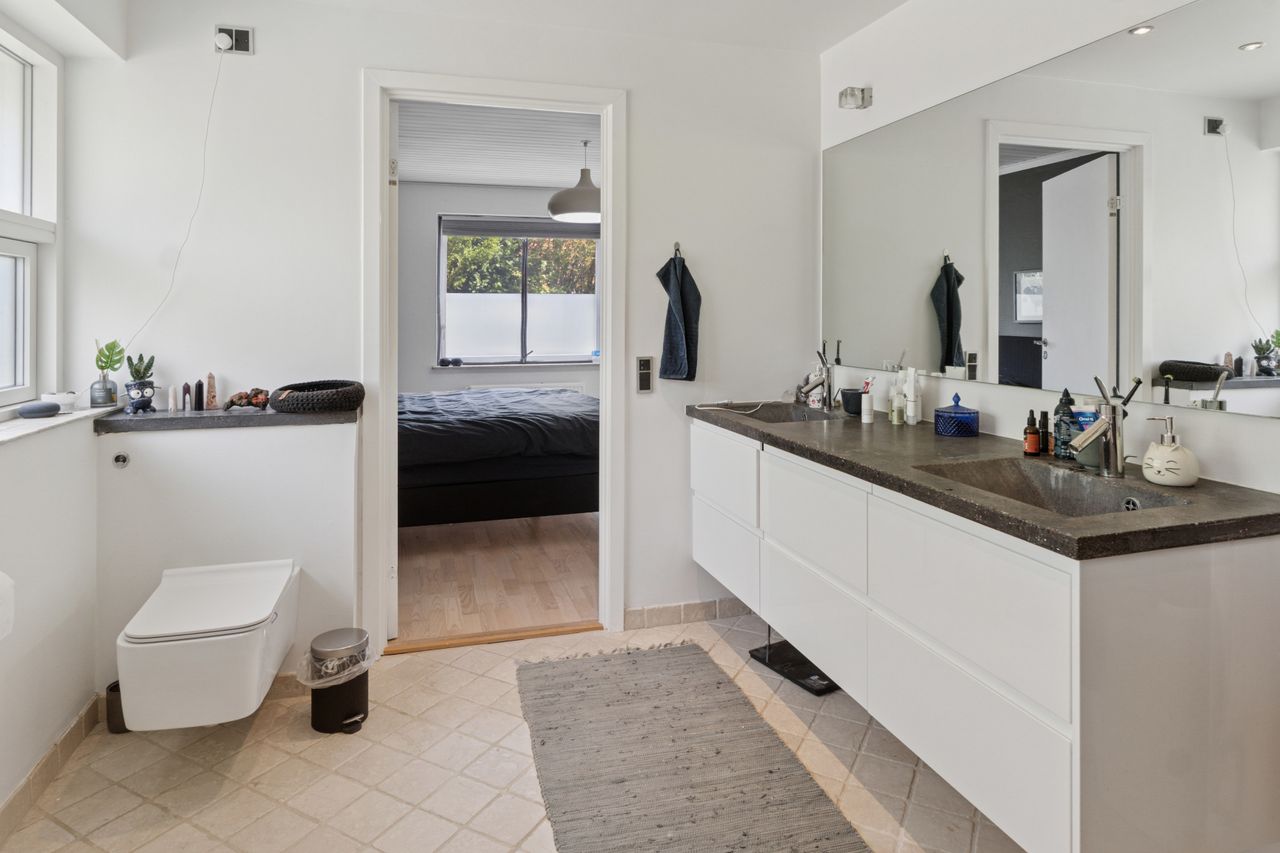 De fire værelser er placeret i en separat værelsesafdeling sammen med et badeværelse og et gæstetoilet. Det velholdte badeværelse har både muret bruseniche og nedsænket spabadekar samt dobbelt håndvask.