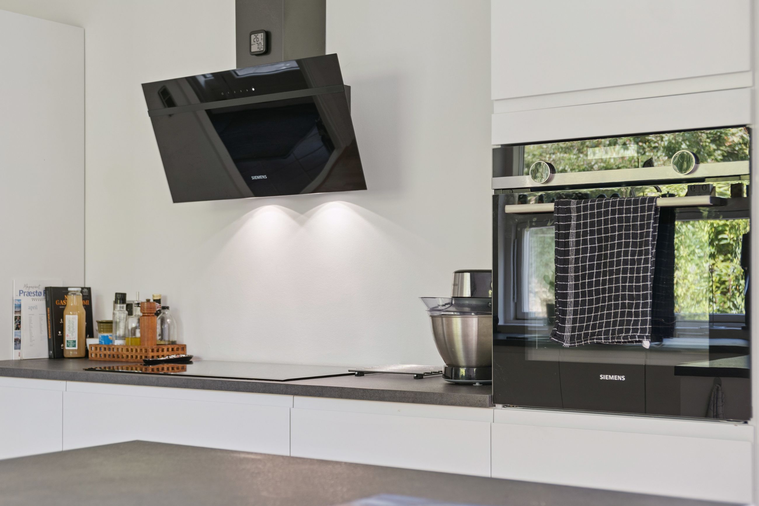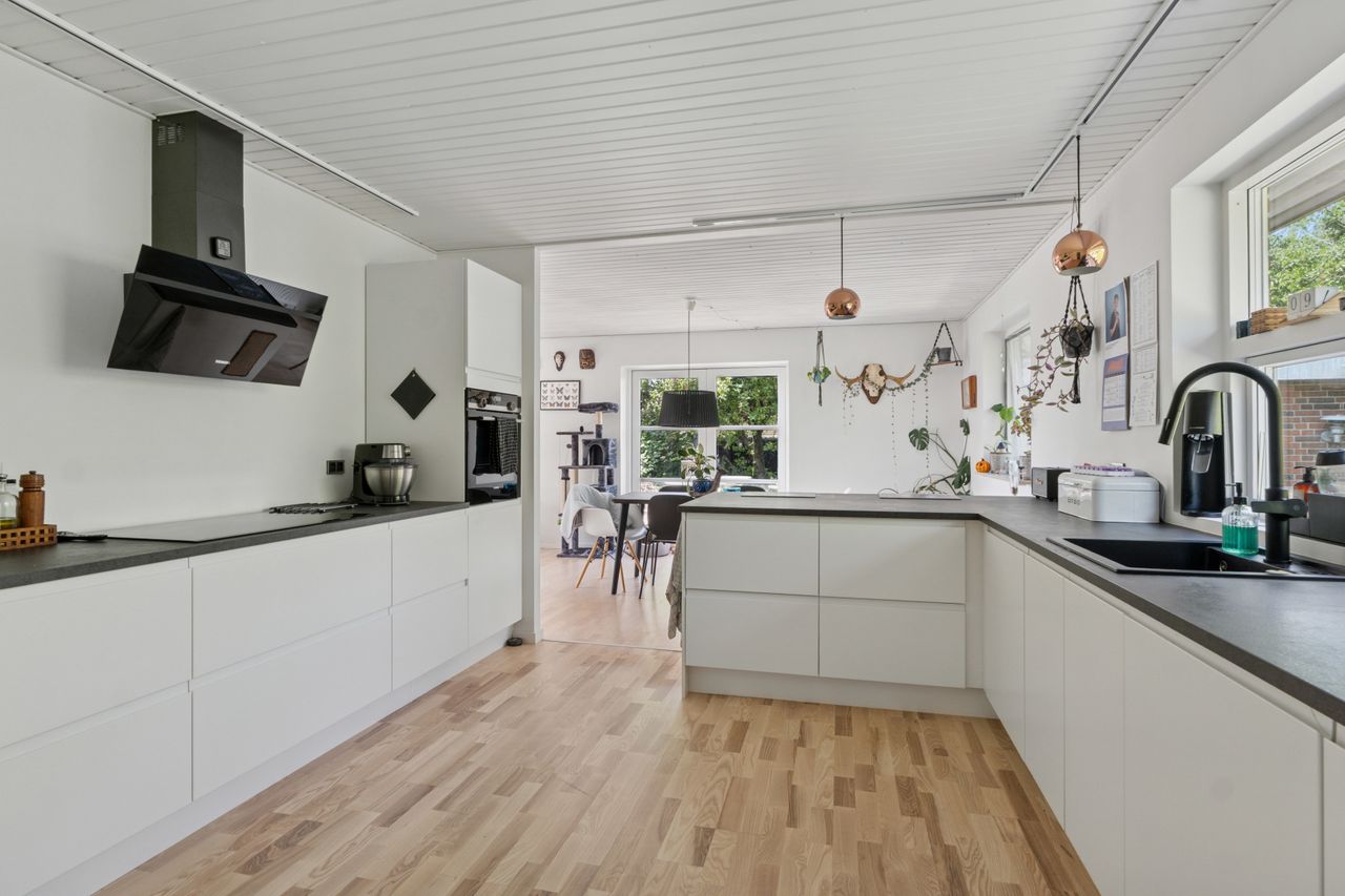 Det rummelige køkken er udført med grebsfrie, hvide elementer og integreret spisedisk. Køkkenet har god opbevarings- og arbejdsplads samt Siemens-hvidevarer fra 2024.
