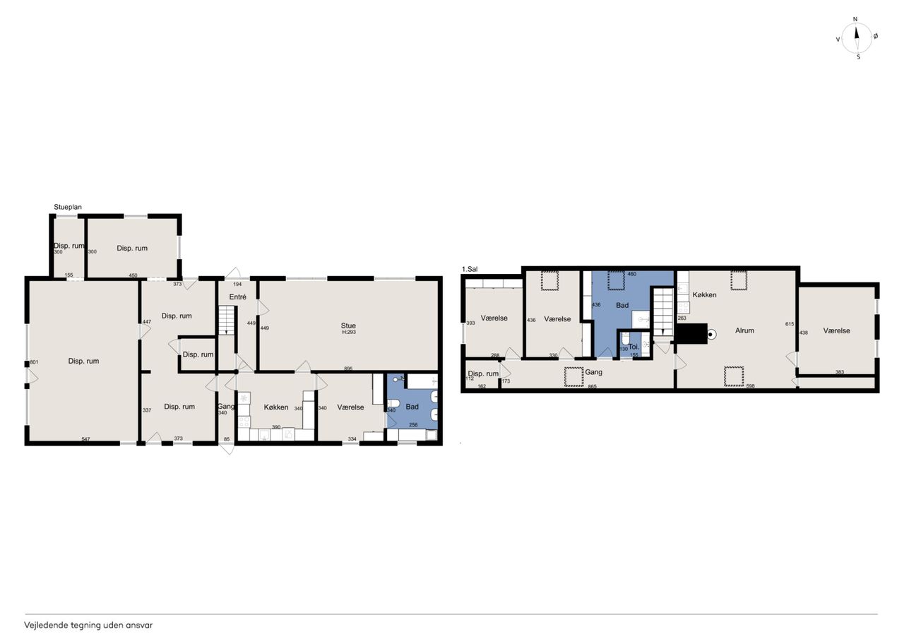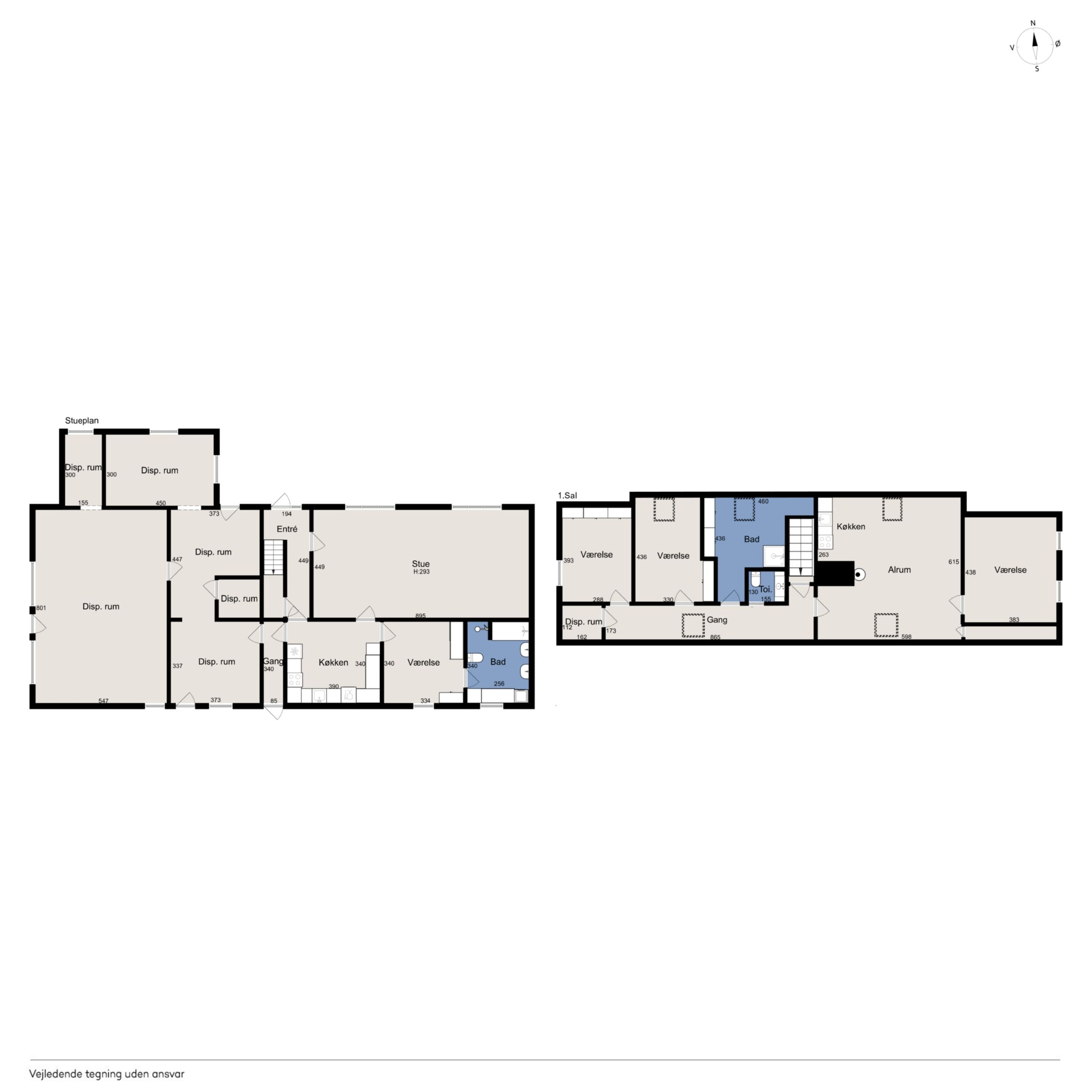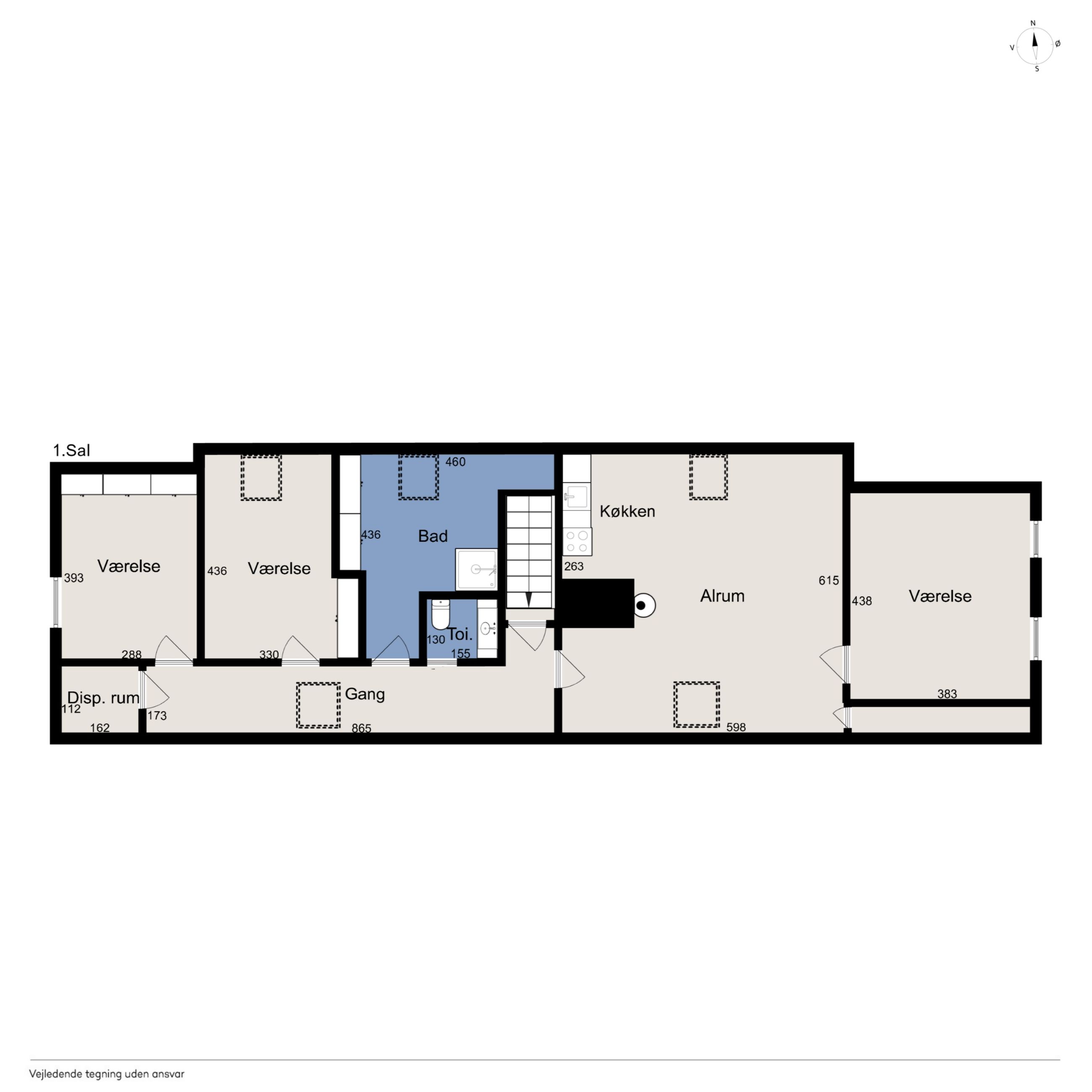 Boligen er indrettet med entré med fordeling til rummelig stue, spisekøkken, soveværelse med forbindelse til stort badeværelse. Dertil mellemgang med lille kælder erhvervslokalerne. 1. salen er indrettet med køkken alrum, soveværelse, toilet og rum med bruseniche samt to værelser mere. Her er gode muligheder for at lave en separat bolig.