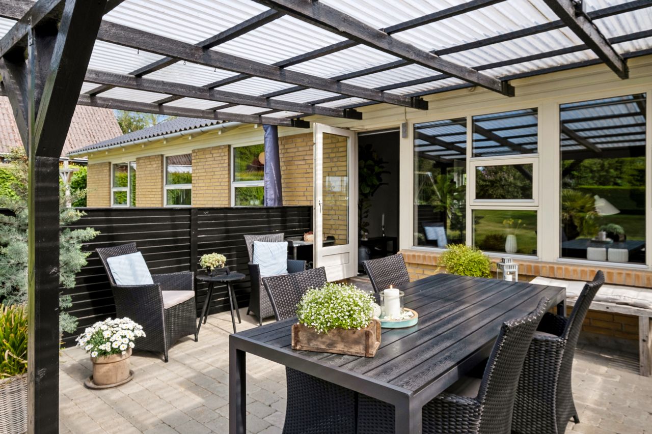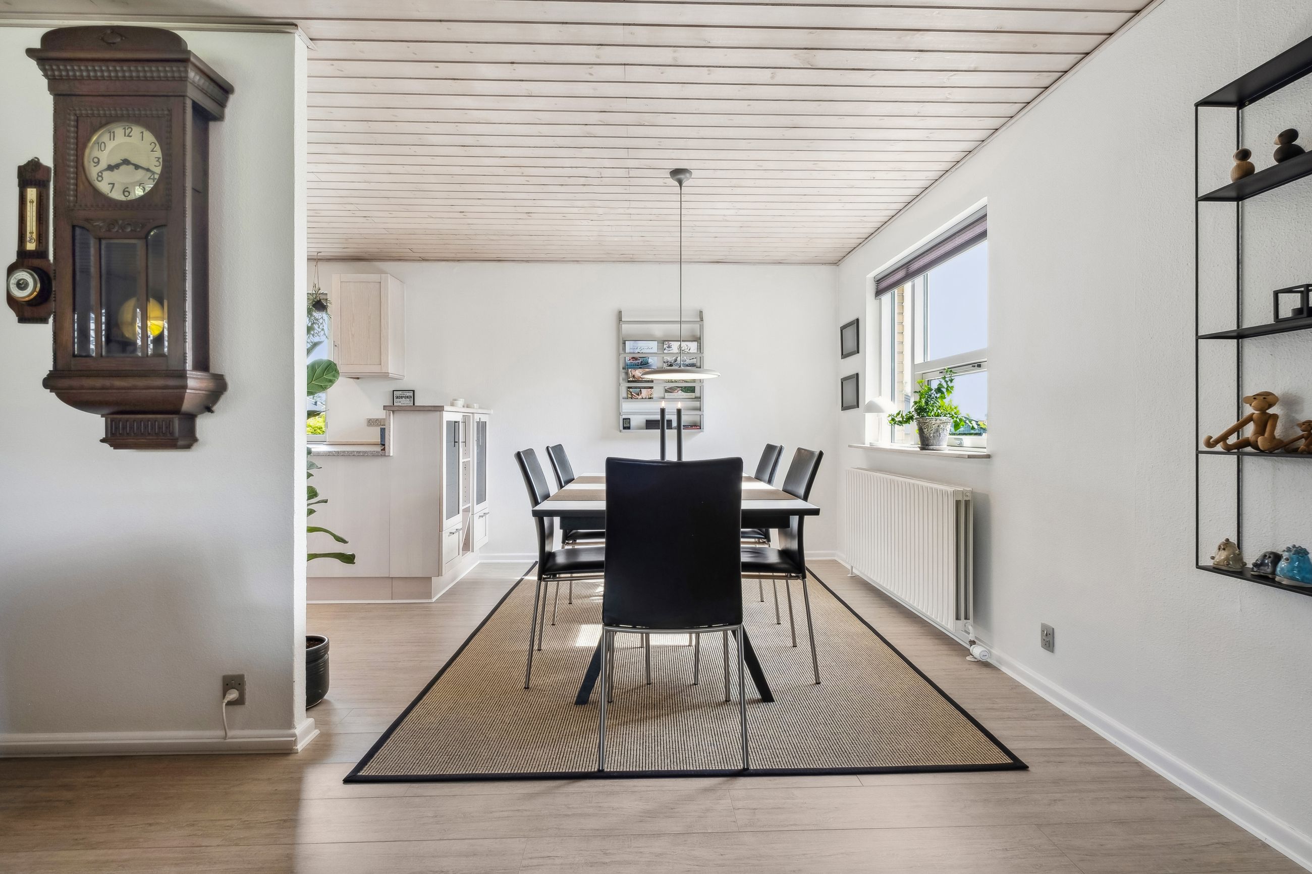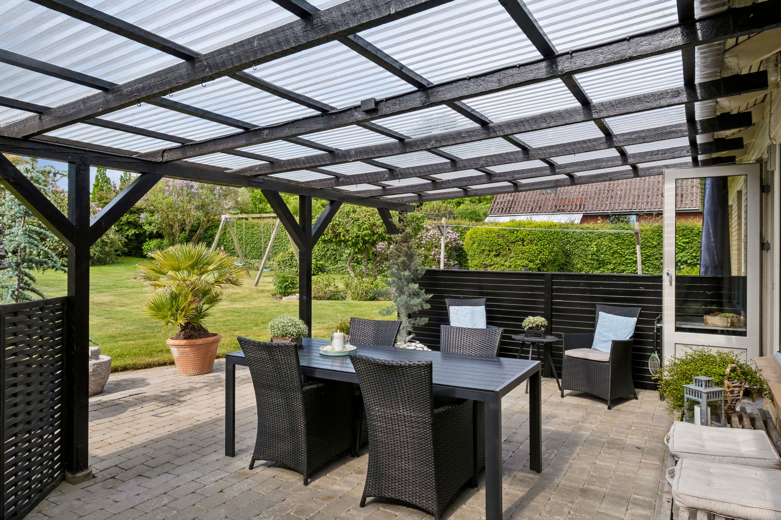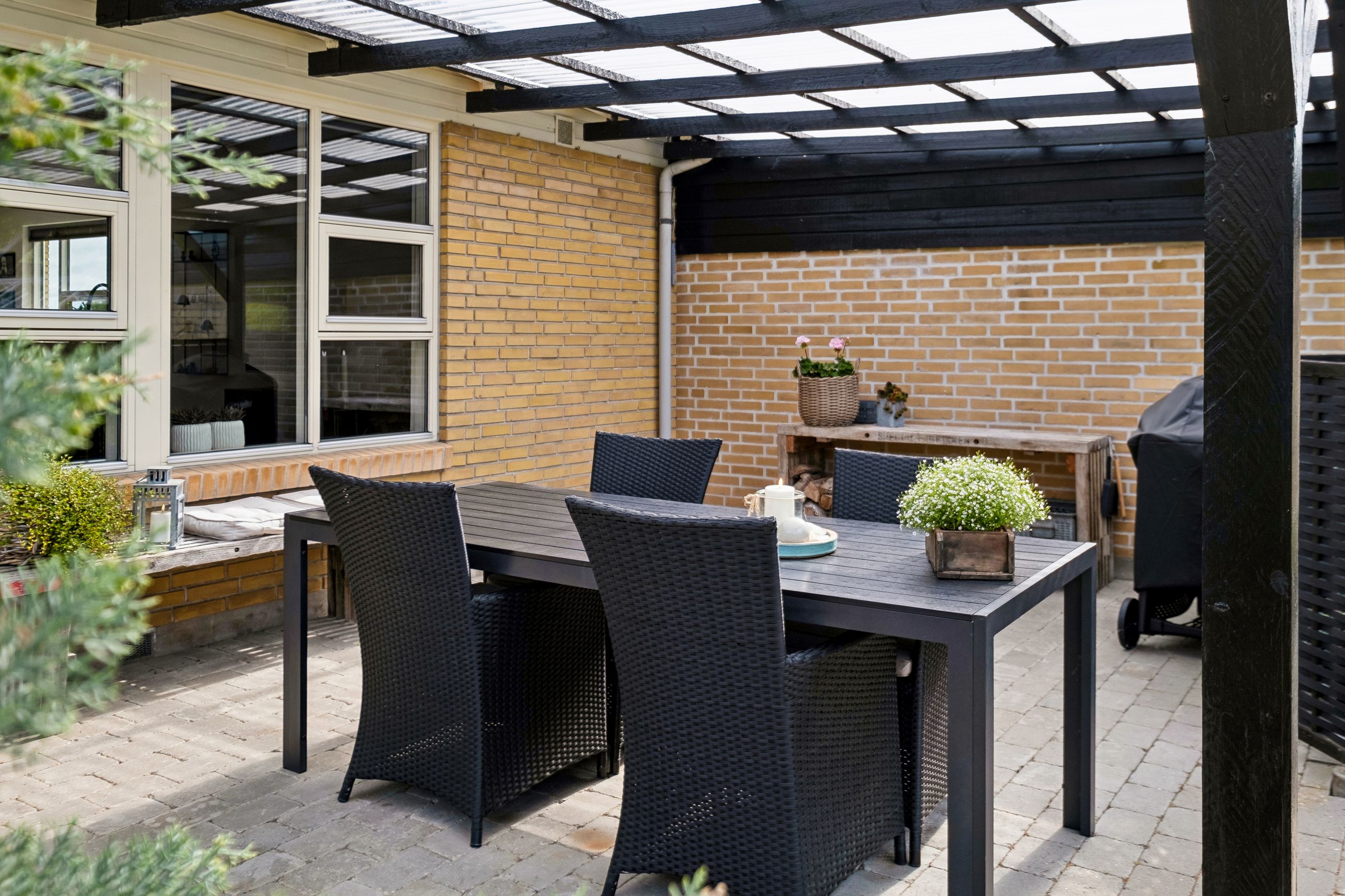 Køkkenet er designet i åben forbindelse med den lyse fleksible vinkelstue og byder på nyere laminatgulve, der tilføjer et stilfuldt touch til rummet. Herfra er der direkte adgang til en skøn sydvendt overdækket terrasse, hvor du kan nyde solrige dage eller hyggelige aftener uanset vejret.
