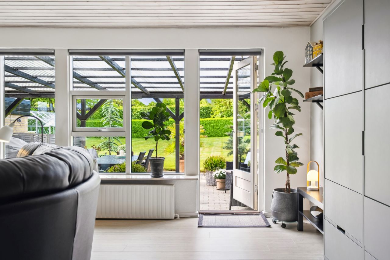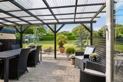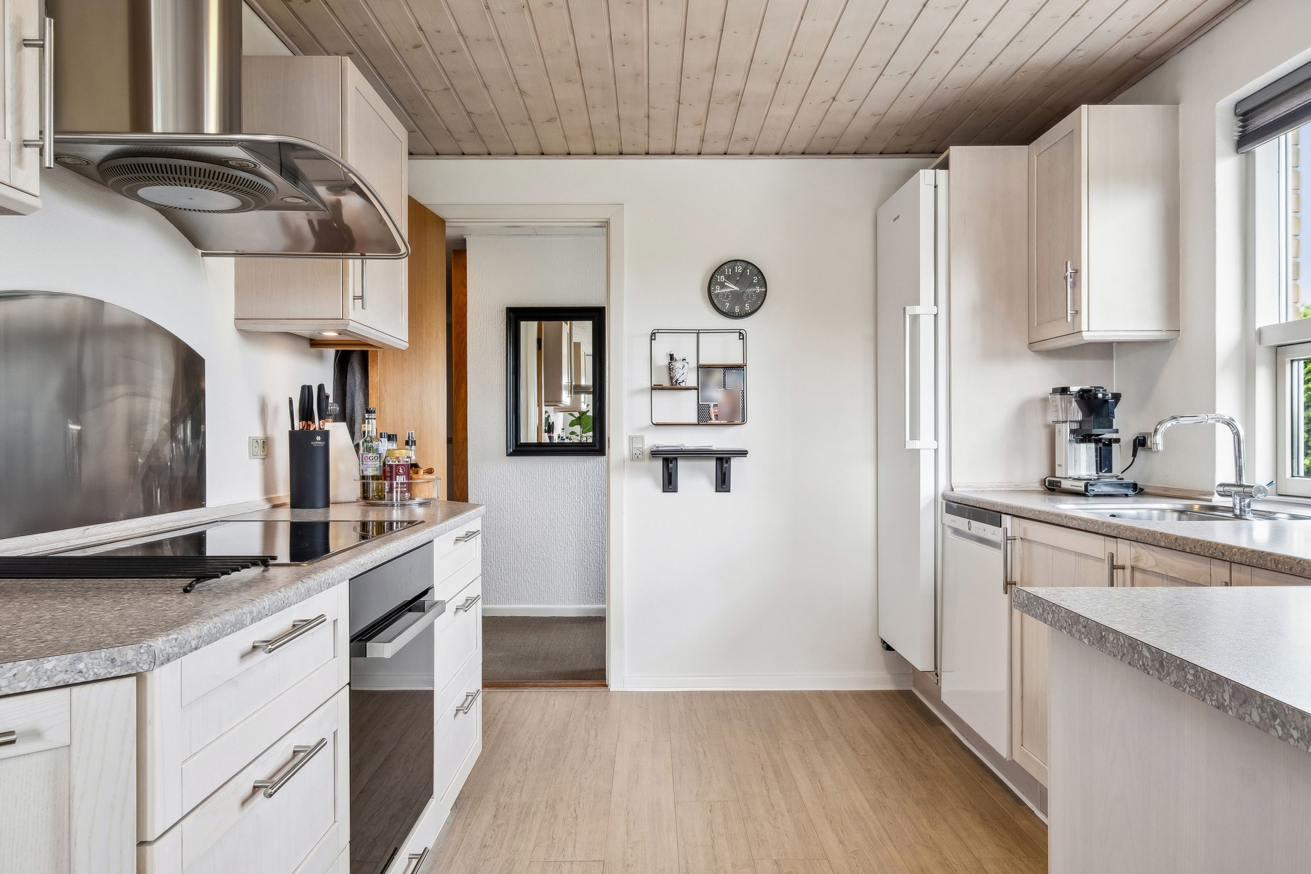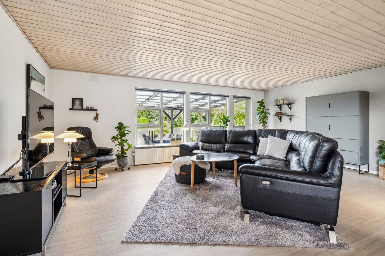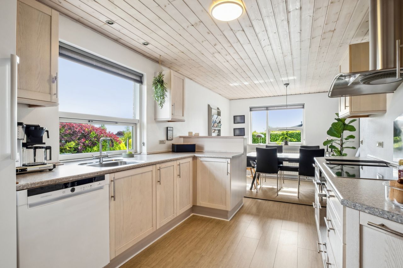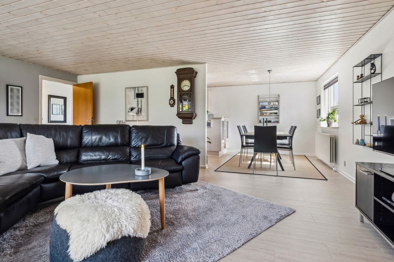 Køkkenet er designet i åben forbindelse med den lyse fleksible vinkelstue og byder på nyere laminatgulve, der tilføjer et stilfuldt touch til rummet. Herfra er der direkte adgang til en skøn sydvendt overdækket terrasse, hvor du kan nyde solrige dage eller hyggelige aftener uanset vejret.