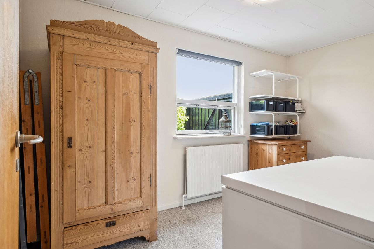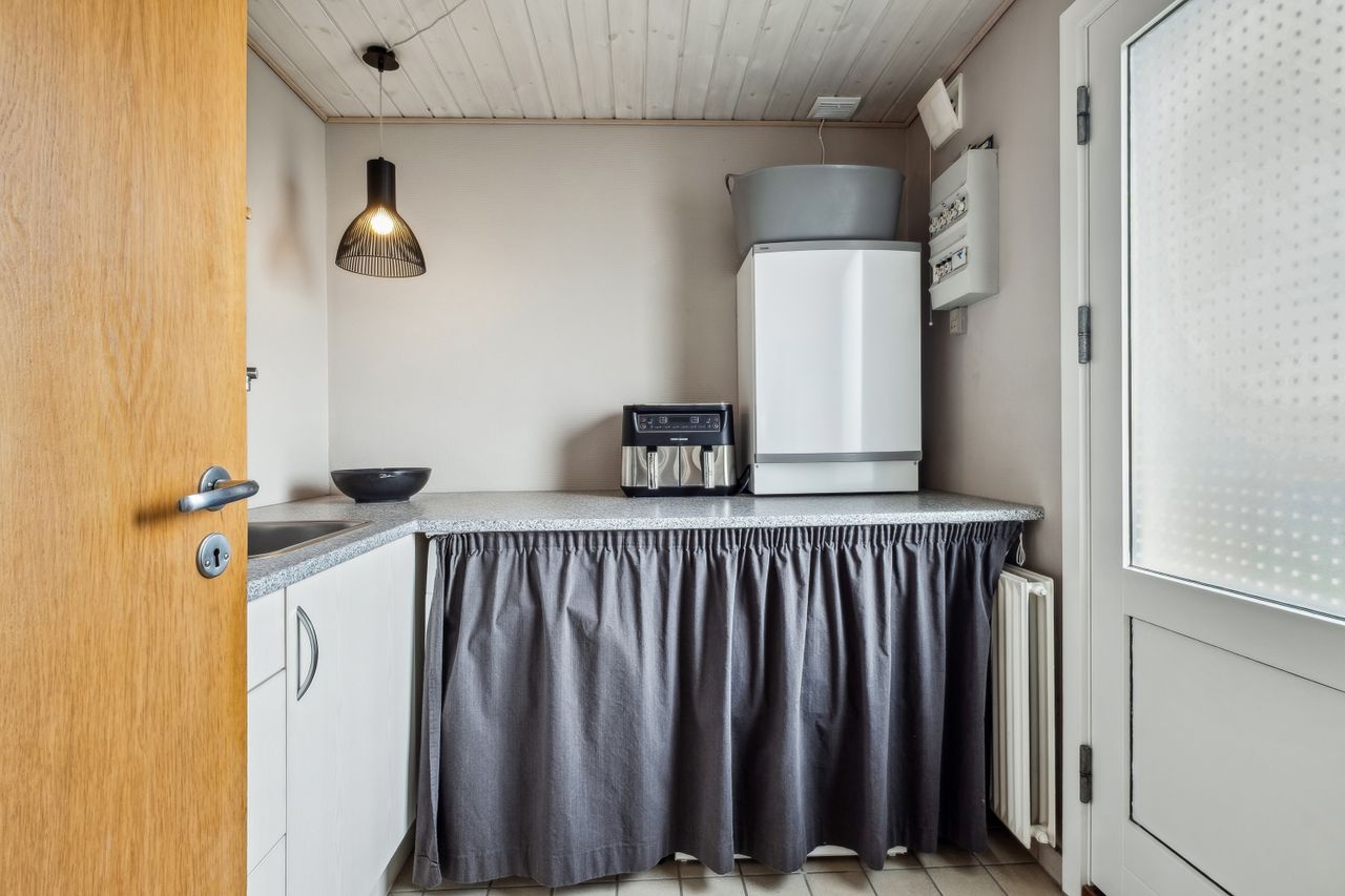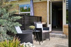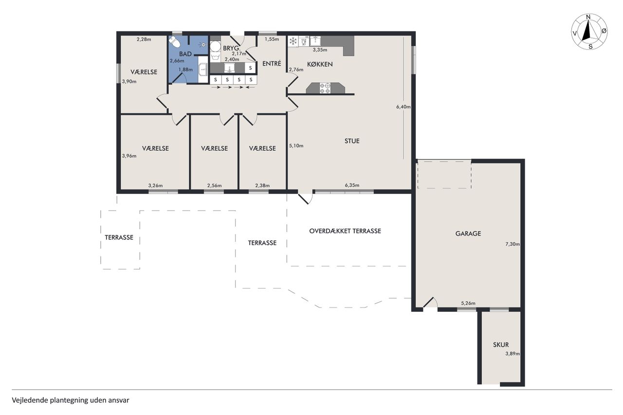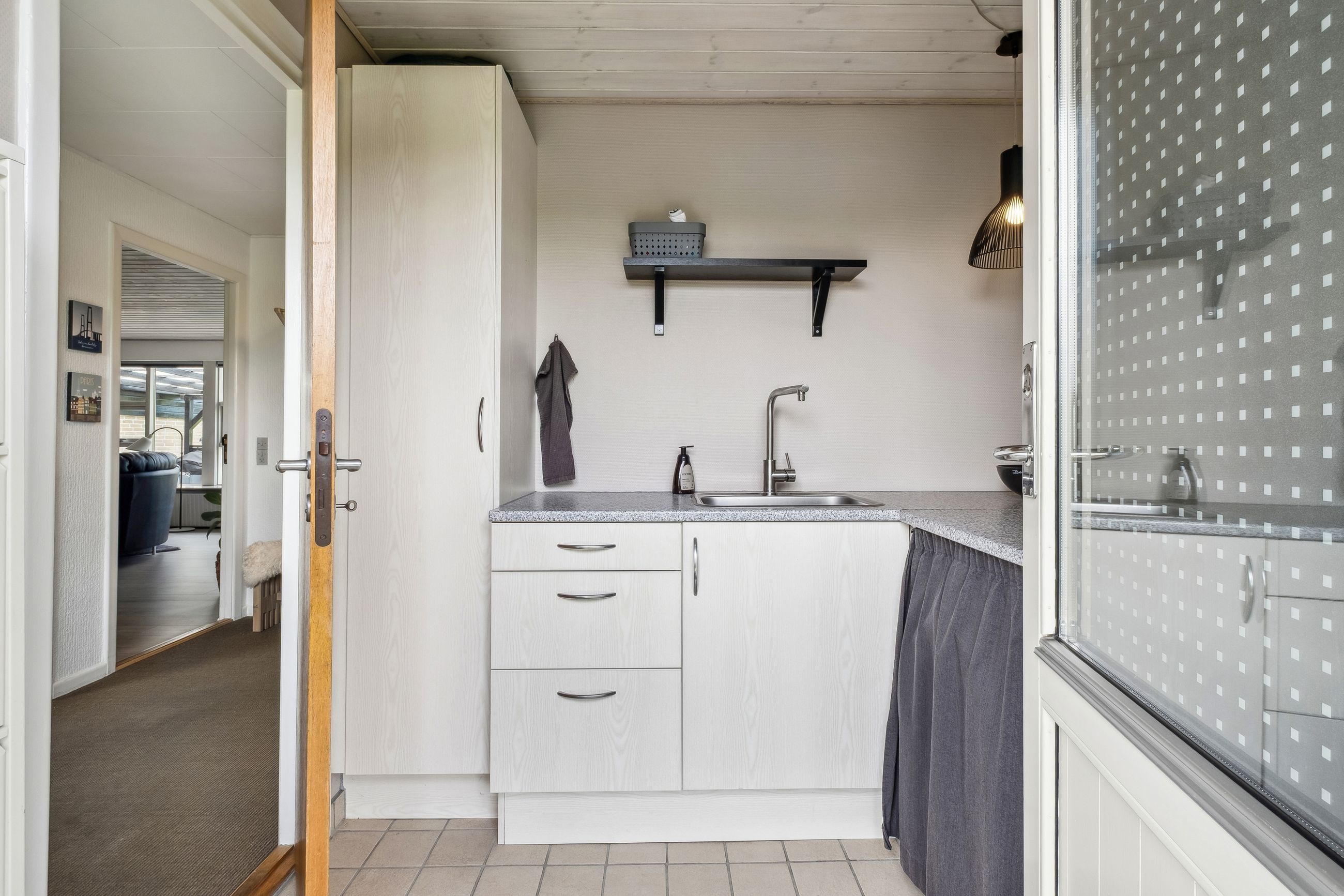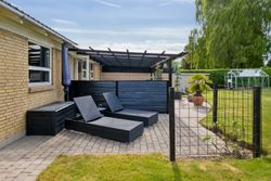 Køkkenet er designet i åben forbindelse med den lyse fleksible vinkelstue og byder på nyere laminatgulve, der tilføjer et stilfuldt touch til rummet. Herfra er der direkte adgang til en skøn sydvendt overdækket terrasse, hvor du kan nyde solrige dage eller hyggelige aftener uanset vejret.