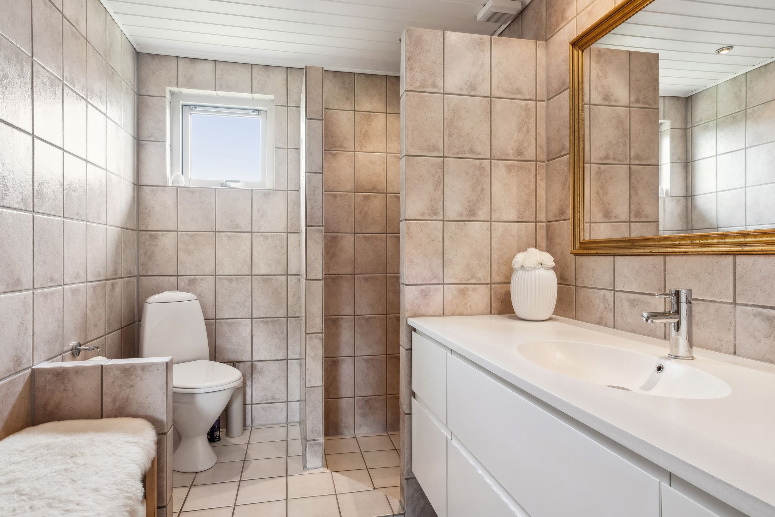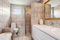 Det lyse badeværelse er udstyret med gulvvarme, hvilket sikrer en behagelig start på dagen. Taget er renset og malet, der er eternit på gavlene og flere facader er omfuget. Der er separeret kloaksystem og installeret fjernvarme.