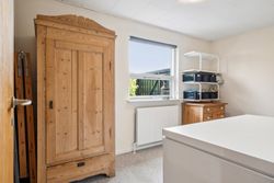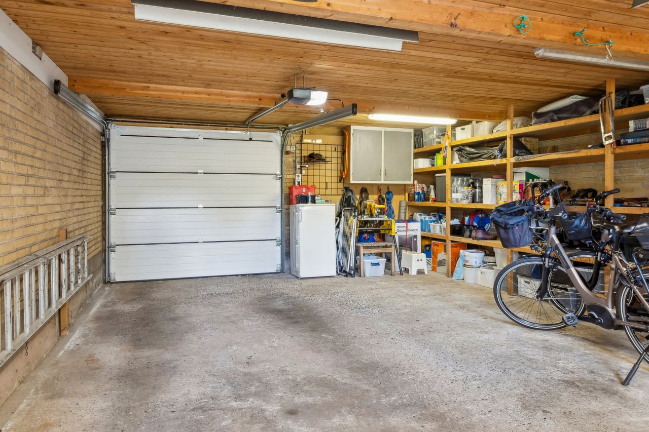 Ejendommen inkluderer også en imponerende 46 m2 muret dobbelt garage med nyere elport, som giver rigelig plads til både biler og opbevaring af diverse ejendele.