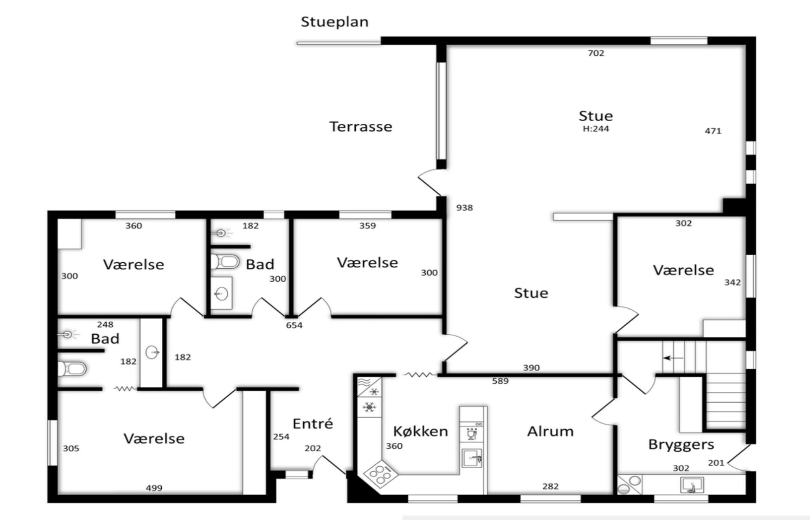 Stueetagen er inddelt i en soveafdeling med tre værelser, hvoraf det ene har eget badeværelse. De to øvrige værelser deler et ekstra badeværelse. Husets hjertet er den rummelige stue, hvor der er plads til både hyggelig TV-stue, hyggekrog og et stort spisebord – perfekt til gæster. Køkkenet kan evt. åbnes i forbindelse med stuen, såfremt man ønsker et mere åbent miljø.