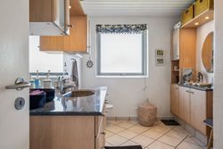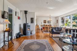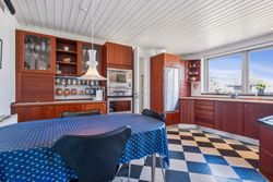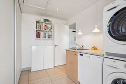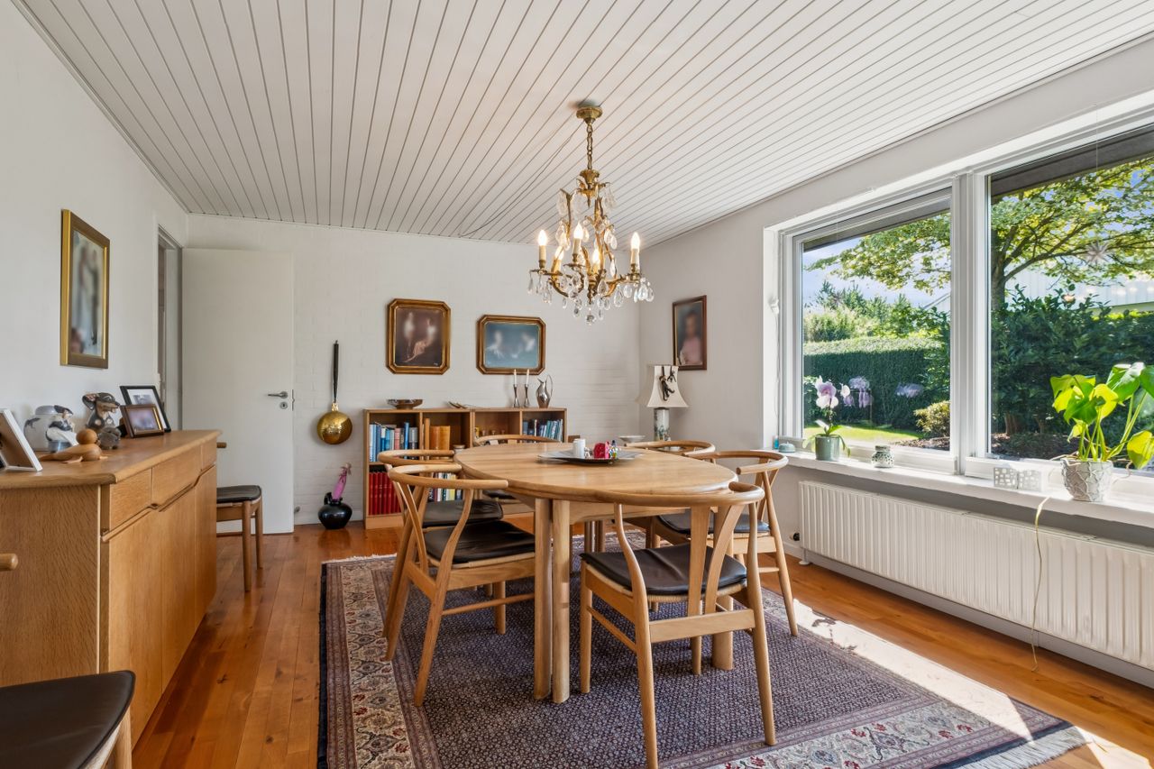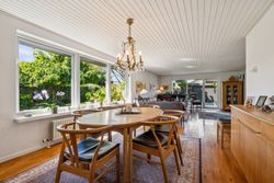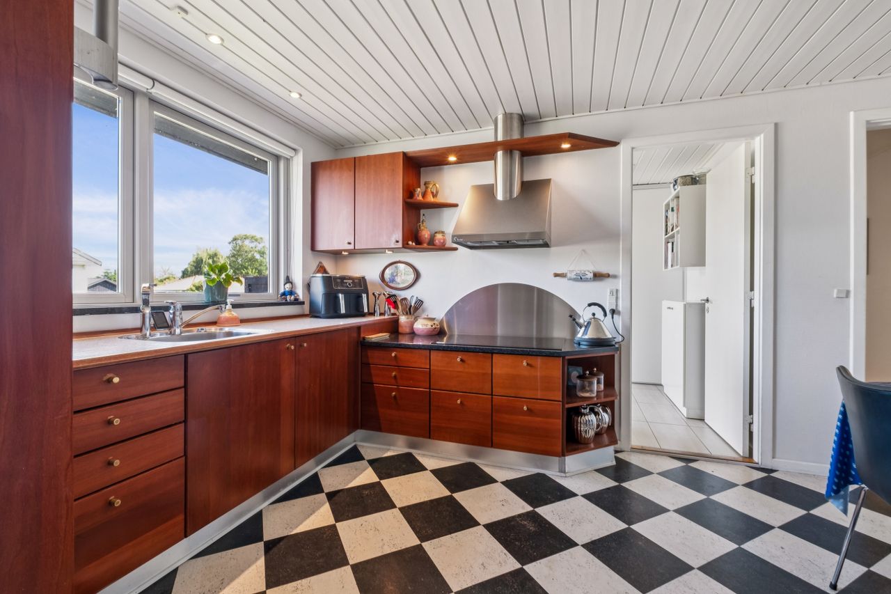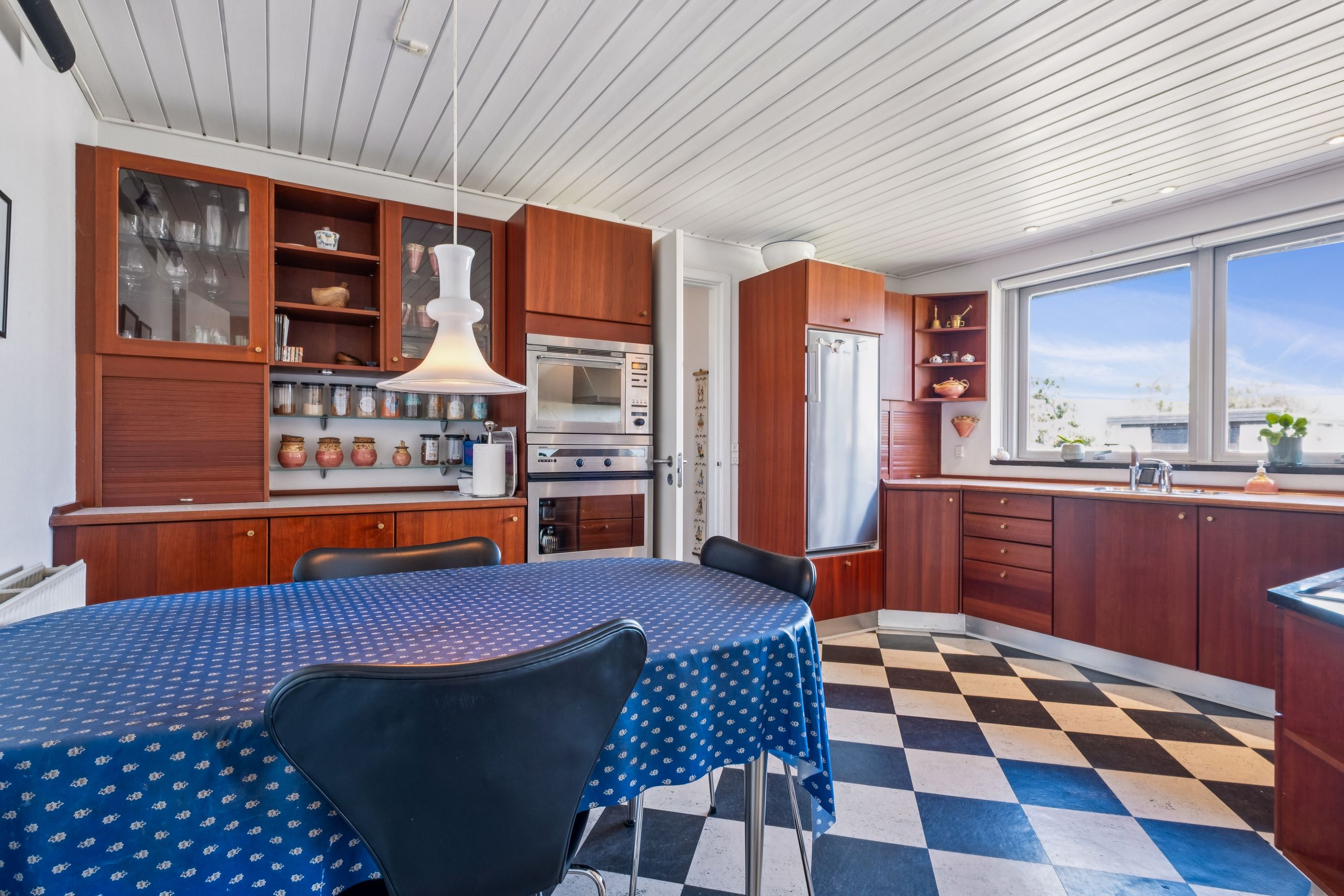 Vi byder indenfor igennem et bryggers der er komplet renoveret med gulvvarme i 2021. Her er den nyere fjernvarmeinstallation bag skabet. Rummelig spisekøkken fra Svane med god skabsplads. Her med mulighed for at åbne op til den store stue hvis ønsket.