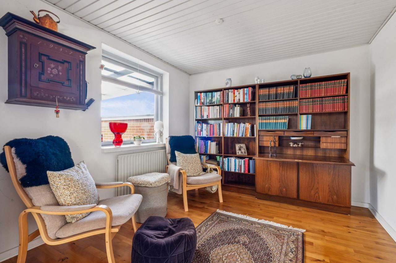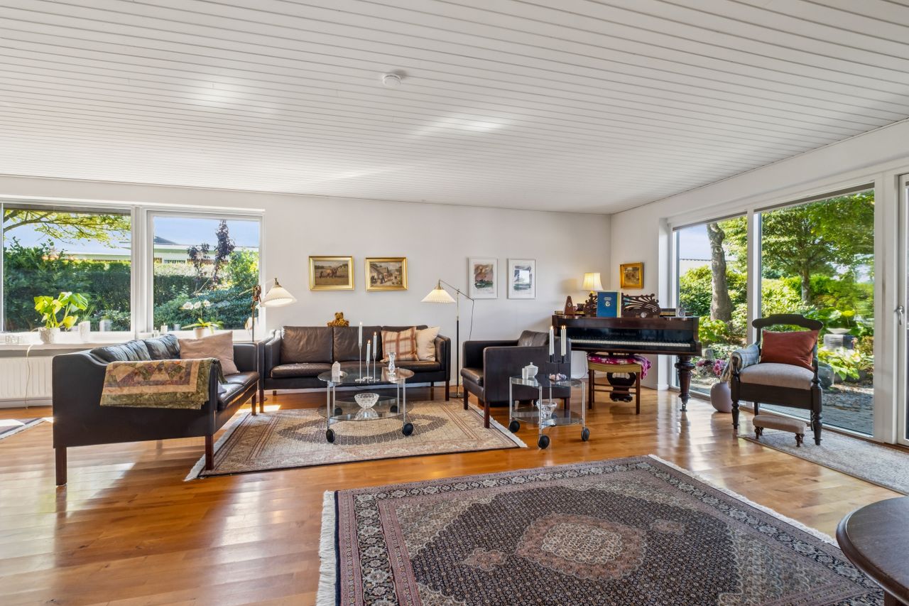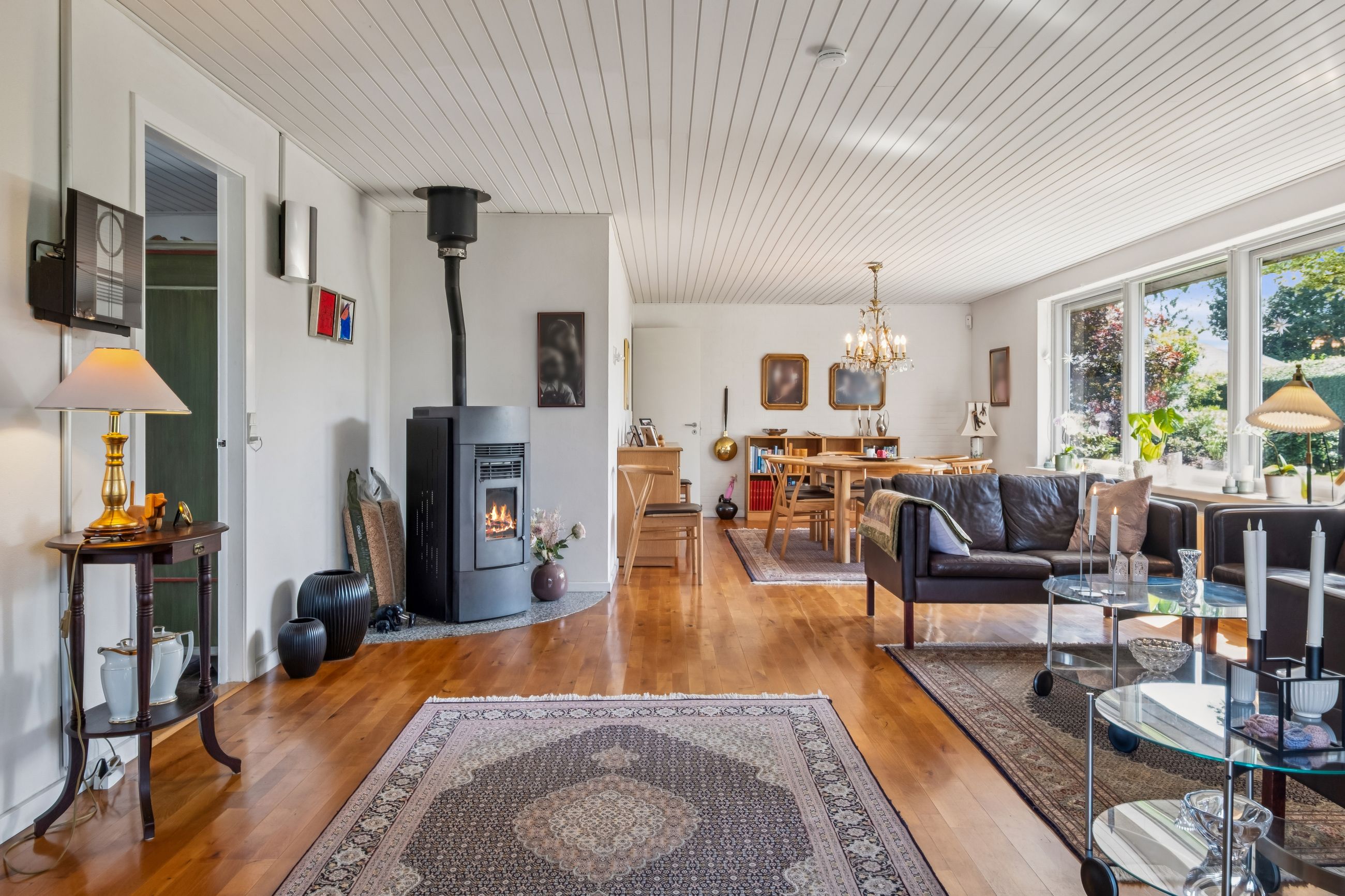 Stor vinkelstue med pillebrændeovn og med udgang til den fine overdækkede terrasse.