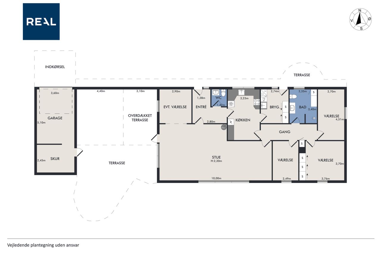 Selve villaen fremstår rummelig med en god planløsning. Specielt på størrelsen af værelserne, har der været ekstra fokus på for at skabe mere rum. Villaen har også en let mulighed for etablere endnu et værelse - se plantegningen.