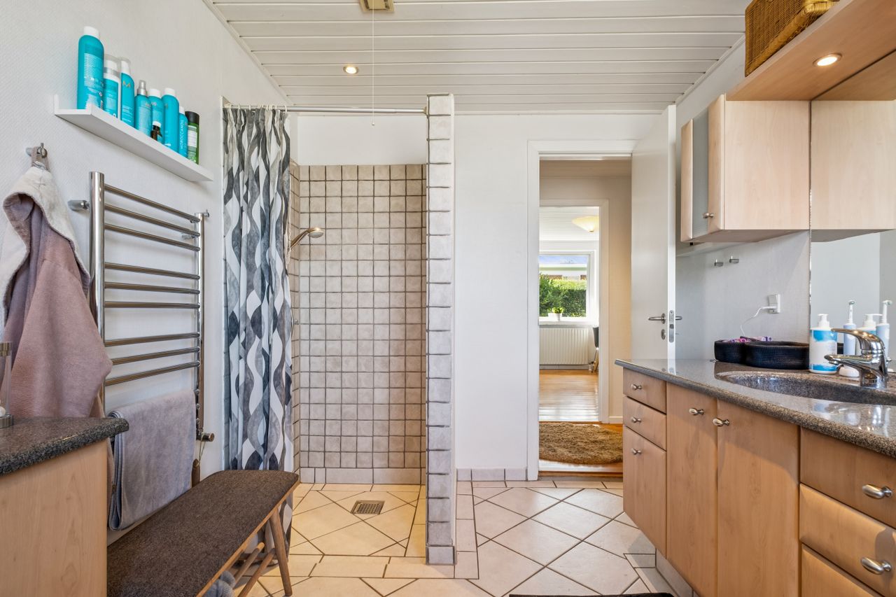 Badeværelse fra 2007 med lyse klinker, bruseniche og gulvvarme